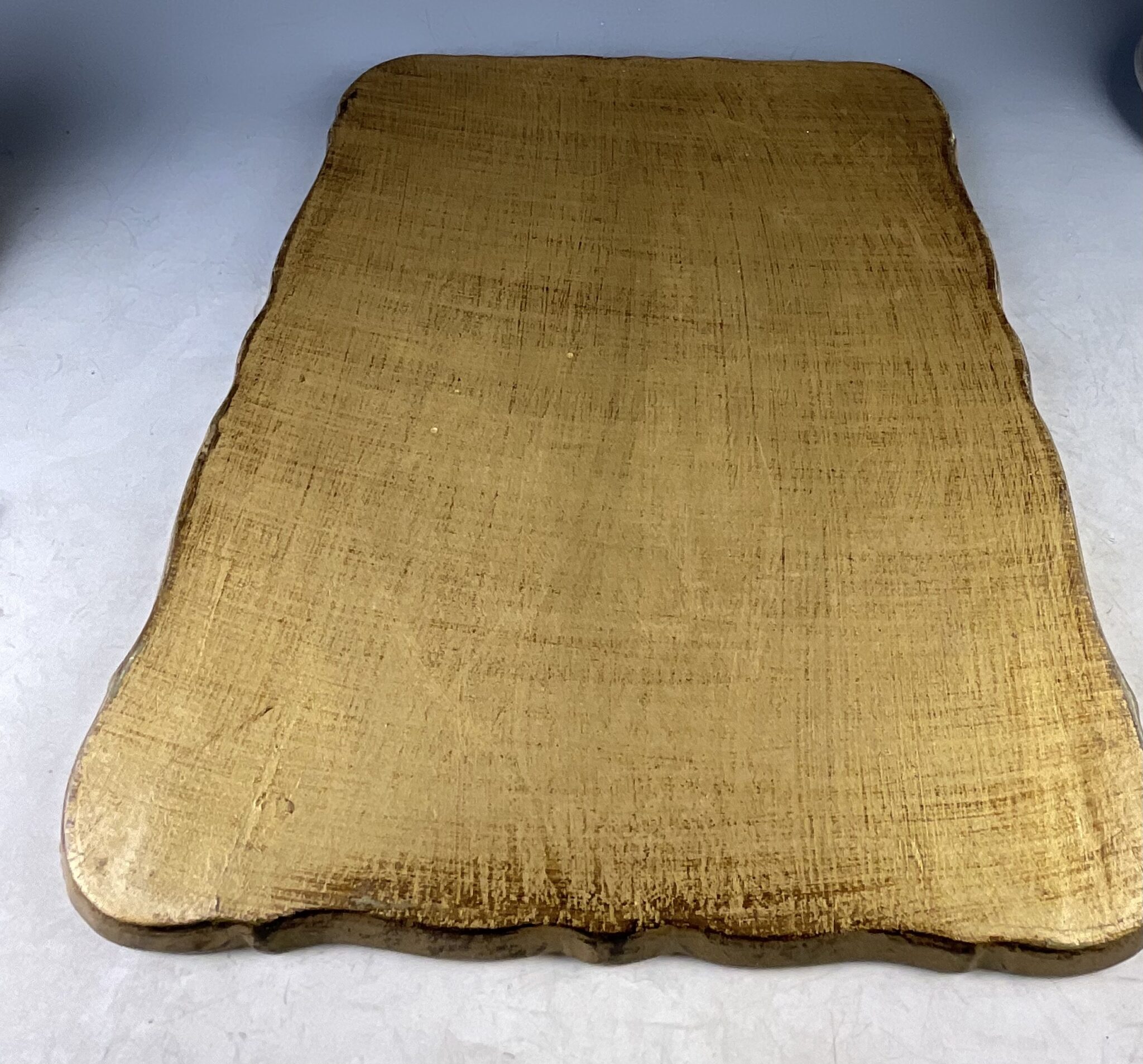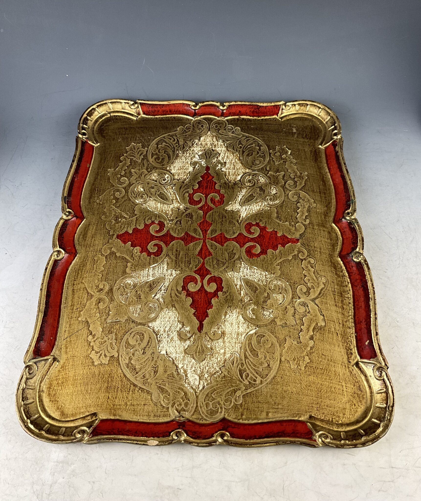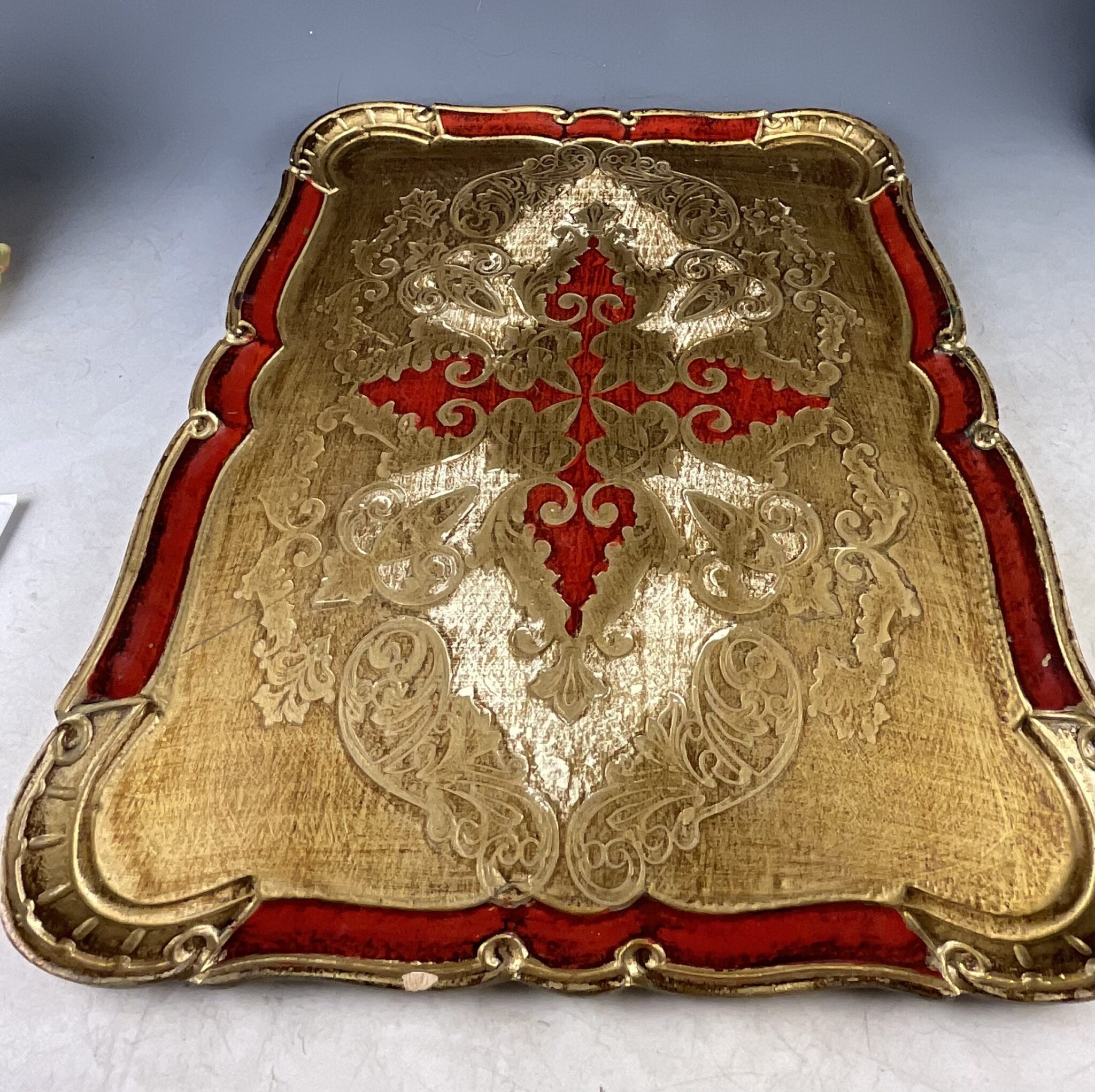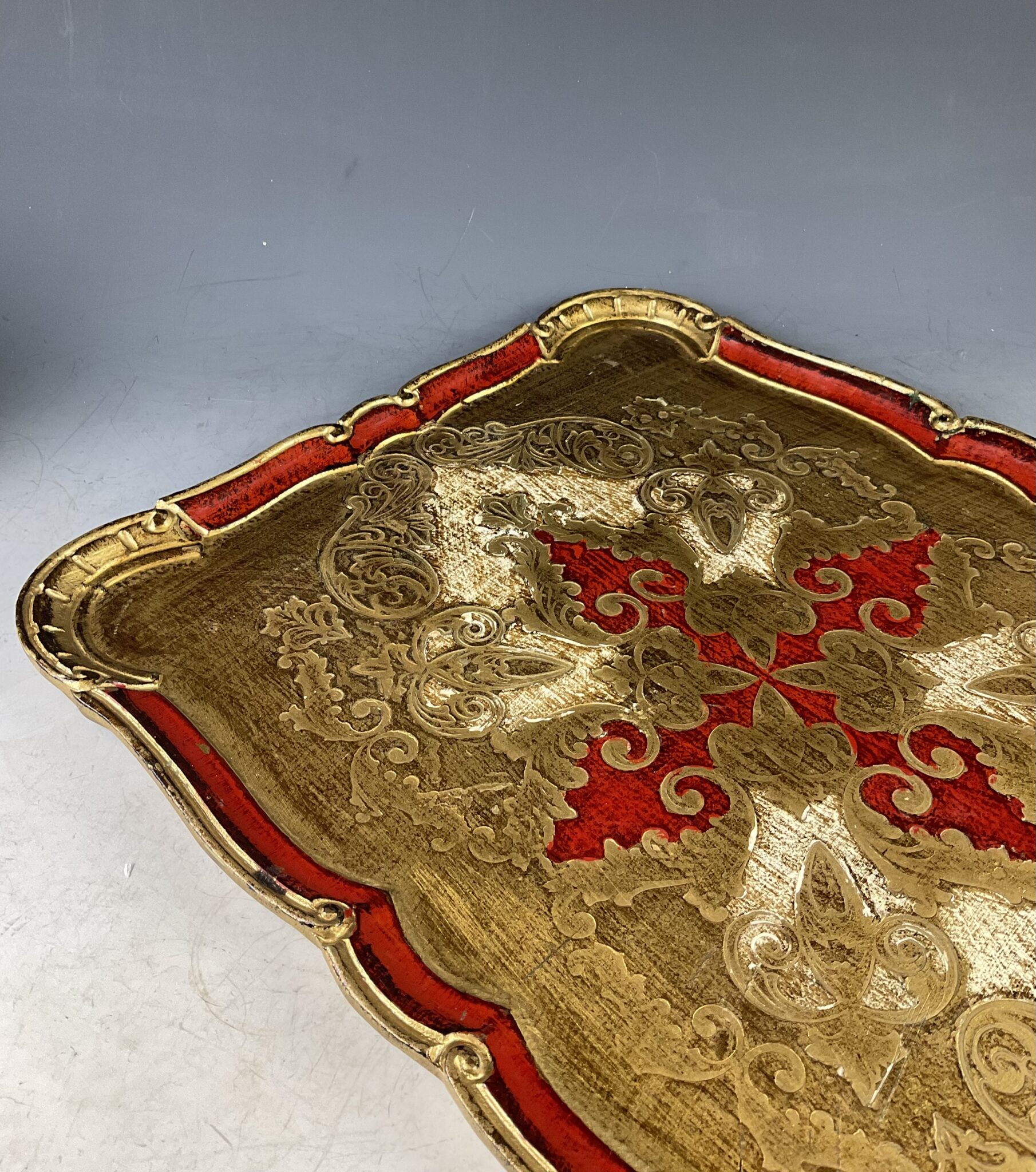 Holz, rot lackiert und vergoldet, rechteckiges Tablett mit geschwungener Fahne, ungemarkt, tadelloser Erhaltungszustand