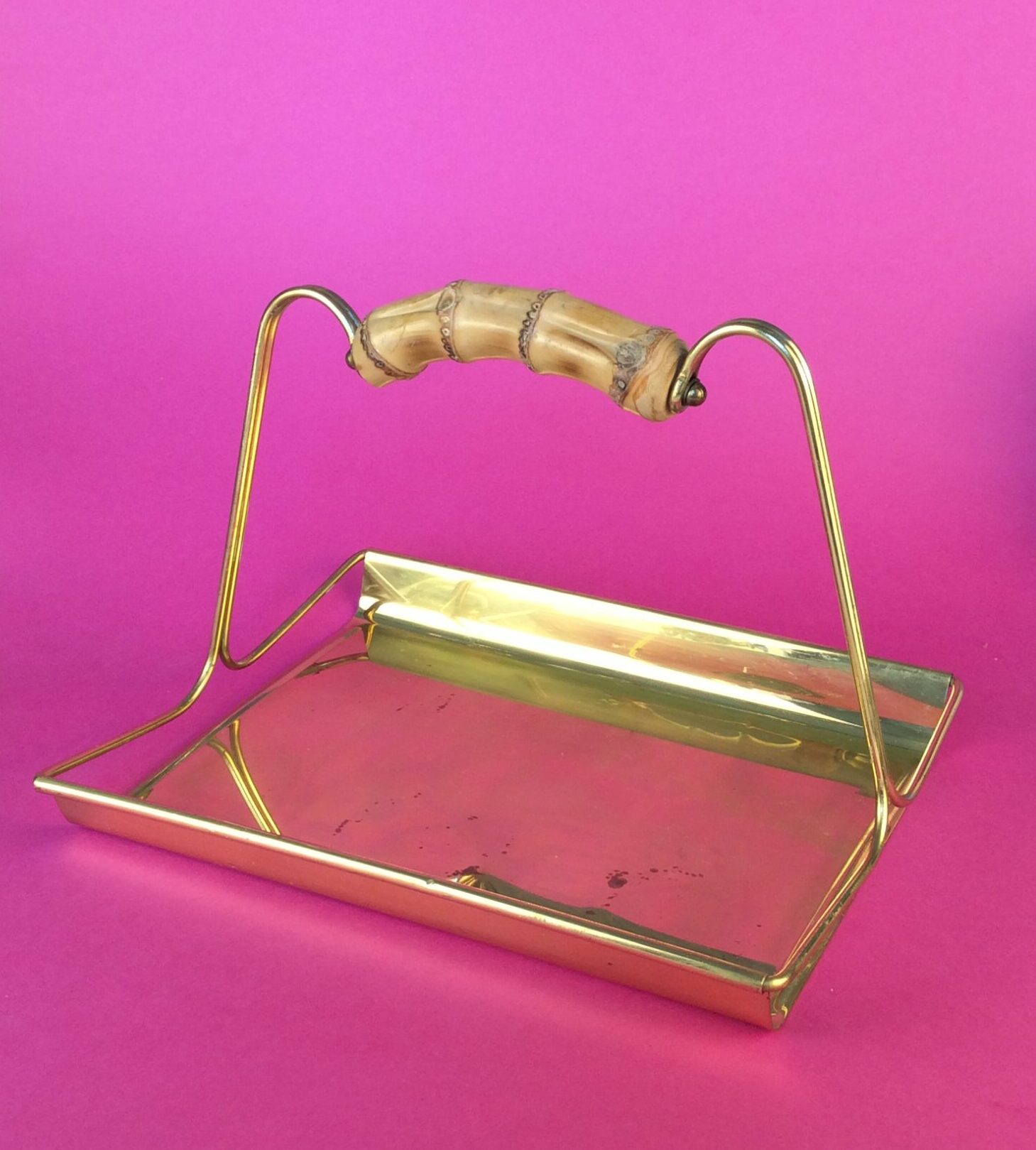 Messing, rechteckige Grundform mit Henkel, Griff aus natürlichem Bambus, gemarkt mit Firmenmarke Grasoli