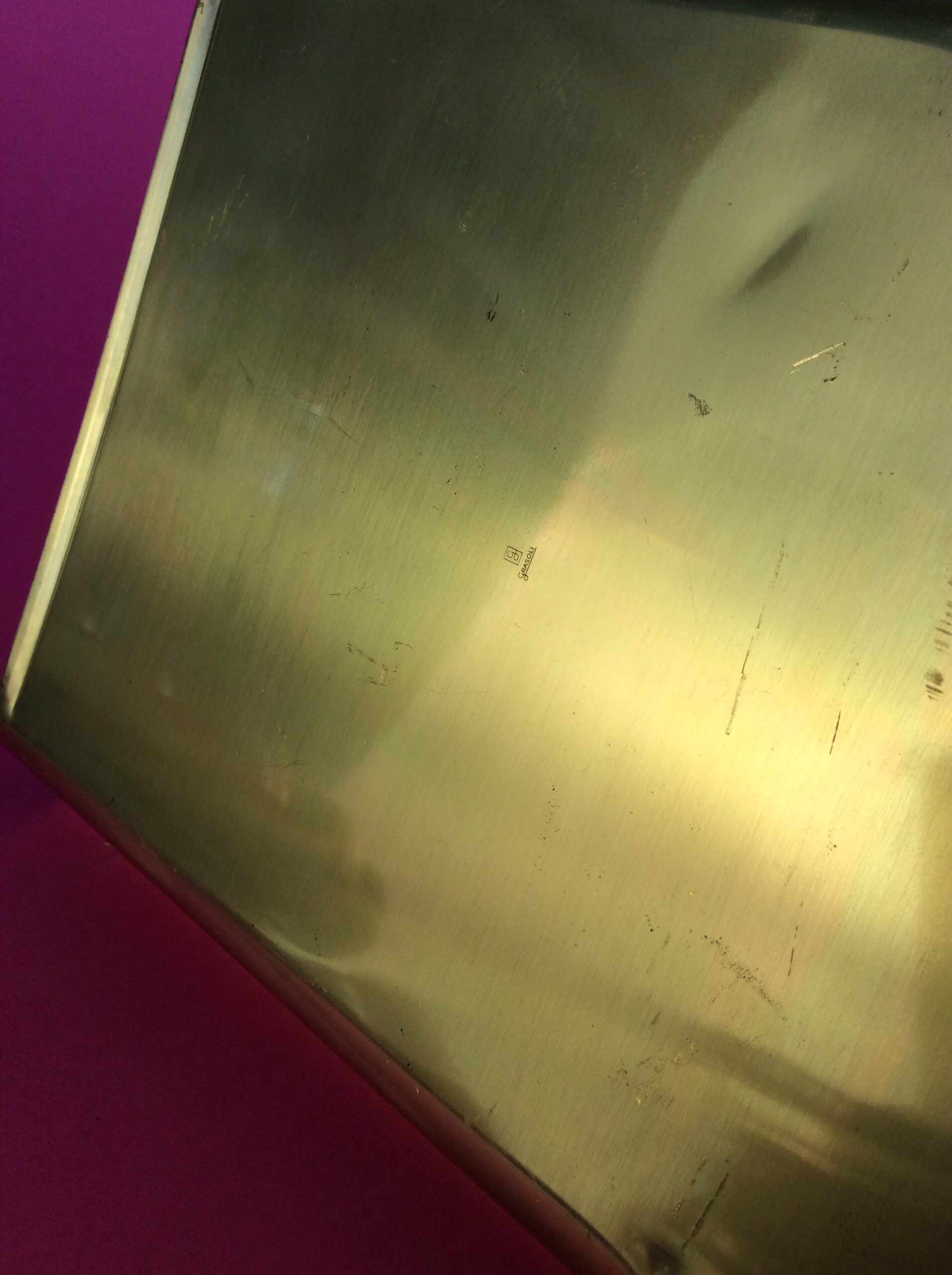 Annettes Etikette: Die Wortmarke „Grasoli“ geht auf die ursprünglichen Eigentümer, die Gebrüder Grah vom Odysseuswerk in Solingen zurück. Die Firma wurde 1919 gegründet und war auf Produkte der Tafelkultur spezialisiert. 1981 übernahm die Firma Carl Mertens das Unternehmen. Die 50ties Mode der Bambushenkeln beobachten wir ebenso bei Gucci Handtaschen wie auch bei Obstmessern oder diesem gelungenen Tablett.