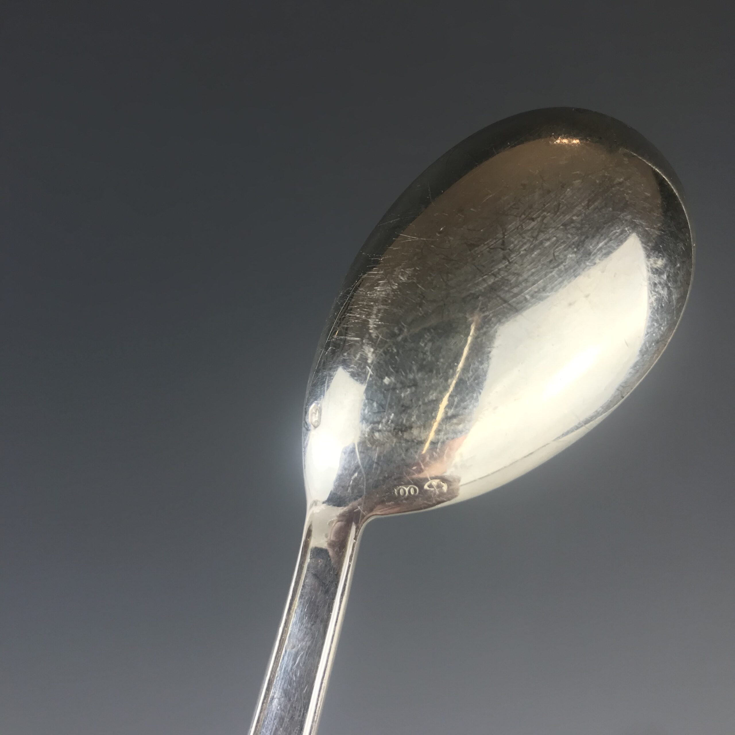 Silber, Facon „Faden“, Laffe mundgerecht ausgerichtet, gemarkt mit Wiener Tukankopfpunze, verwendet nach 1922, Firmenzeichen Kleeblatt, Feingehaltszeichen 800, handpolierter Erhaltungszustand