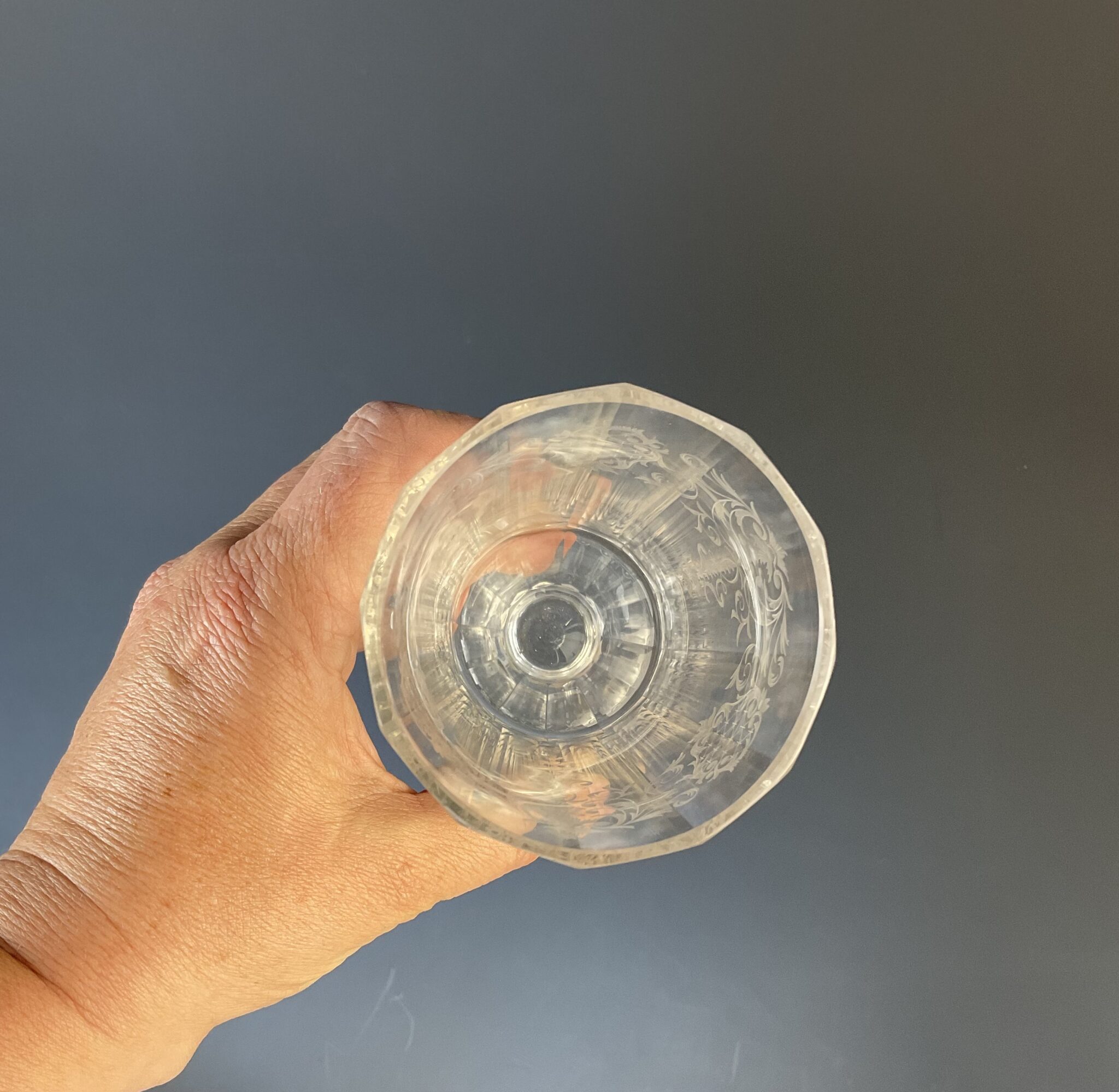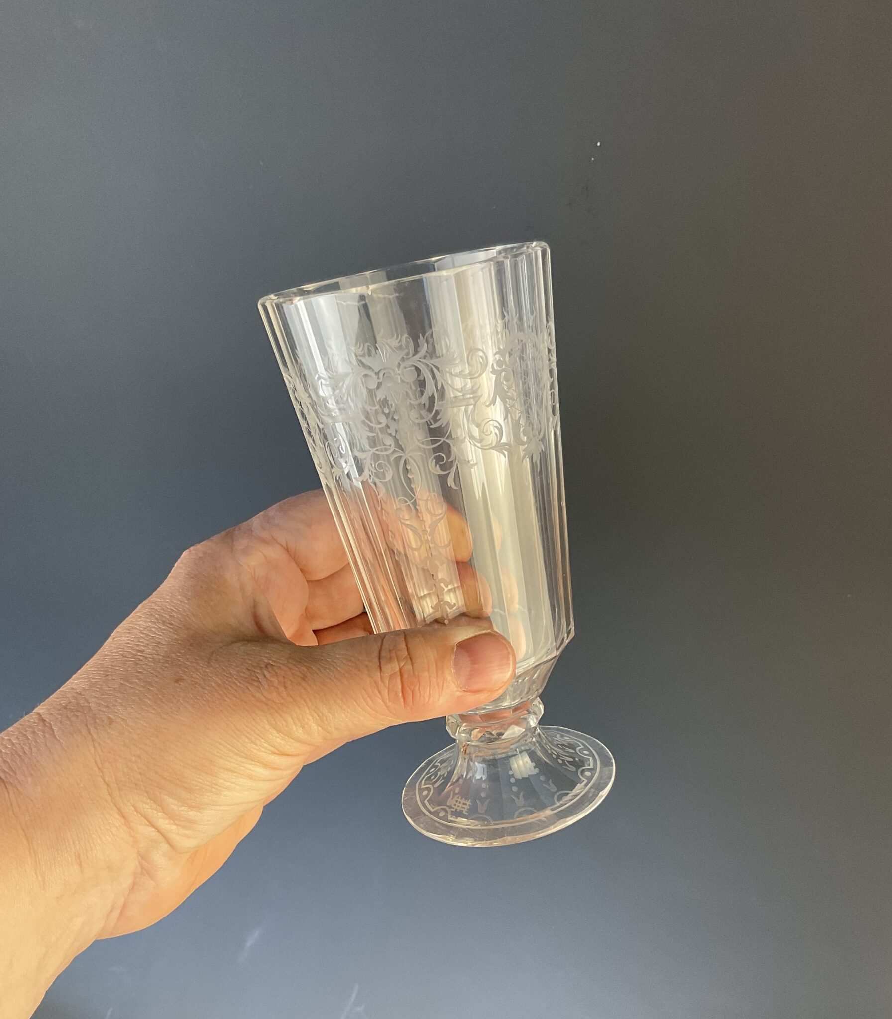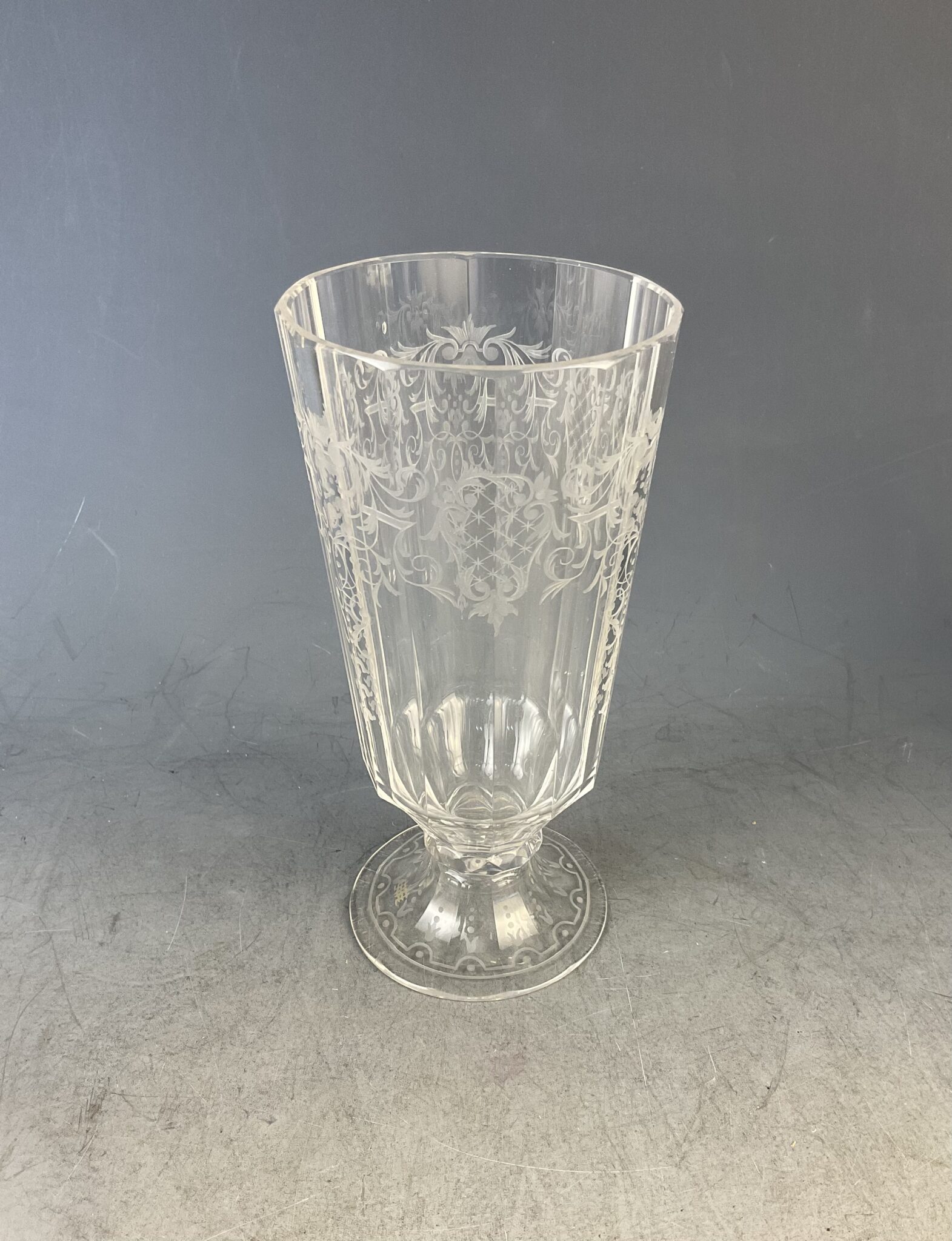 Mundgeblasenes, farbloses Kristallglas, Schälen- und Flächenschliff, reiche Kupferradgravur, signiert, tadelloser Erhaltungszustand