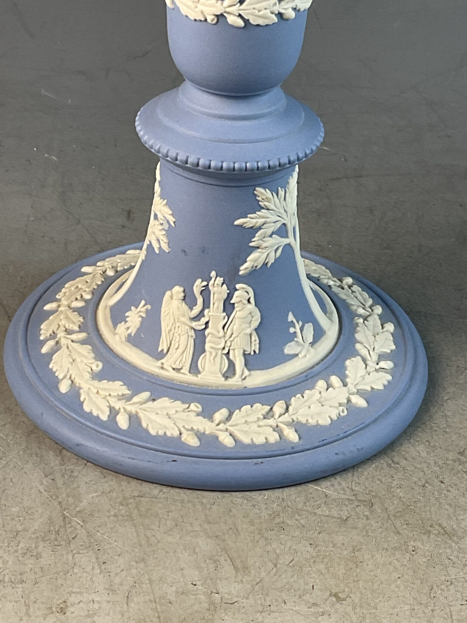 Steingut aus hellblauer und weisser Jasperware, runde Basis mit geradem Schaft, Tülle, Keramik am Boden bezeichnet „Wedgwood“, tadelloser Erhaltungszustand