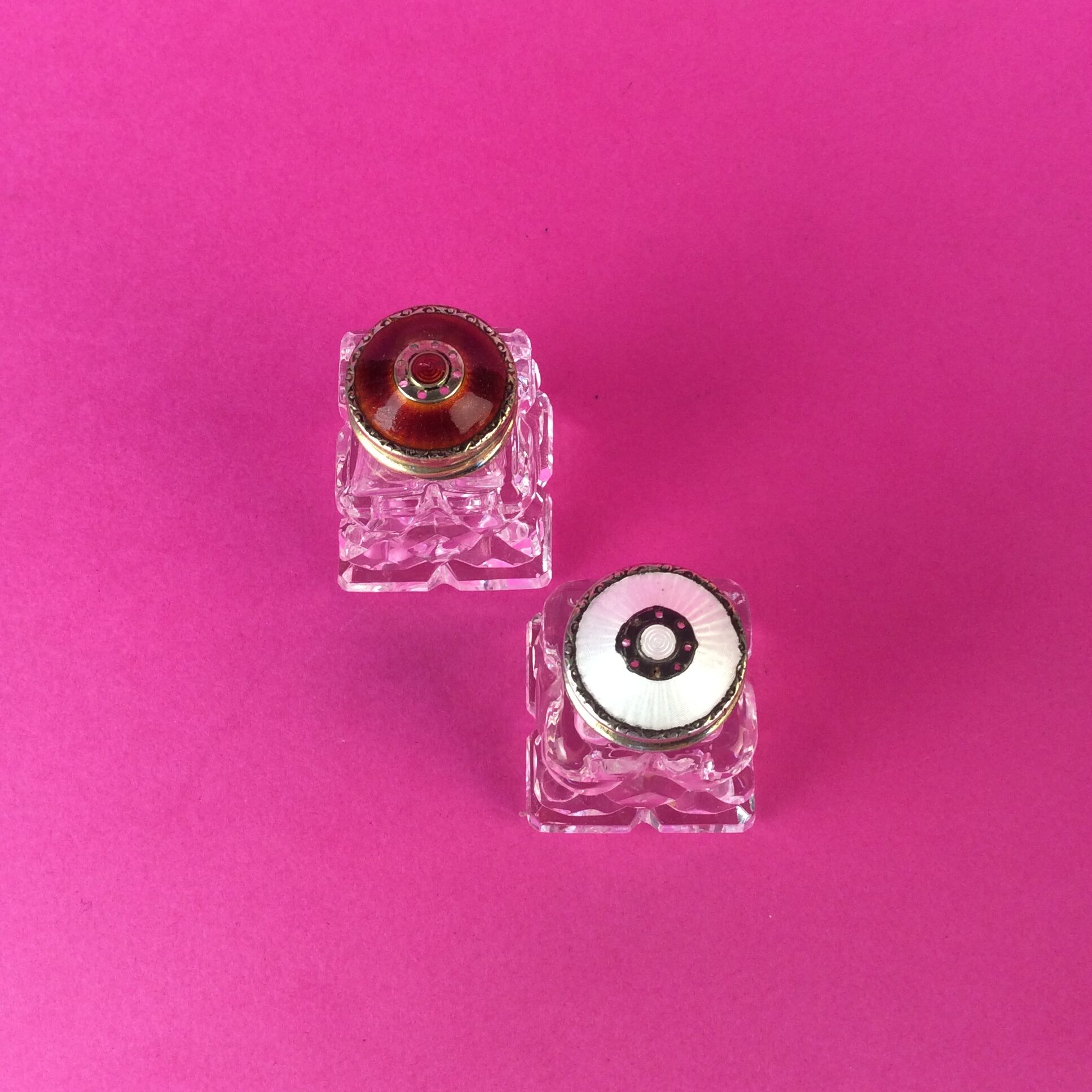 geschliffener, quadratischer Glaskörper, abschraubbarer Deckel aus Silber mit buntem Email, gemarkt STERLING 925 S NORWAY