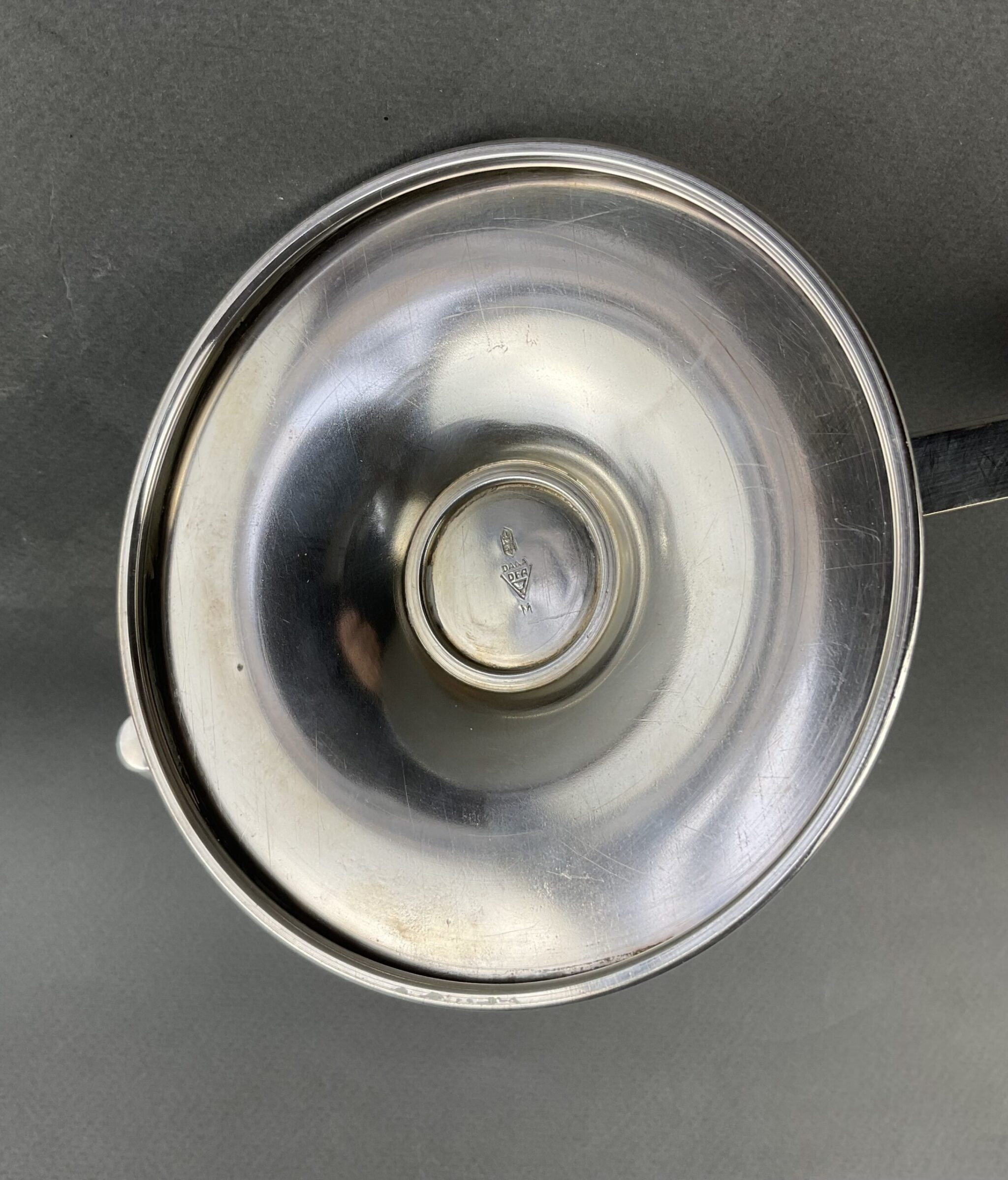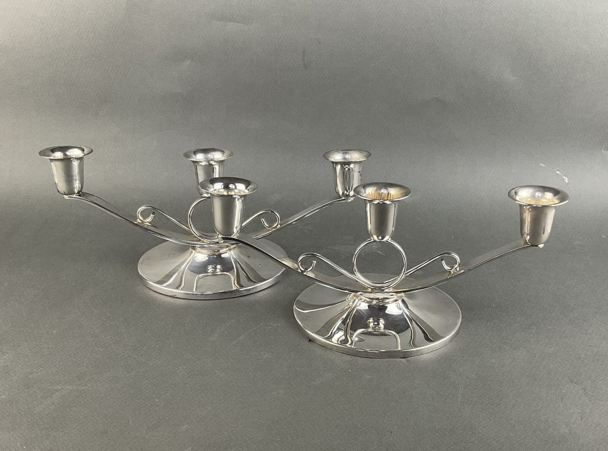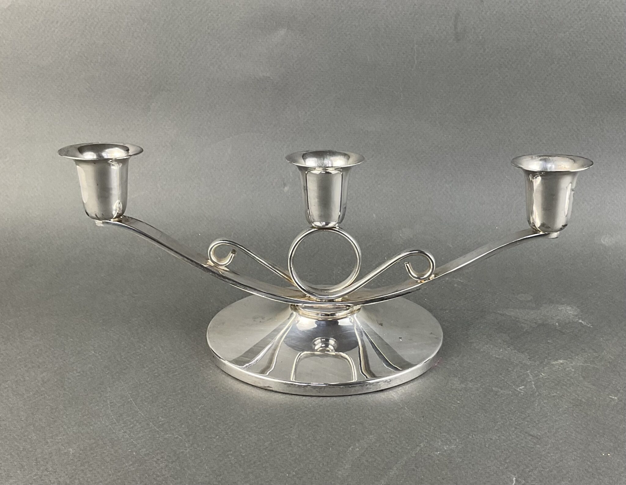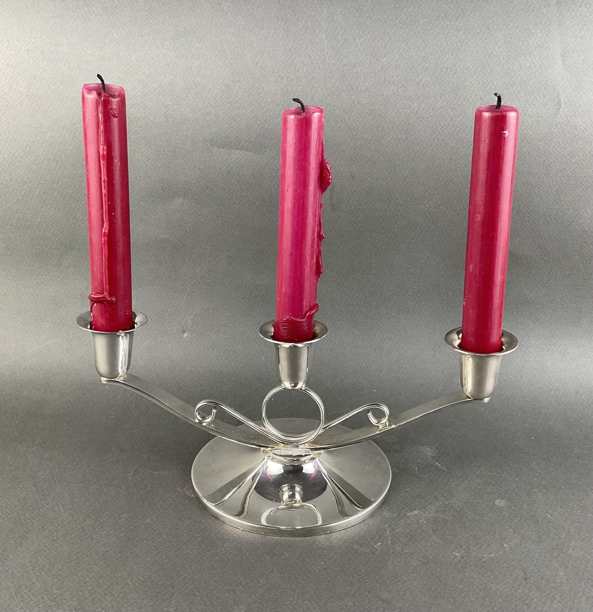 Alpacca, versilbert, runder Fuss mit zwei Armen, drei Kerzentüllen mit Tropfrand, am Boden gemarkt mit dänischem Herstellersignet, tadelloser Erhaltungszustand