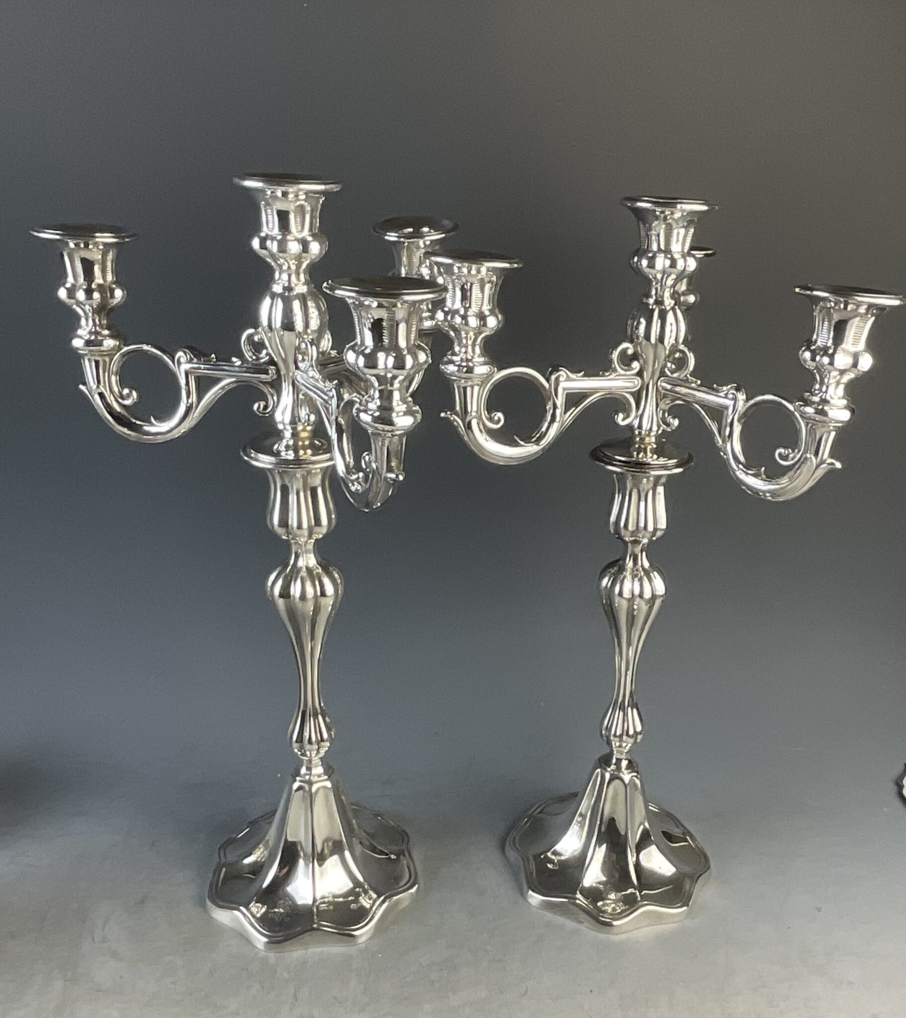 Alpacca, massiv versilbert, Paar Armleuchter mit mehrpassigem Fuss, Faltenzüge, Schaft mit Nodi, abnehmbare, vierflammige Girandolen, am Boden gemarkt mit Firmenmarke ART.KRUPP BERNDORF, handpolierter, tadelloser Erhaltungszustand