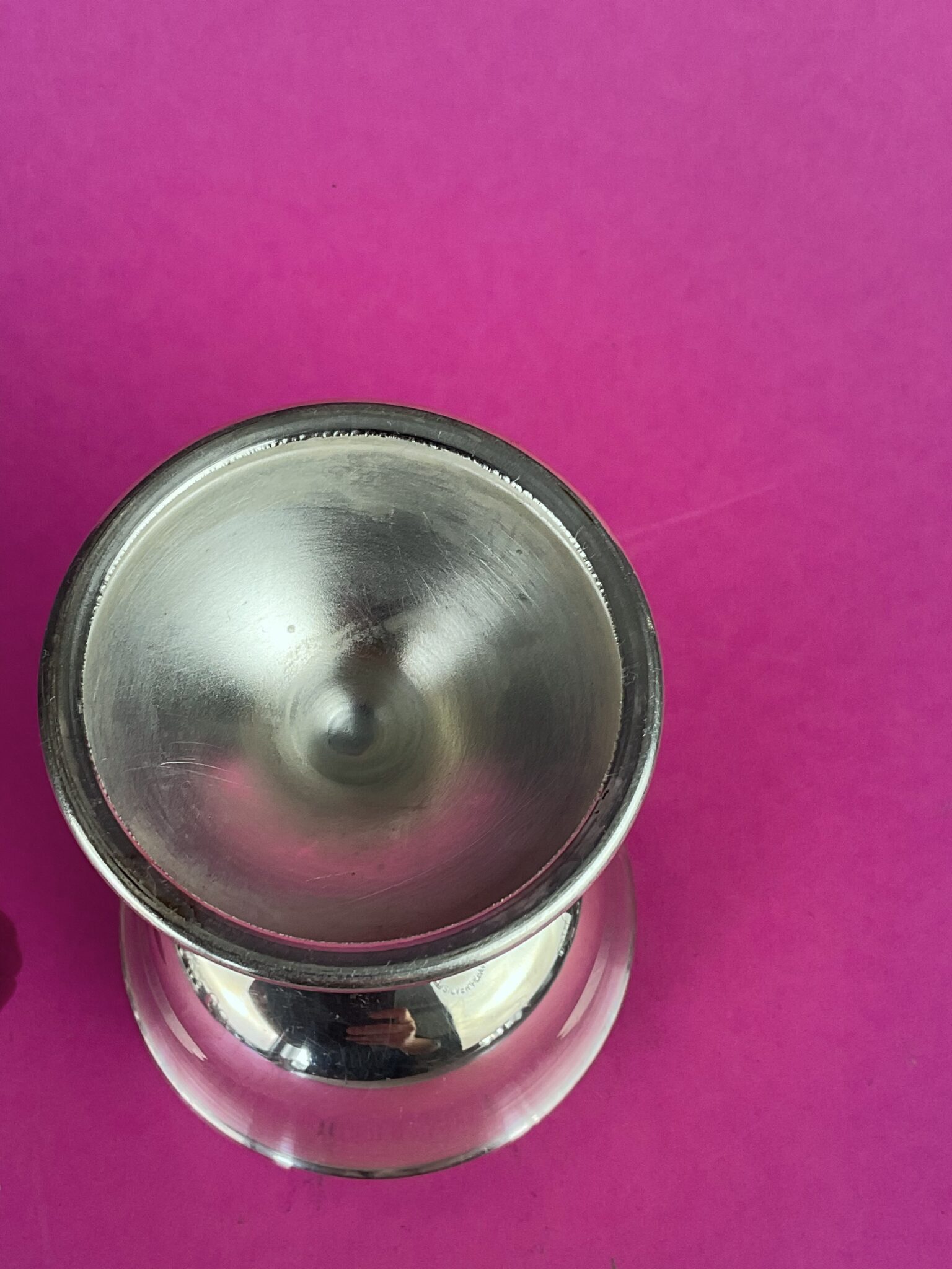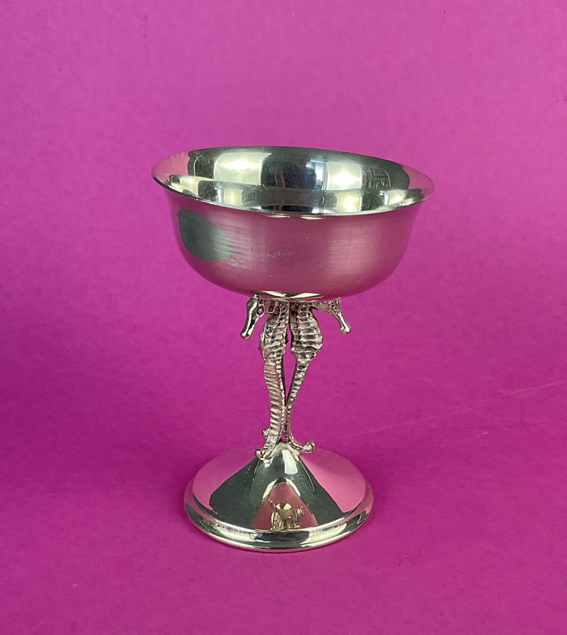 Alpacca, versilbert, runder Fuß, gebauchte Schale, Fuss aus drei plastischen Seepferdchen, ungemarkt, handpolierter Zustand