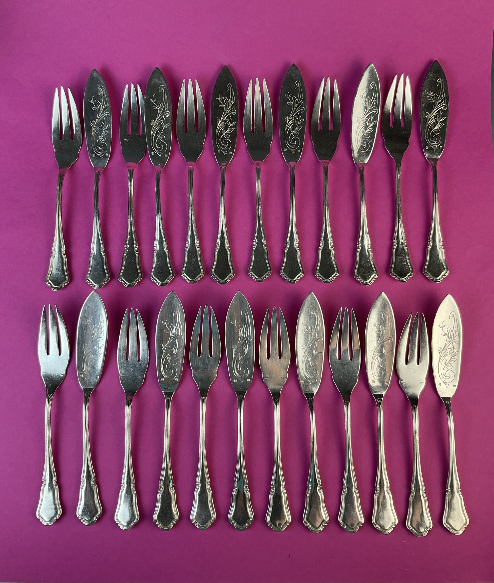 Alpacca, versilbert, 24 Teile, gemarkt mit französischer Herstellermarke HP im Quadrat und METAL BLANC, reliefiert aufgelegtes Monogramm „BLM“, gravierter Dekor, minimale, altersbedingte Gebrauchsspuren