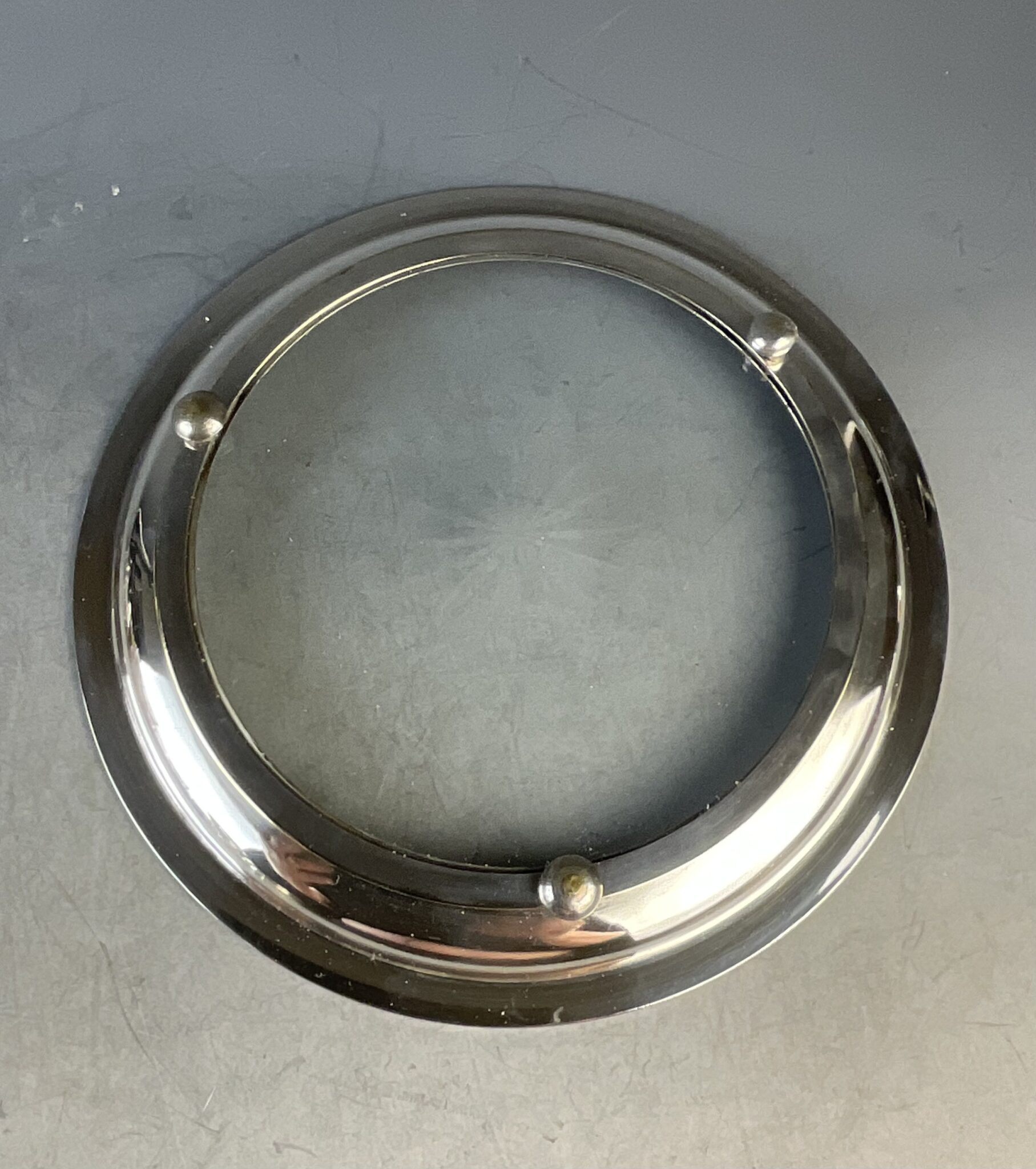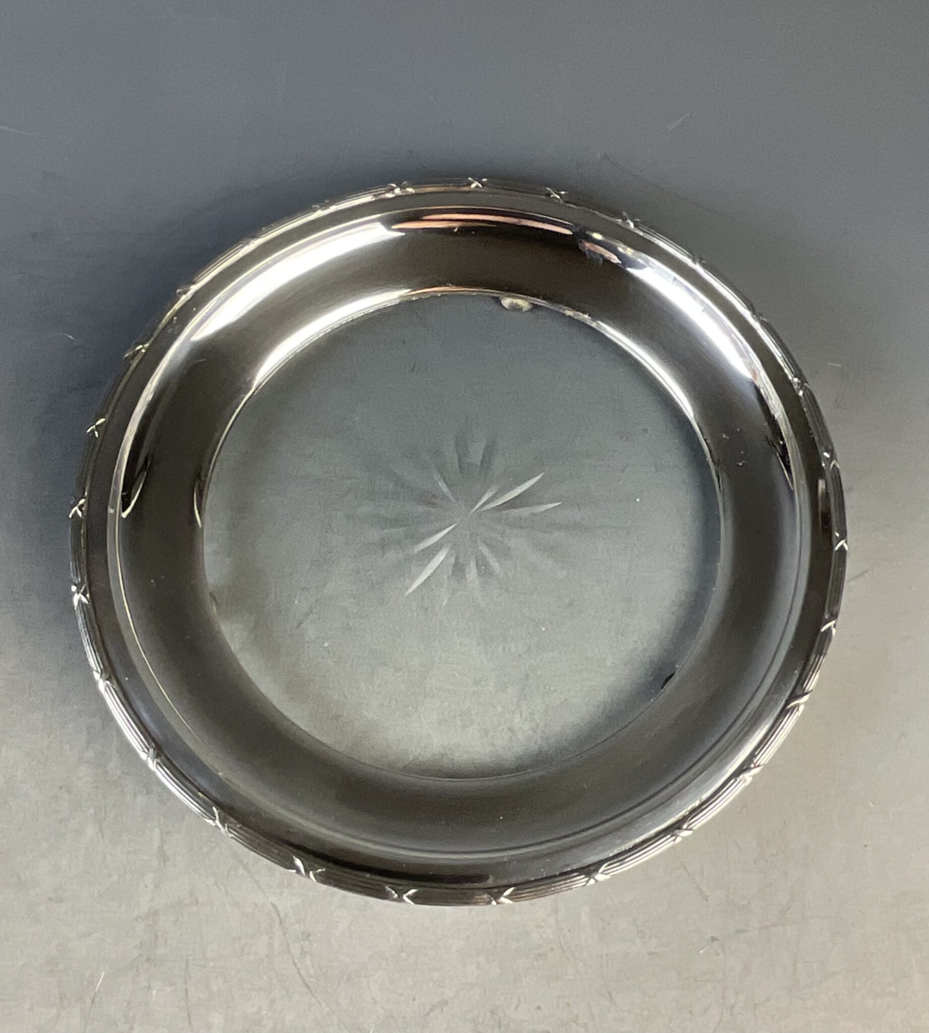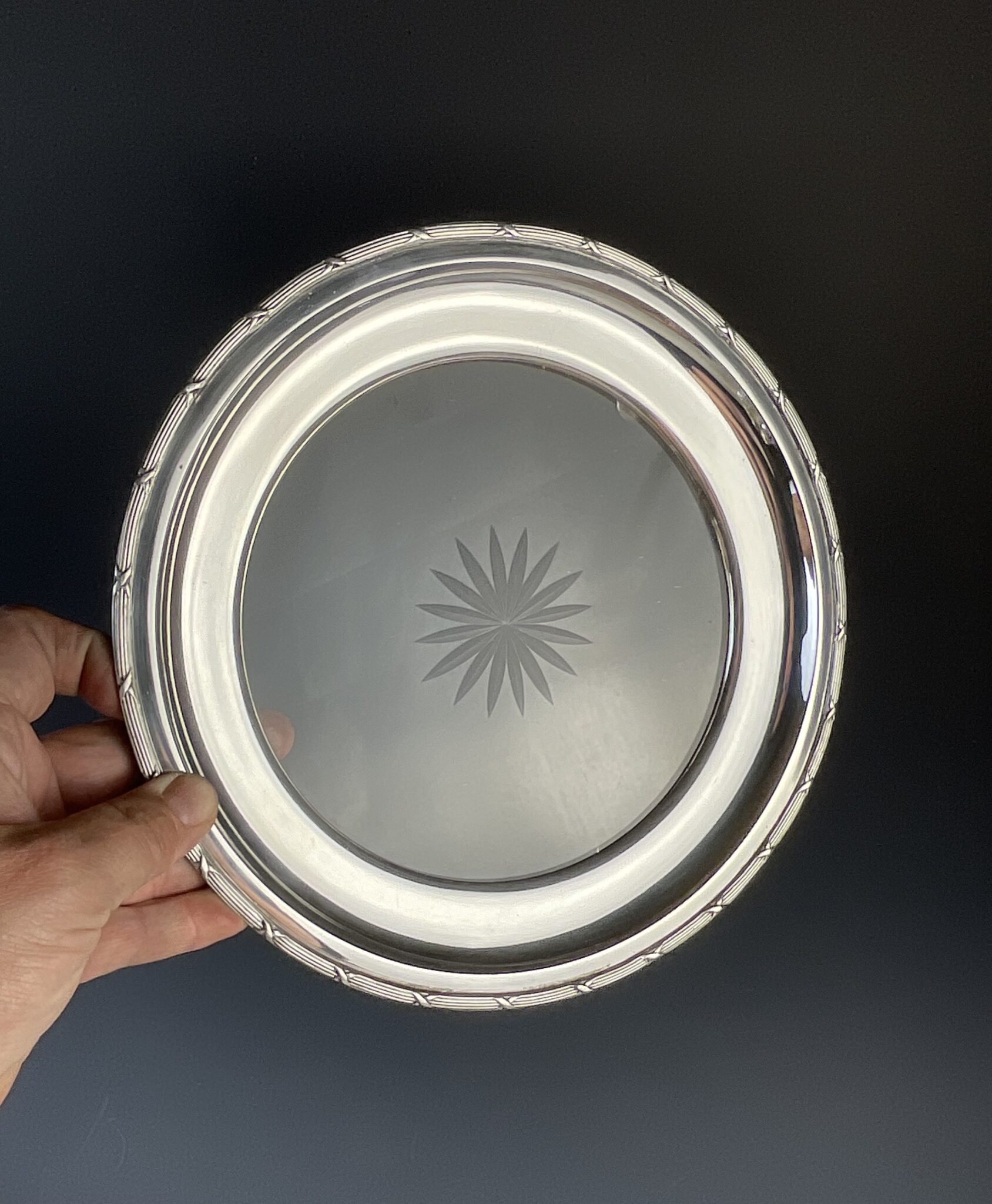 Alpacca, versilbert, rund, drei Kugelfüsschen, abgesetzte Fahne mit „Kreuzband“-Dekor, Glasplatte mit Bodenschliffstern, ungemarkt, tadelloser, handpolierter Erhaltungszustand