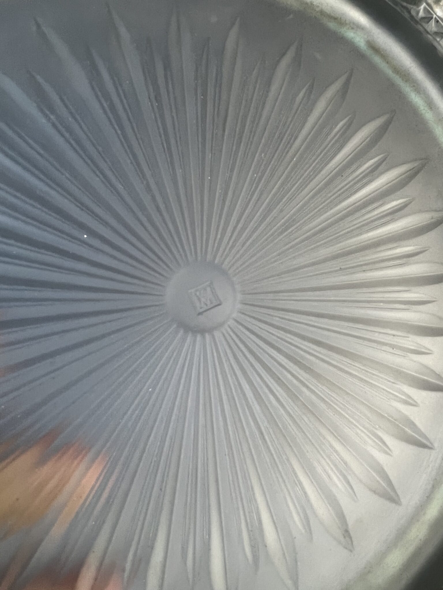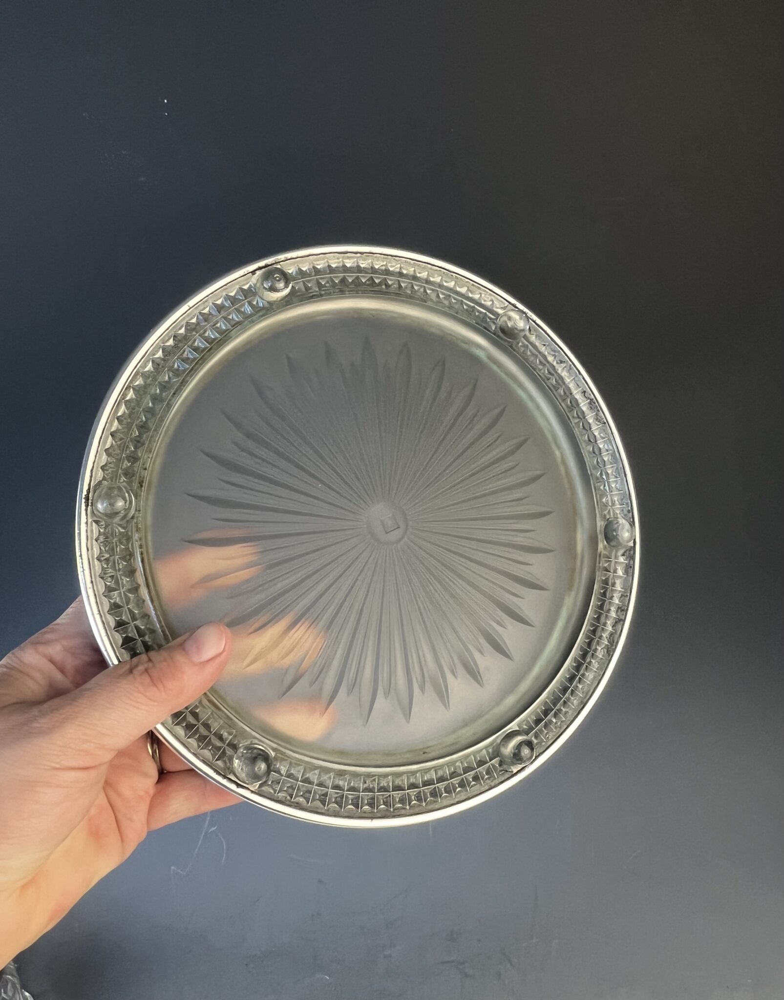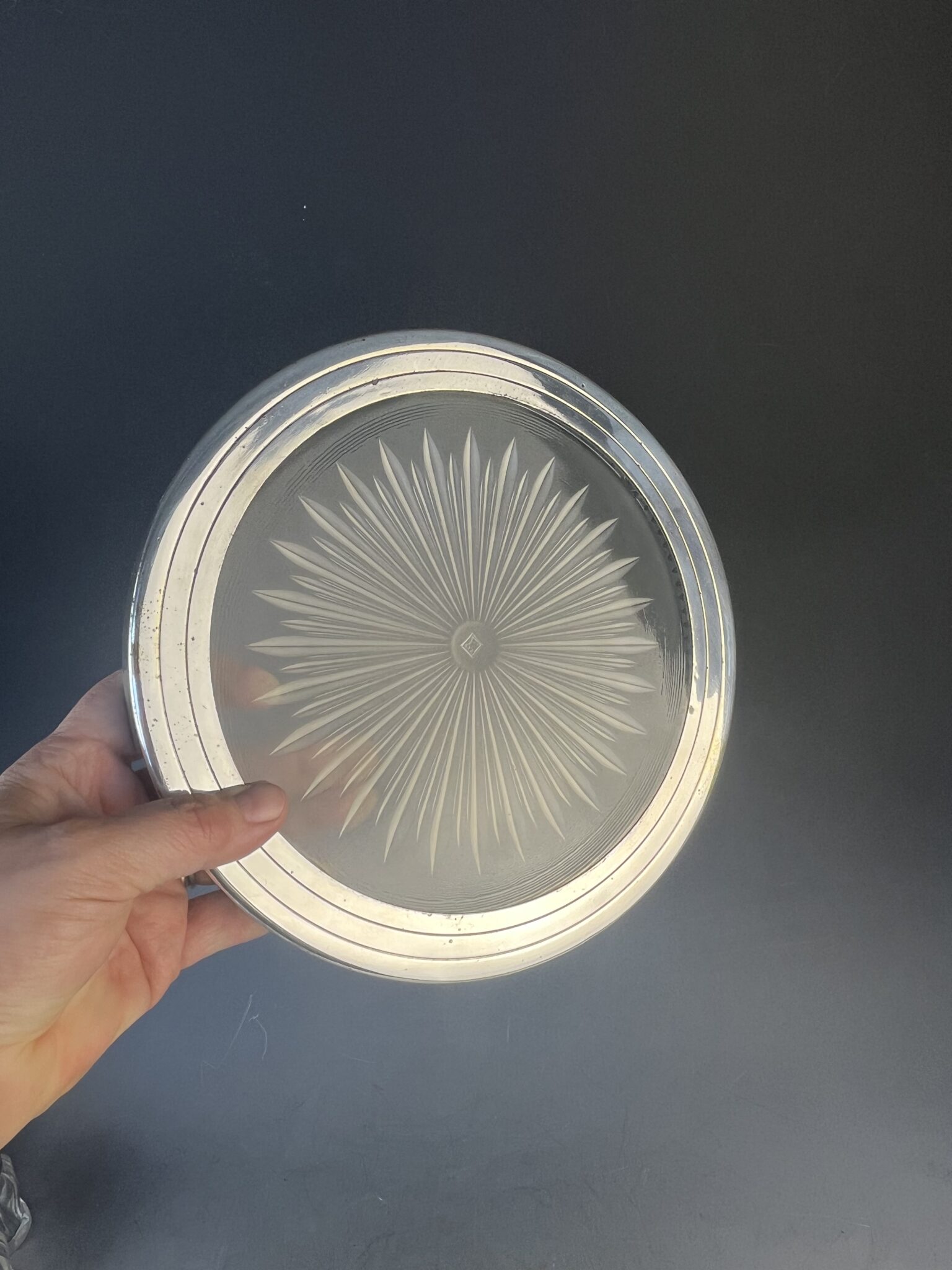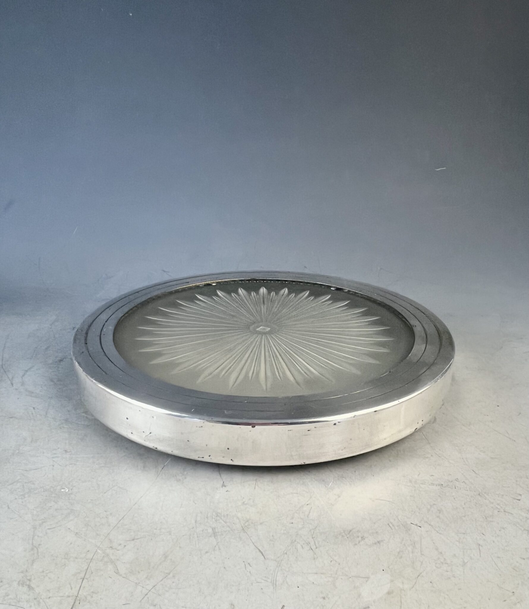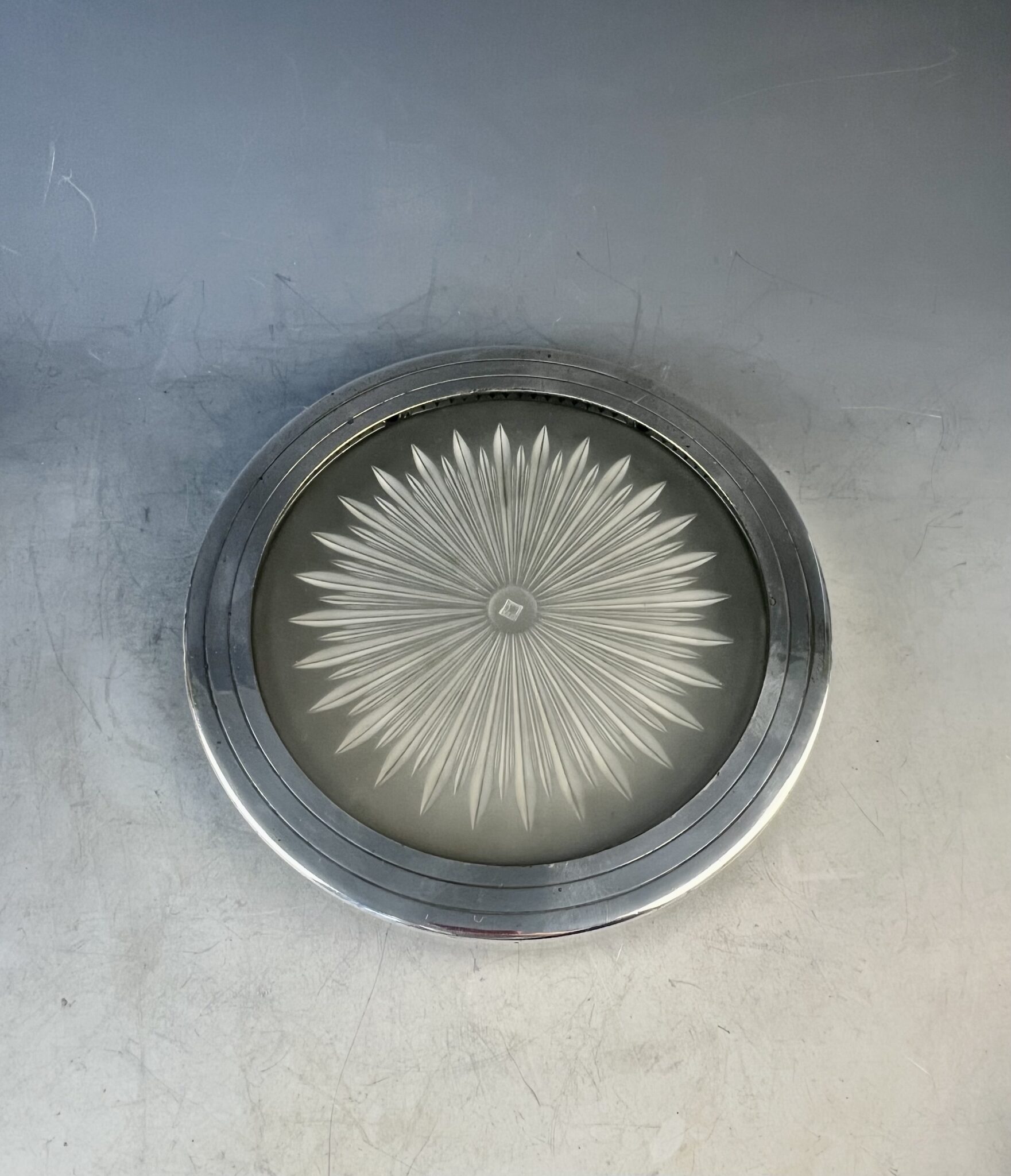 Alpacca, versilbert, Metall montierter, runder Glasuntersetzer, handgeschliffen und mattiert, Art Deco Dekor, in der Mitte gemarkt Verrerie Maure-Vieil, tadelloser, handpolierter Erhaltungszustand