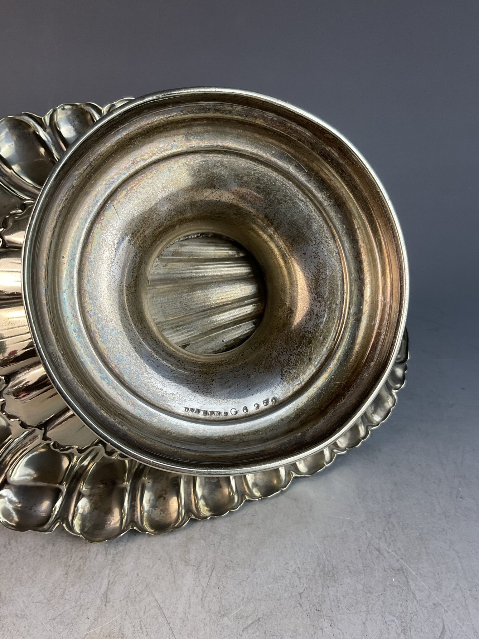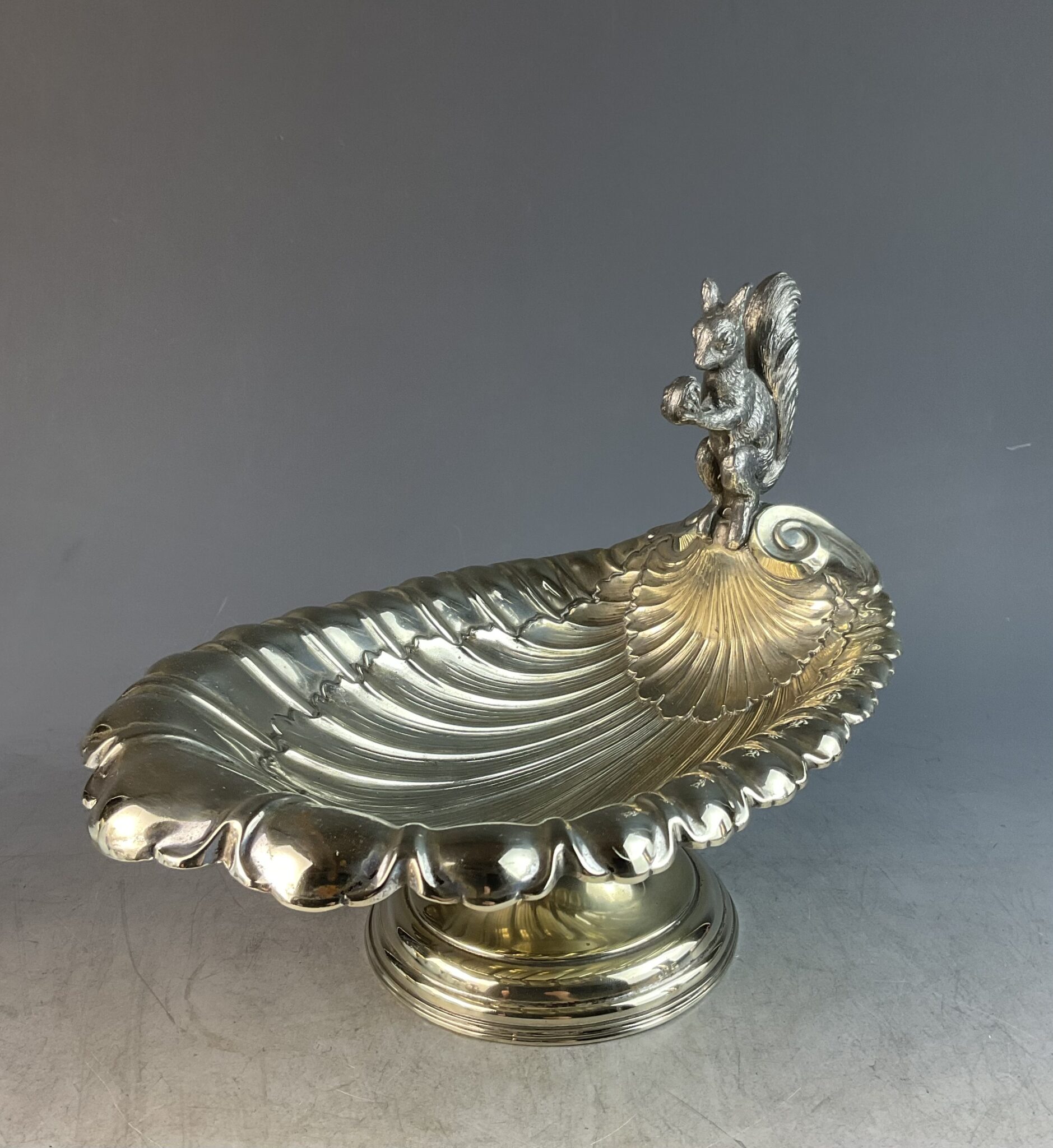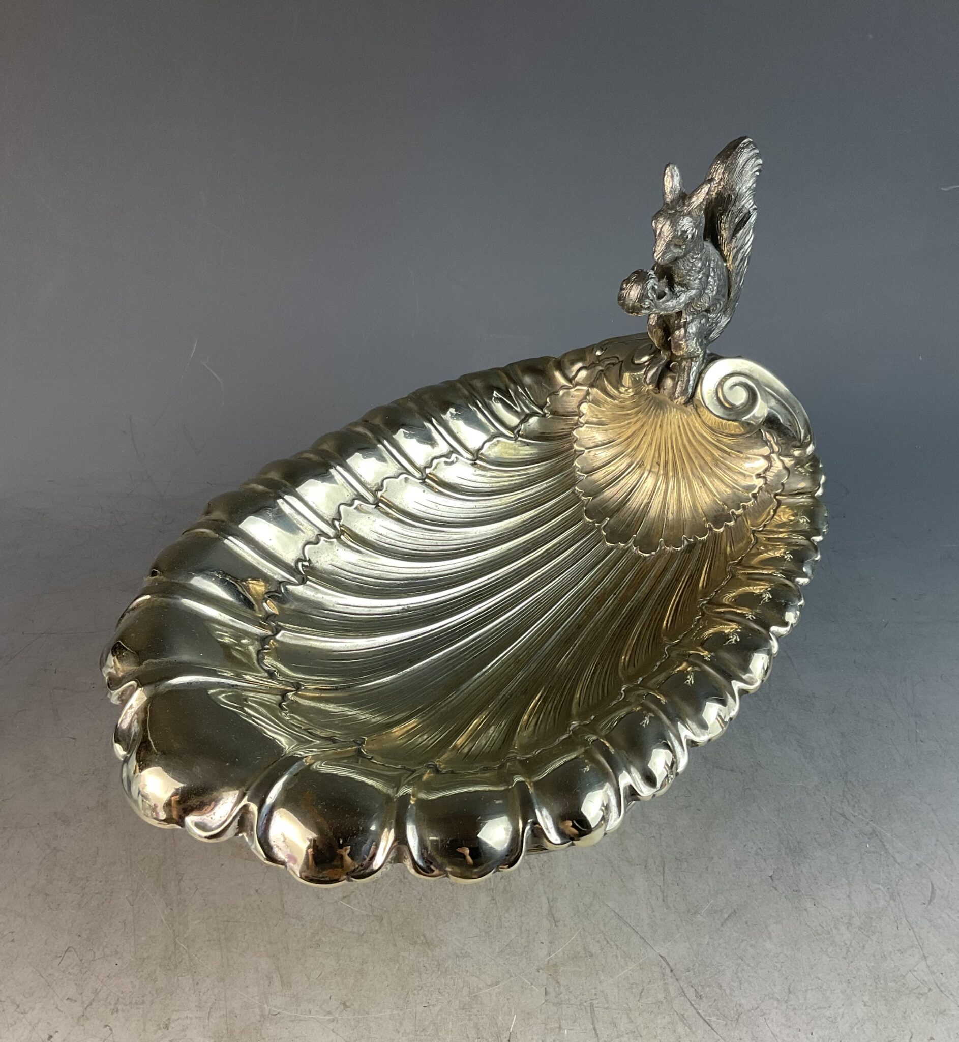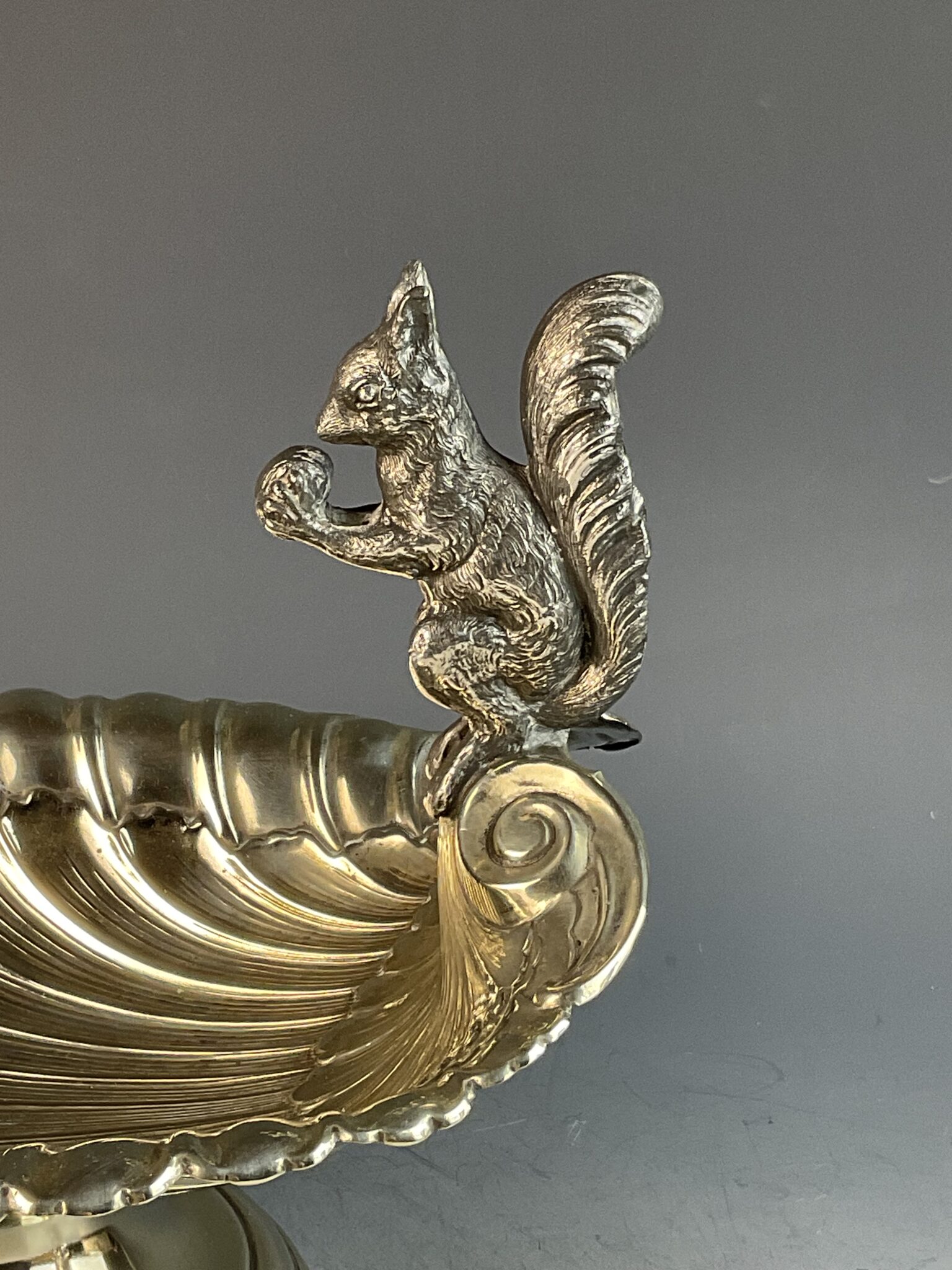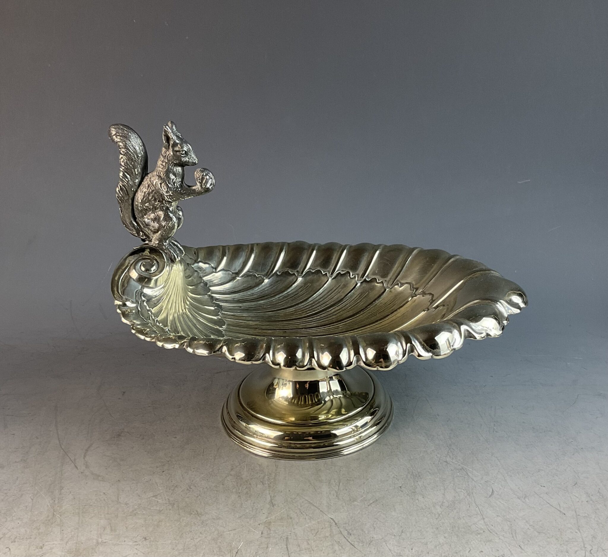 Alpacca, Muschelschale auf rundem Bein, plastisch ausgeformtes Eichhörnchen mit Nuss als Griff, gemarkt mit englischer Herstellermarke D & A, minimale Gebrauchsspuren, handpolierter Erhaltungszustand