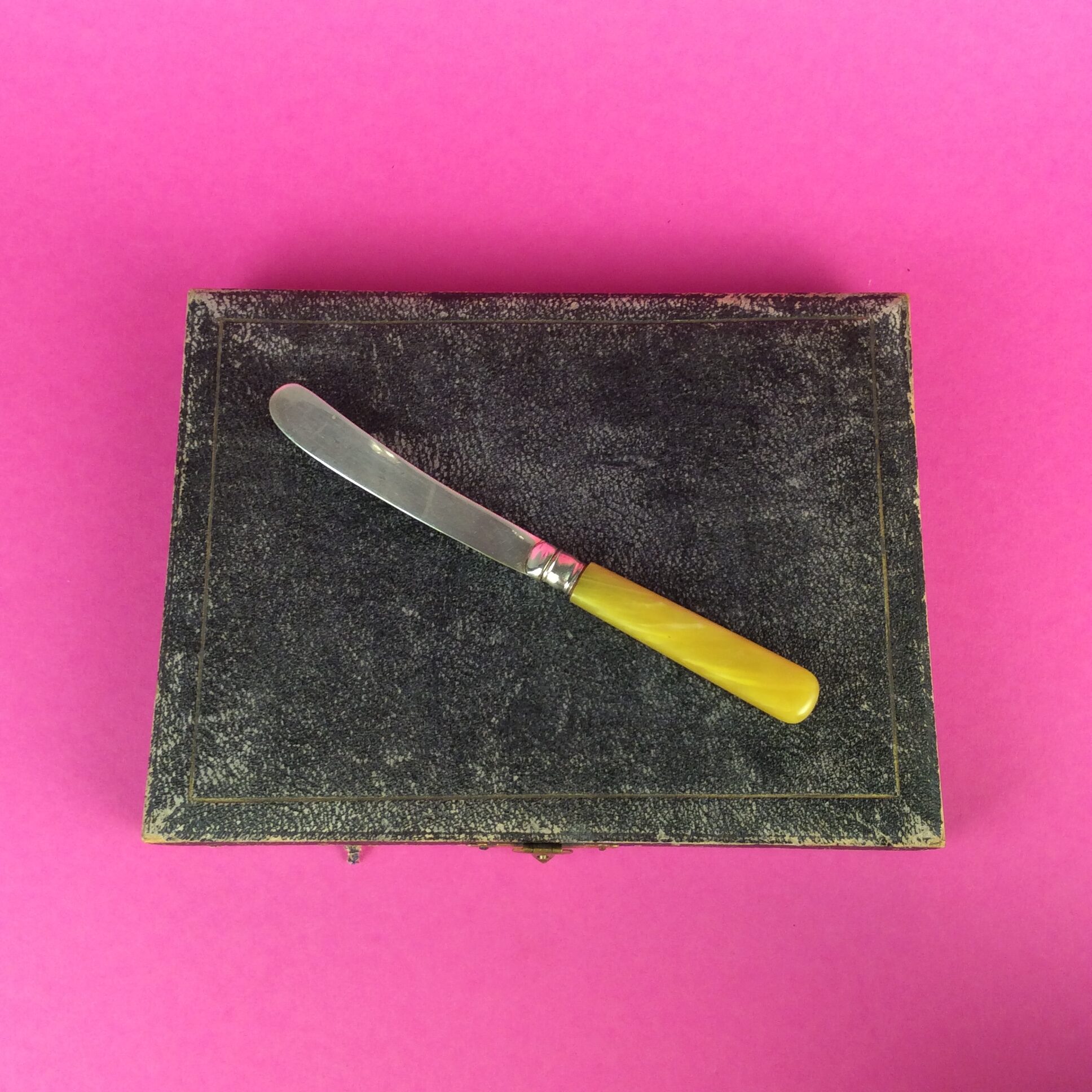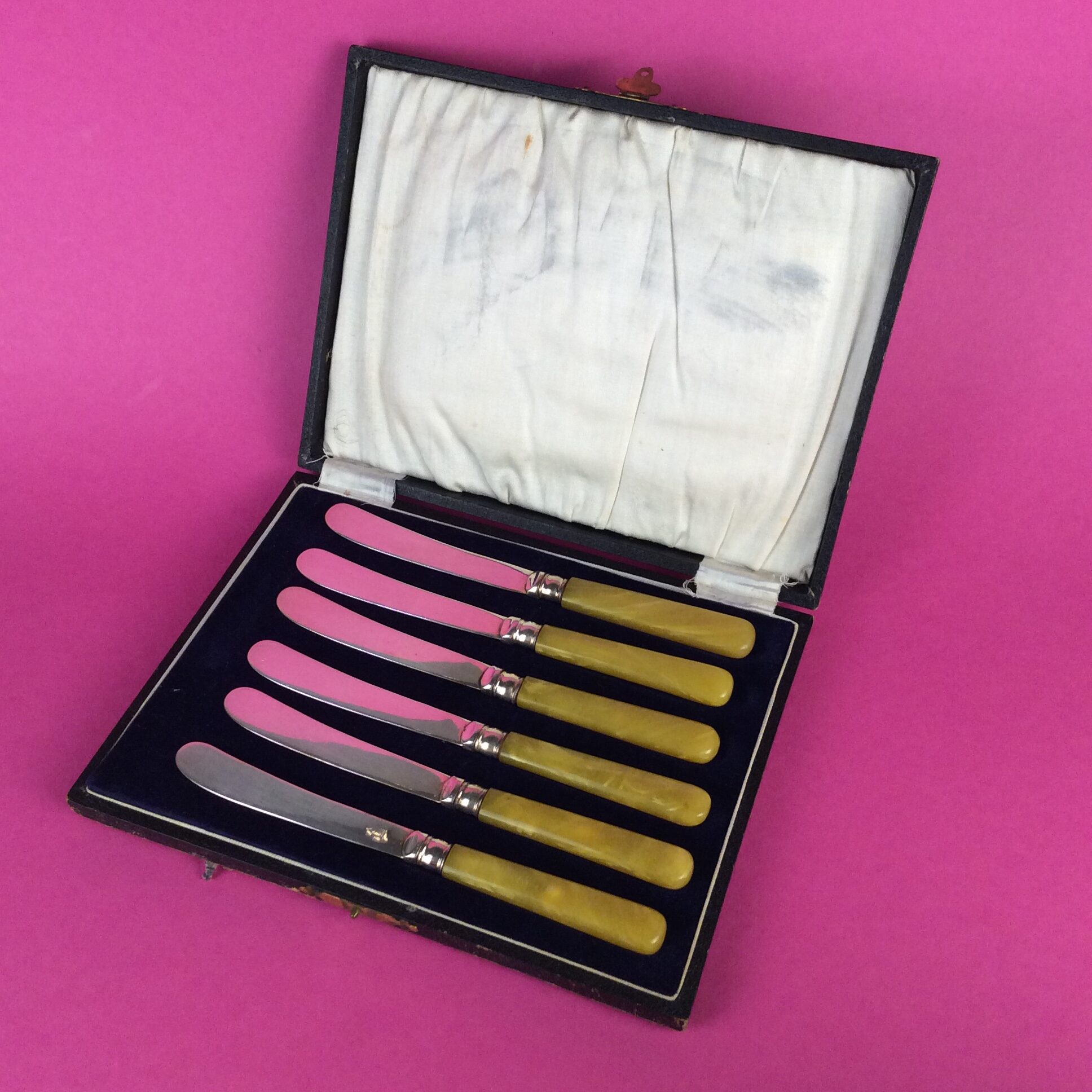 Heften aus gelb marmoriertem Bakelite, versilberte, geschwungene Klingen, gemarkt E.P.N.S., in originaler Geschenkskassette mit blauem Samt tapeziert