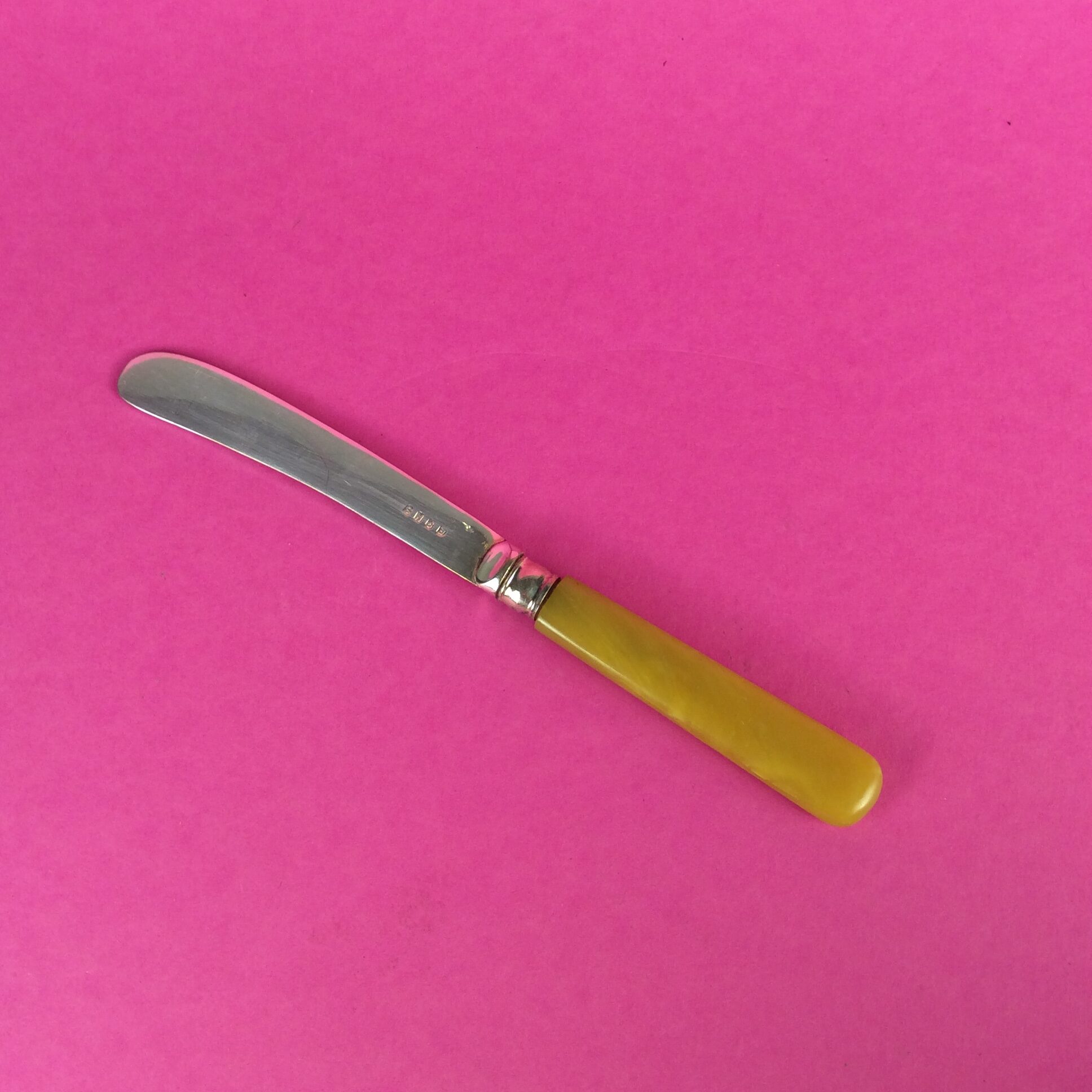 Annettes Etikette: Der erhaltene Katalog der englischen Firma Walker & Hall dokumentiert ausführlich die unterschiedlichen Spezialbestecke der britischen Inseln: Diese Messer mit geschwungenen Klingen werden als „teeknives“ bezeichnet, da zum Tee auch Kuchen mit Butter gereicht wurde. Ich mag diese handlichen Messerchen besonders gerne, wenn die Griffe in fröhlichen Farben aus Bakelite ausgeführt sind.