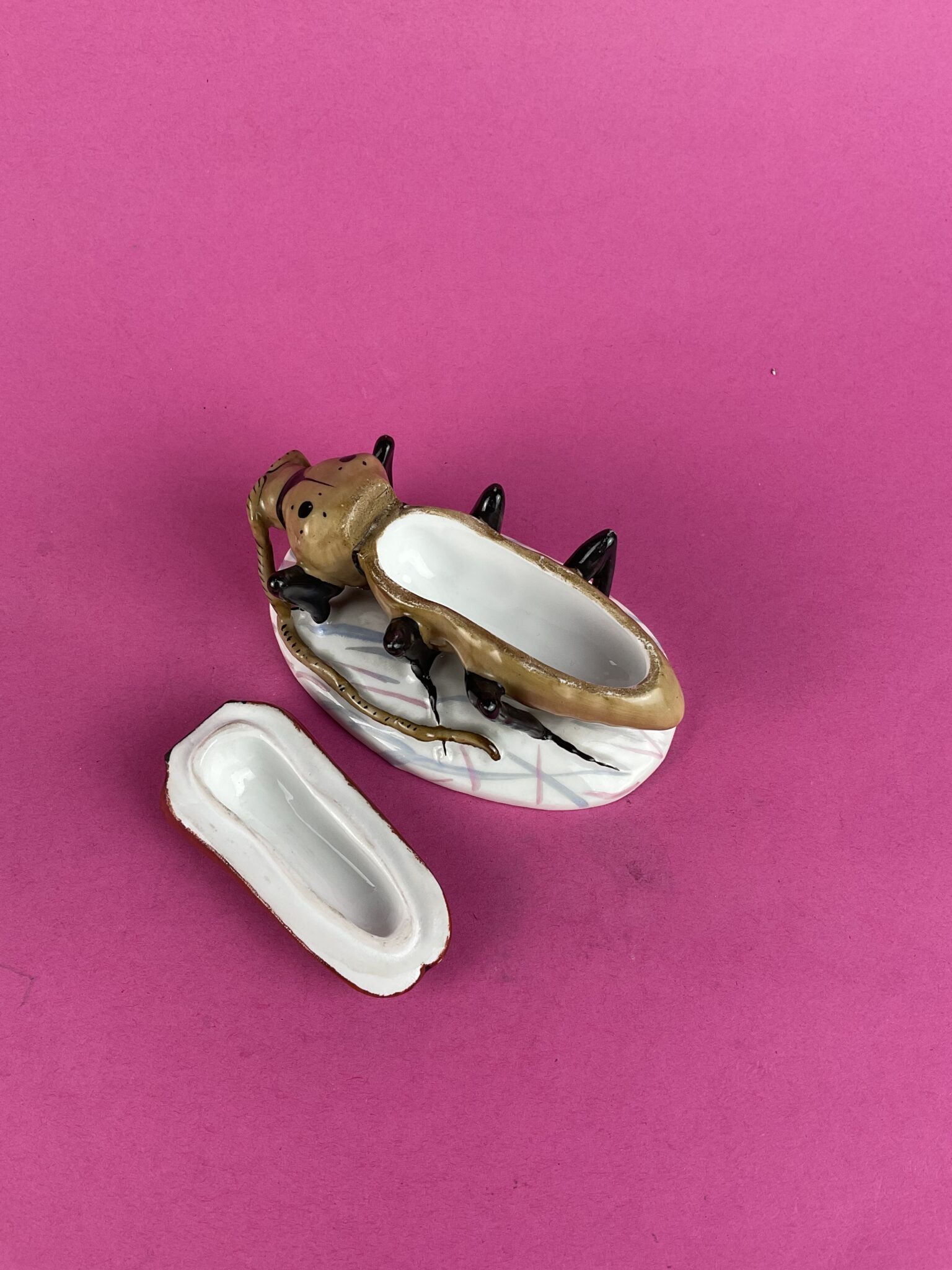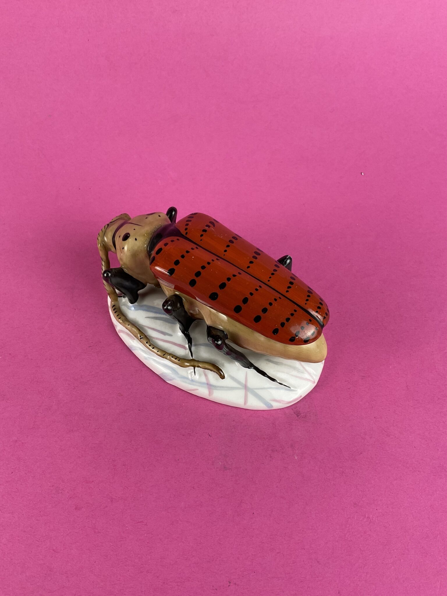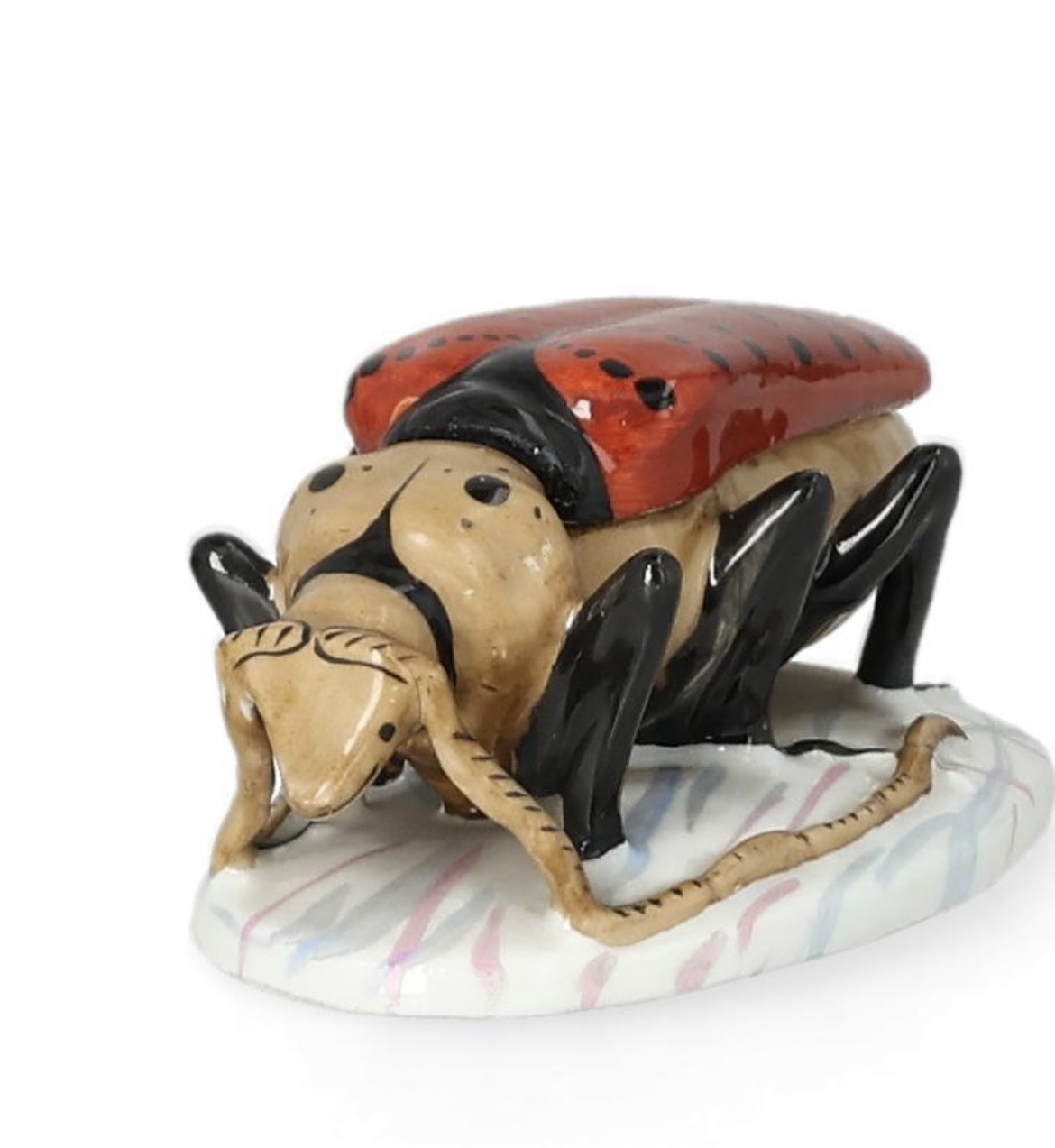 Porzellan, glasiert, bunt bemalt, ovaler Sockel mit Marmor ähnlicher Staffierung, Deckeldose als naturalistisch ausgeformter Käfer, am Boden gemarkt mit eingepresster Marke CF für die Porzellanmanufaktur Christian Fischer & Ludwig von Mieg, Pirkenhammer (verwendet in den Jahren 1853 – 1873), tadelloser Erhaltungszustand