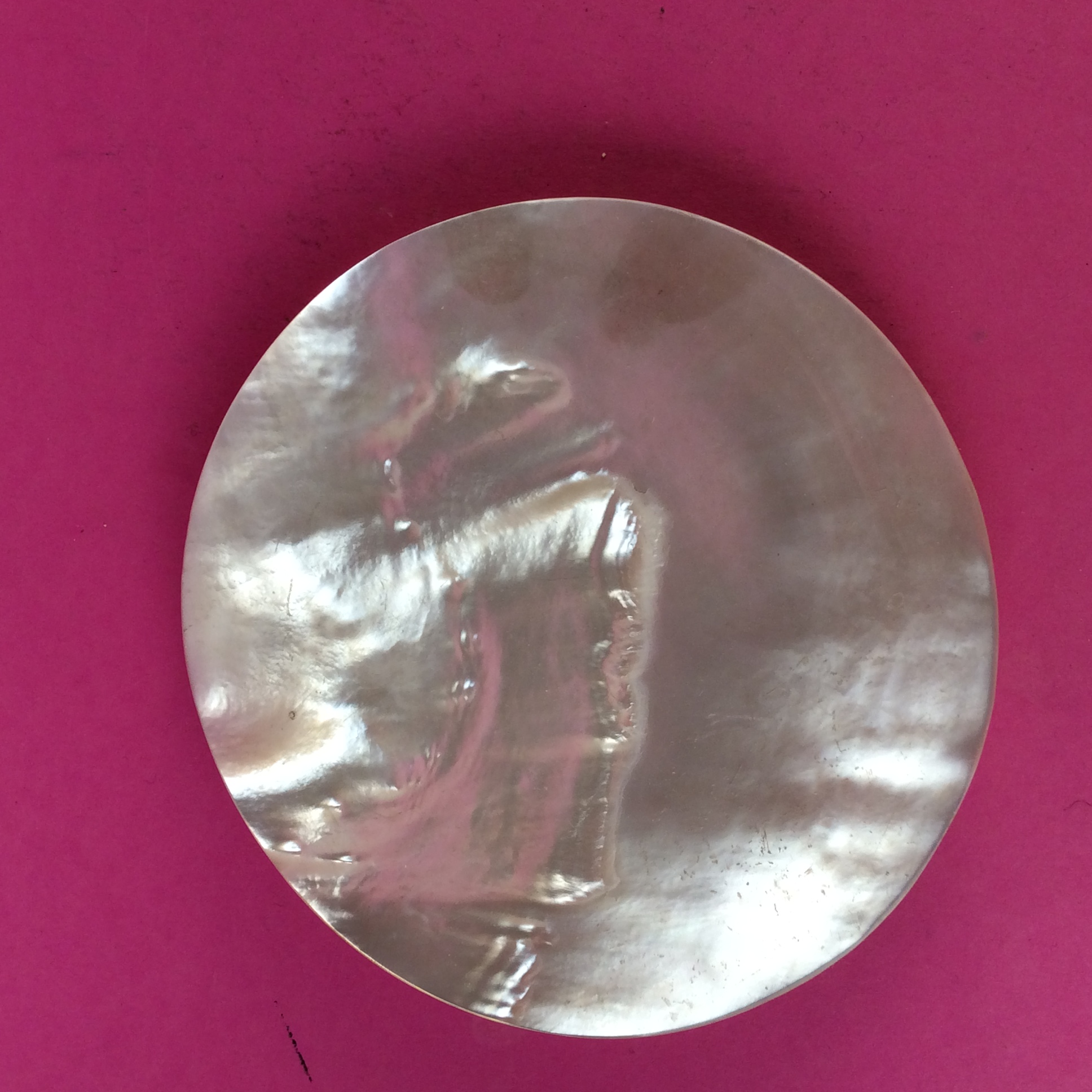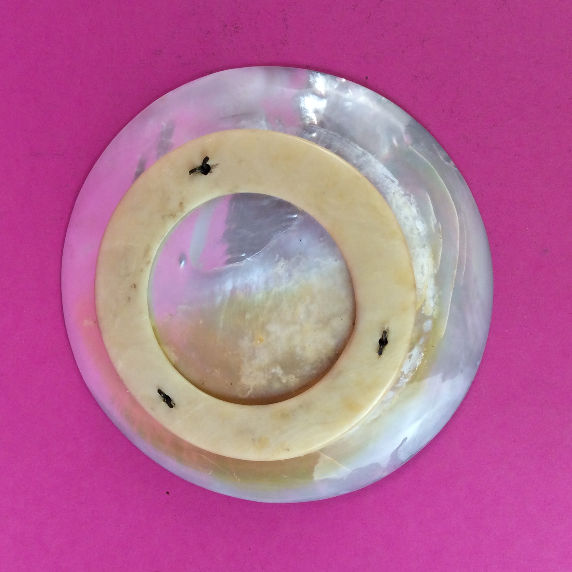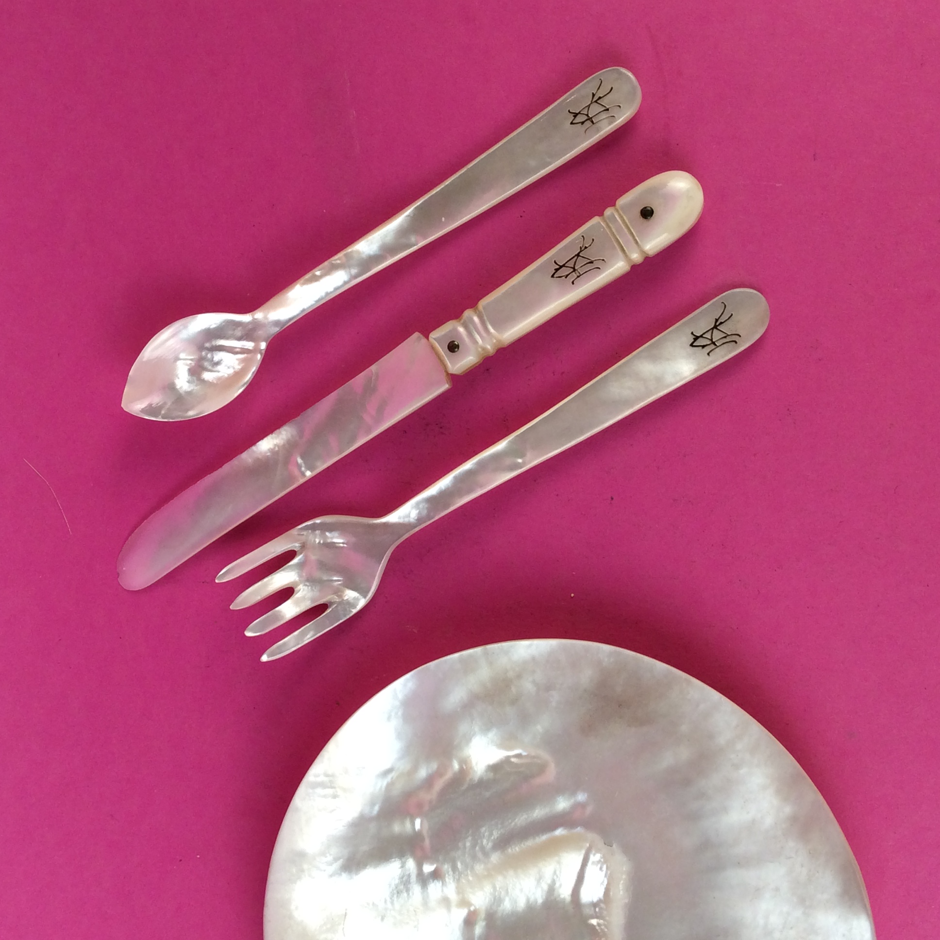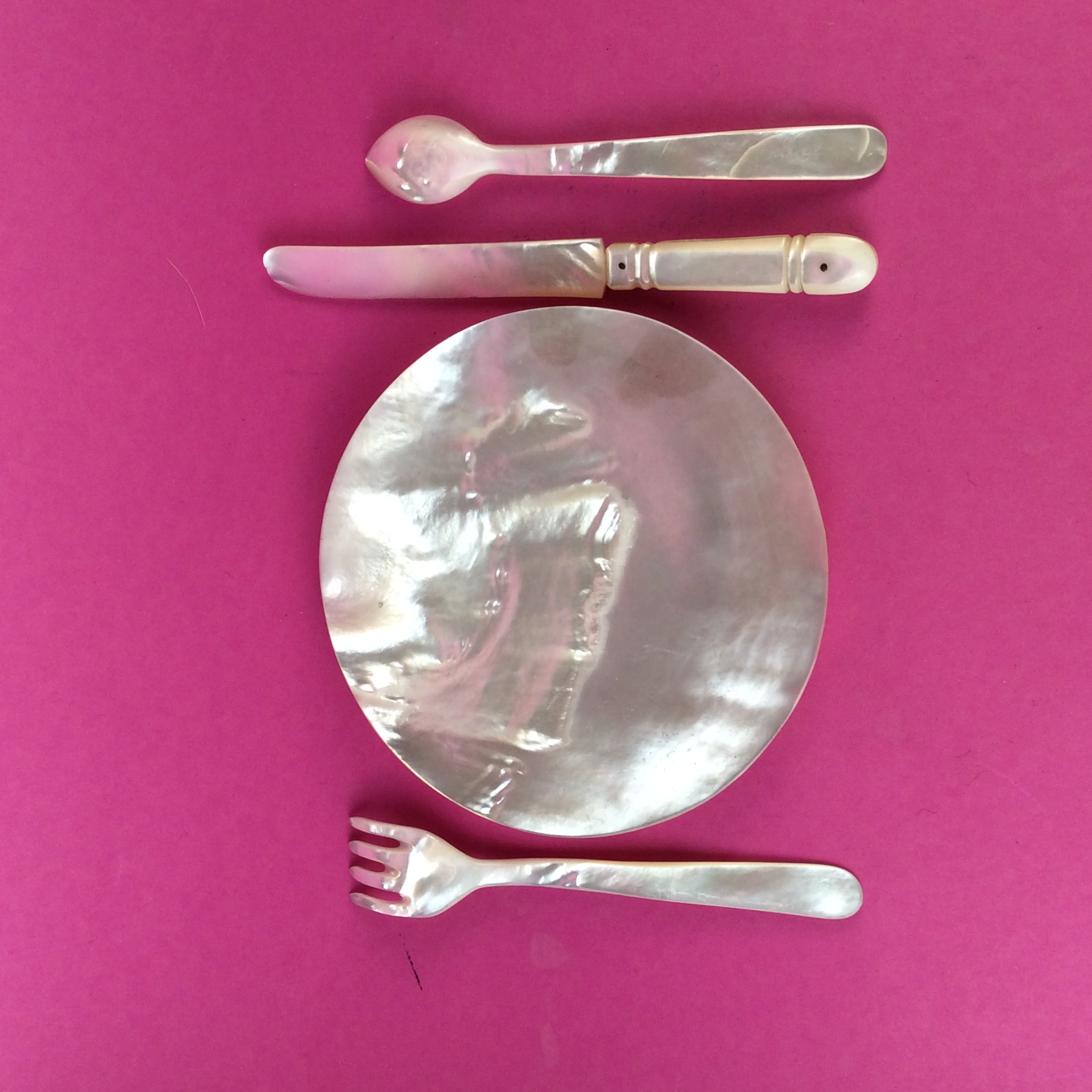 Teller aus poliertem Perlmutt, Standring aus Bein, Messer, Gabel und Löffel aus Perlmutt mit geschwärzter Monogramm-Gravur „AK“, ungemarkt