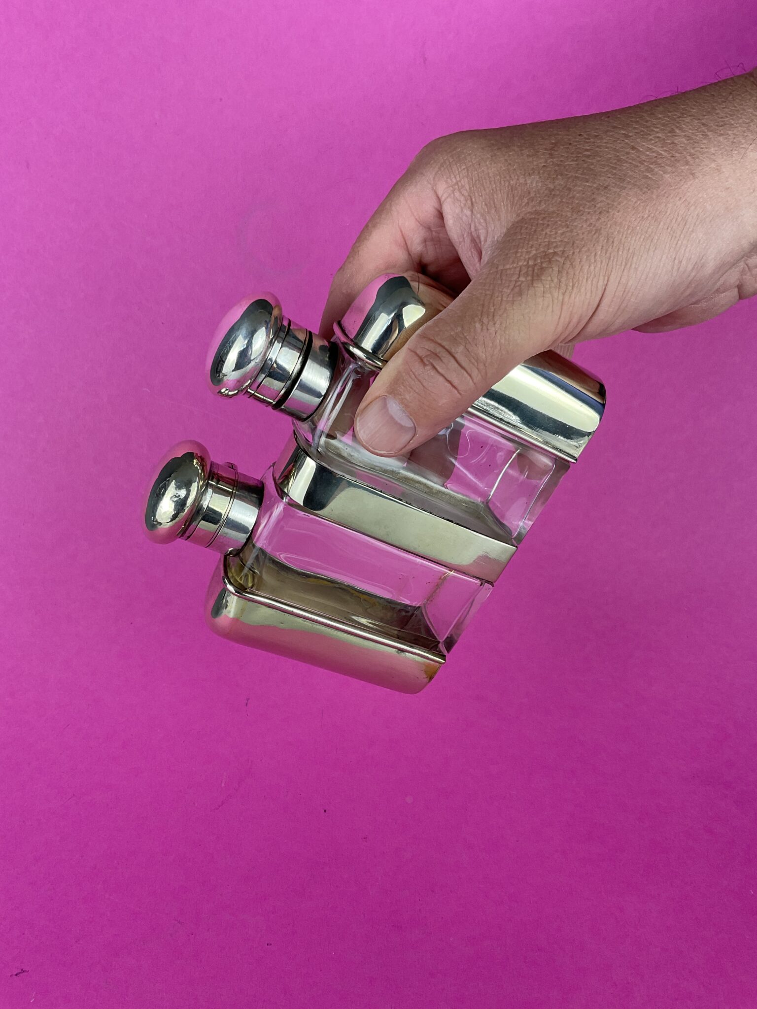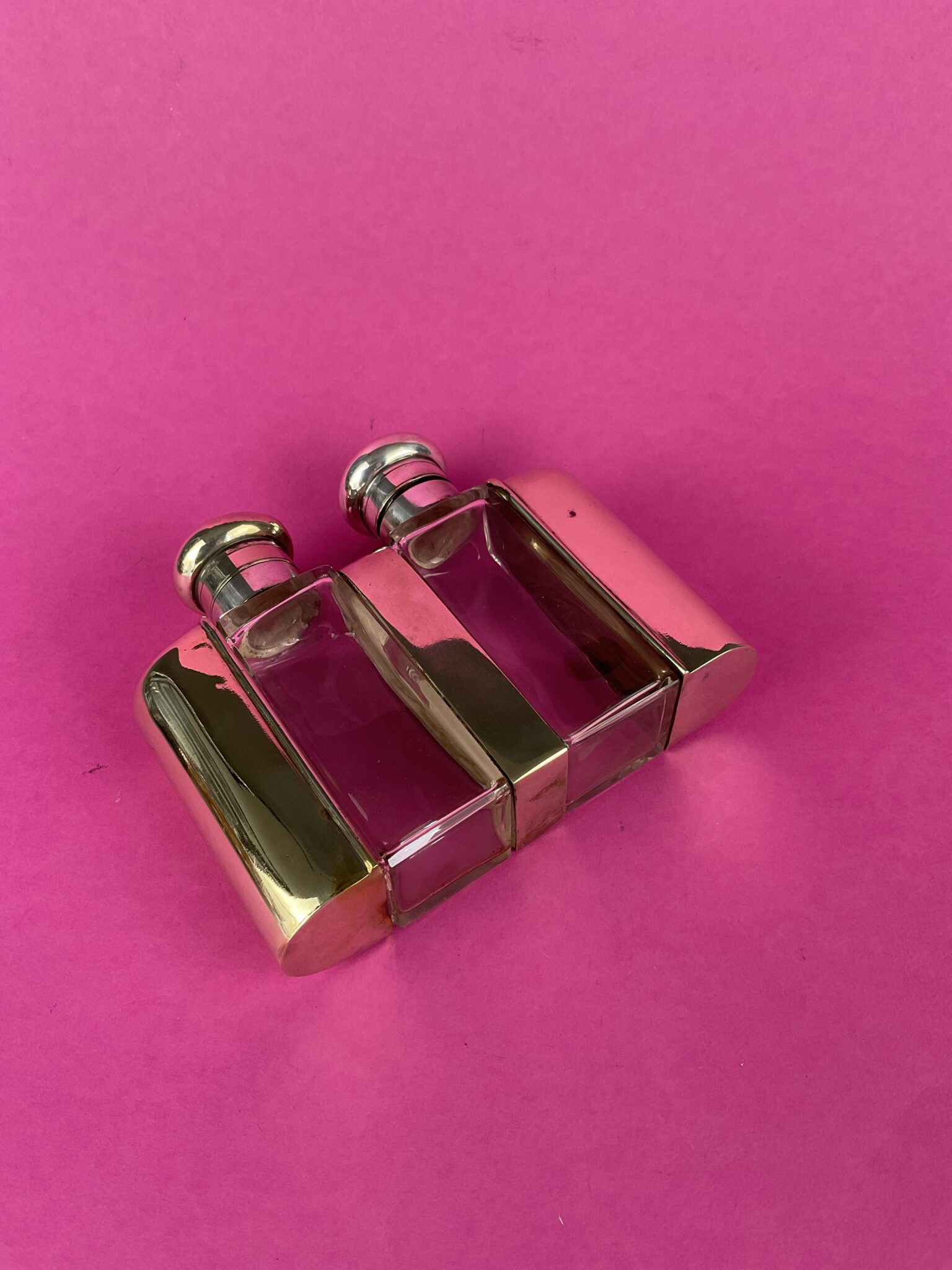 Alpacca, innen vergoldet, Doppelflakon aus Glas mit seitlichen Kappen aus Alpacca, Schraubverschluss mit funktionierendem Bajonetverschluss, innen mit intakter Korkisolation, ungemarkt, handpolierter Zustand mit minimalen Gebrauchsspuren