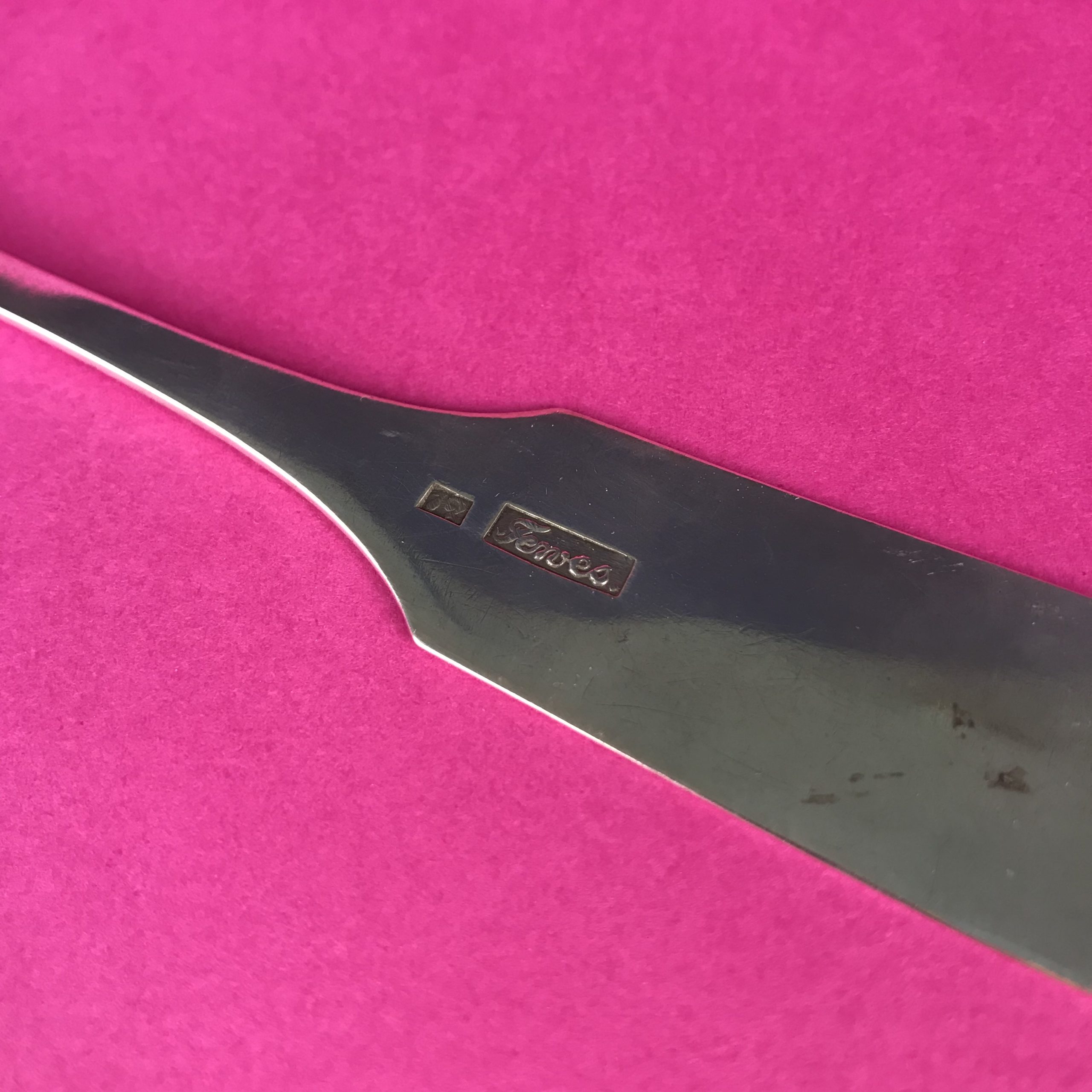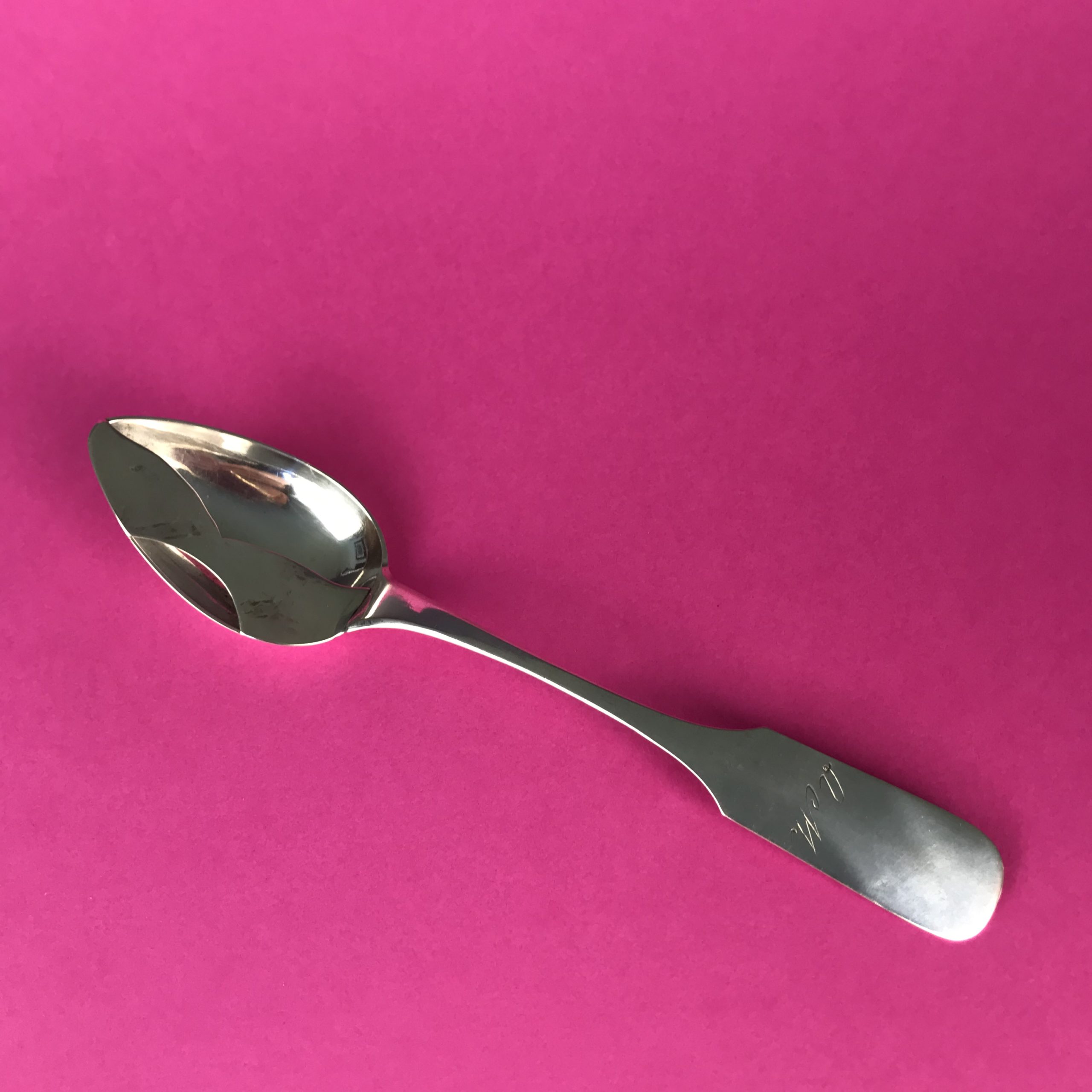 Silber, Facon Spaten, Laffe mit Abdeckung um den Schnurrbart zu schonen, rückseitig am Stiel gemarkt 12 löthiges Silber, Meistermarke , Monogrammgravur „W V“