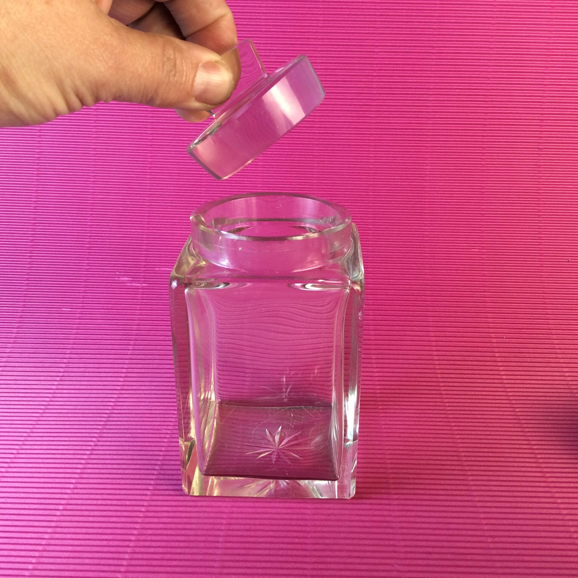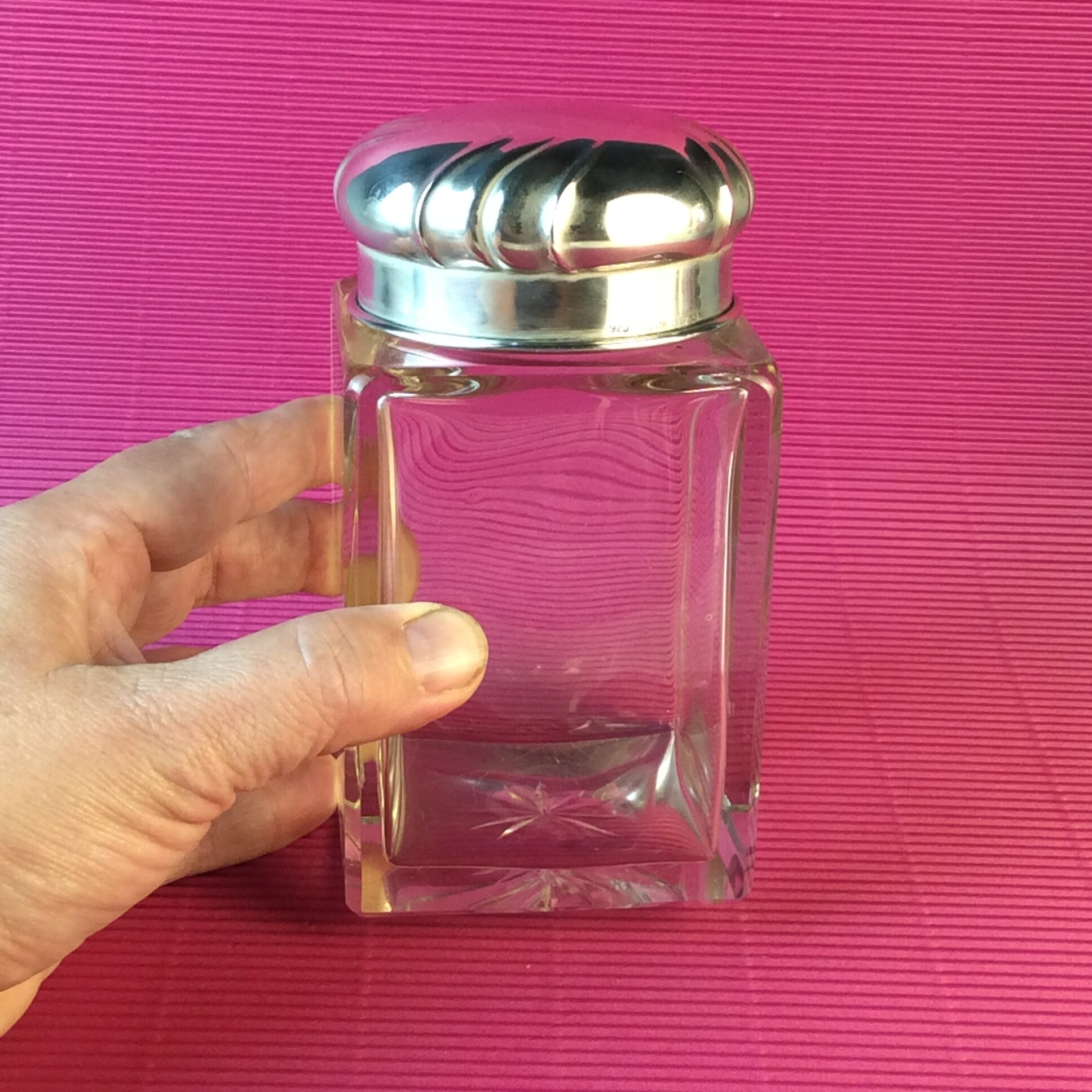 quadratischer Glaskörper mit Bodenschliffstern, farbloses Kristallglas, passender runder Steckdeckel aus Glas, runder Silberdeckel mit Faltenzügen, gemarkt mit Feingehaltszeichen 935 TREUSCH LEIPZIG