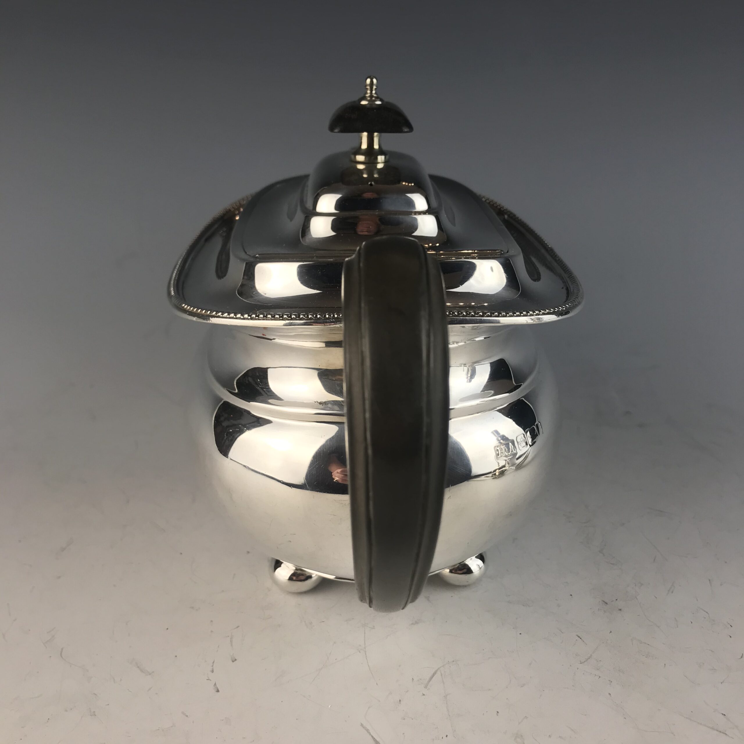 Silber, ovaler Gefäßkörper auf vier Kugelfüßen, umlaufender Perlstabrand, Scharnierdeckel, gemarkt mit englischem Beschauzeichen mit schreitendem Löwen, Krone für Sheffield, unleserlicher Jahresbuchstabe und Meisterzeichen HA im Rechteck, isolierender Holzhenkel und Knauf, tadelloser, handpolierter Erhaltungszustand