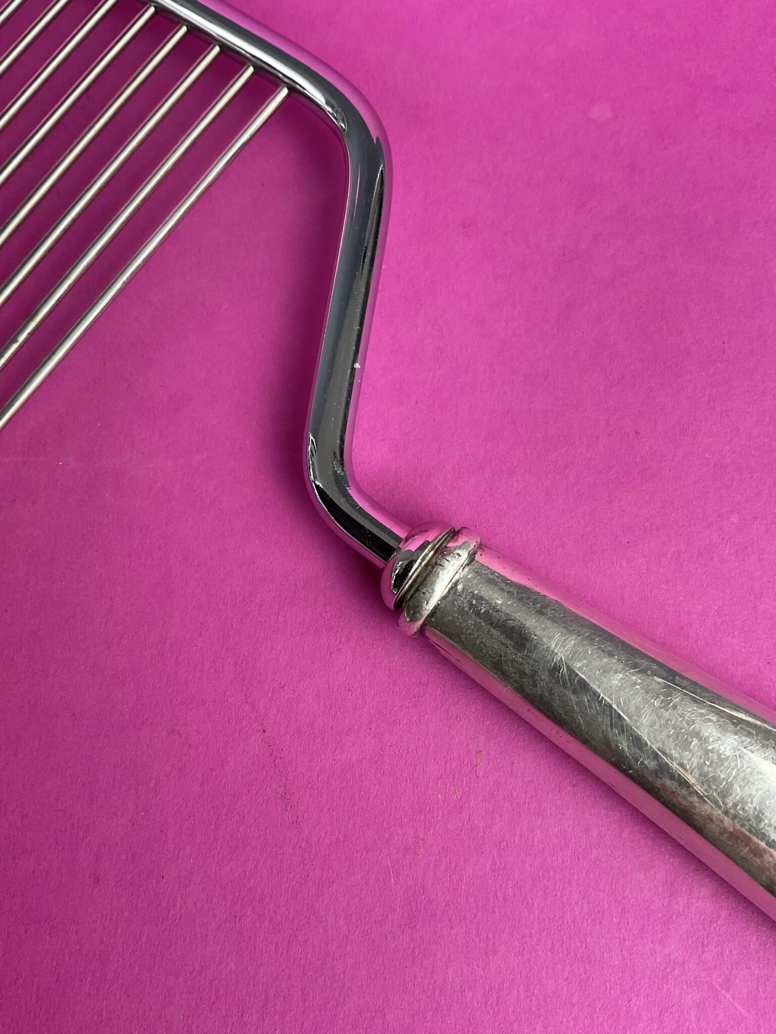Annettes Etikette: Diese ungewöhnlichen Vorleger werden „Cake Breaker“ oder „Angel Food Cake Slicer“ genannt. .Zur Verwendung schieben Sie die Zinken mit einer sanften Wackelbewegung in den Kuchen und schneiden ihn einfach durch. Die mäßig scharfen einzelnen Stifte durchstechen die Scheibe, halten den Teil fest an seinem Platz und erzeugen dabei eine nahtlos gerade Linie durch den Biskuit.