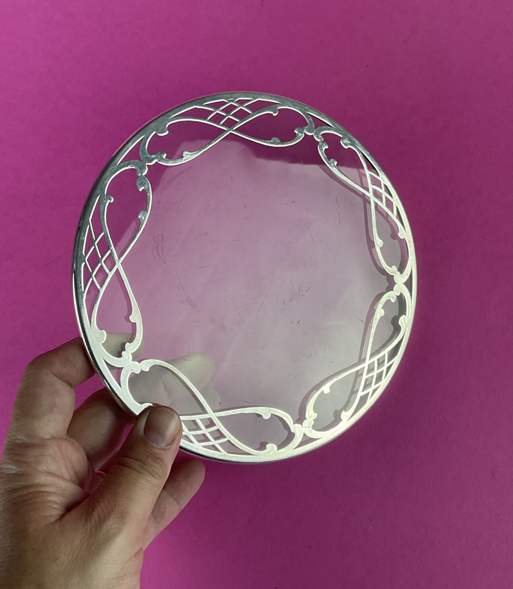 runde Glasplatte mit Overlay-Silber-Ornament, ungemarkt, tadeloser Erhaltungszustand