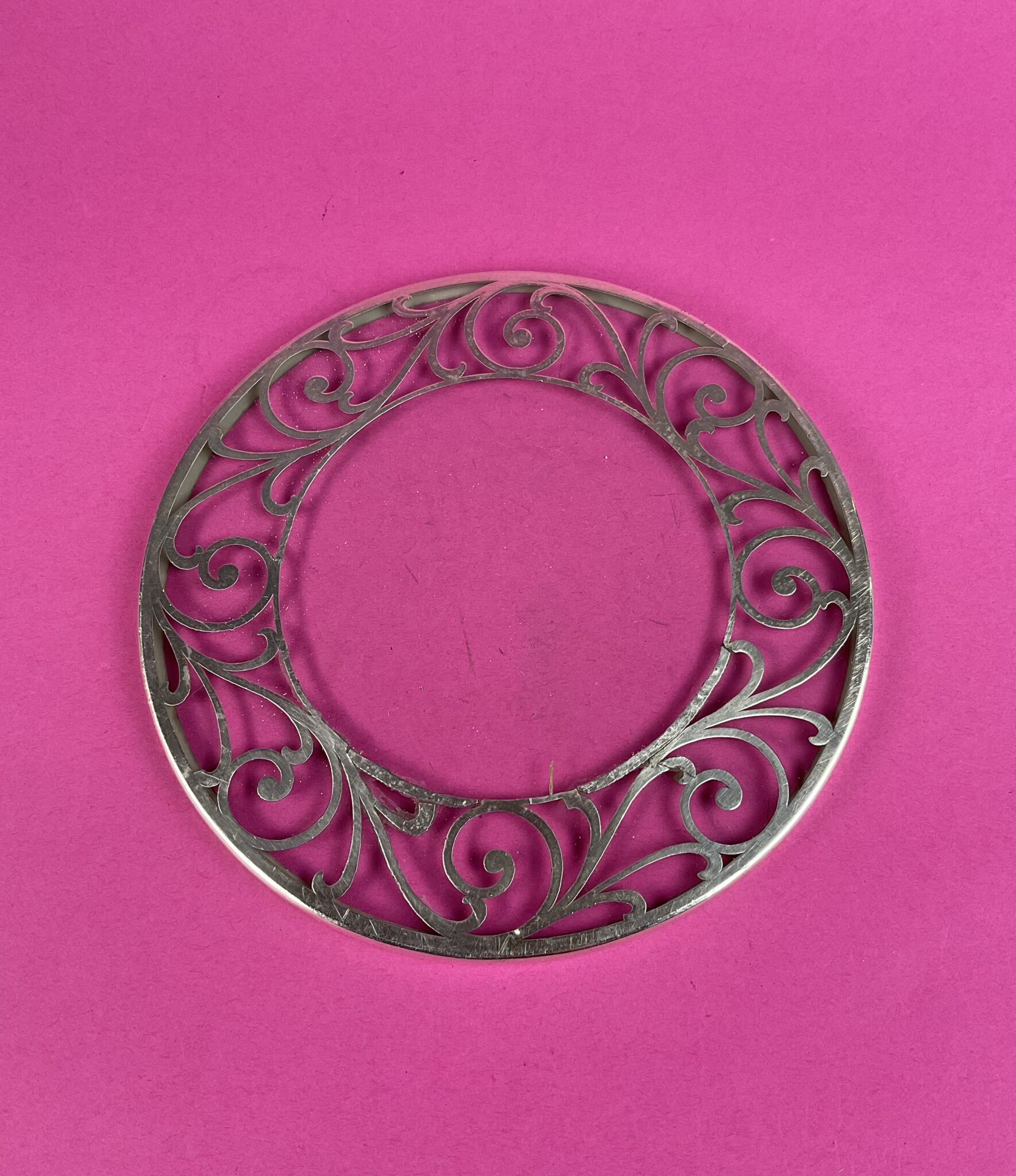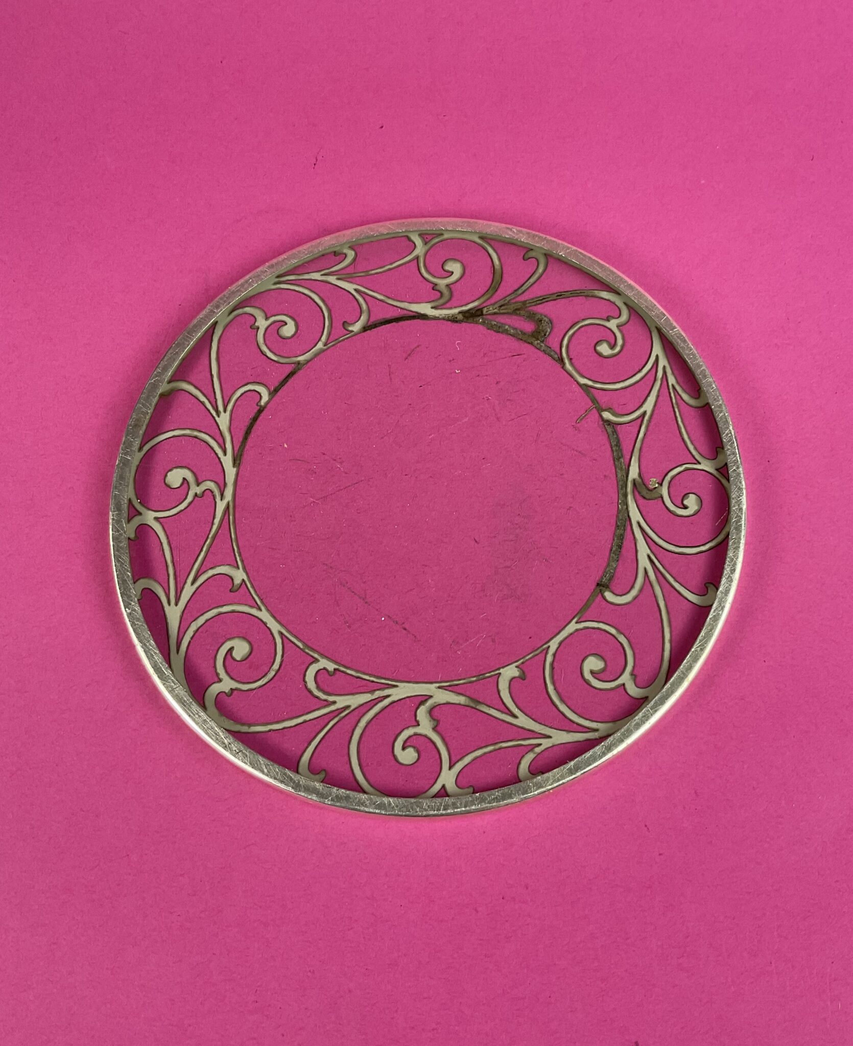 runde Glasplatte mit Overlay-Silber-Ornament, ungemarkt, handpolierter Erhaltungszustand mit Altersspuren