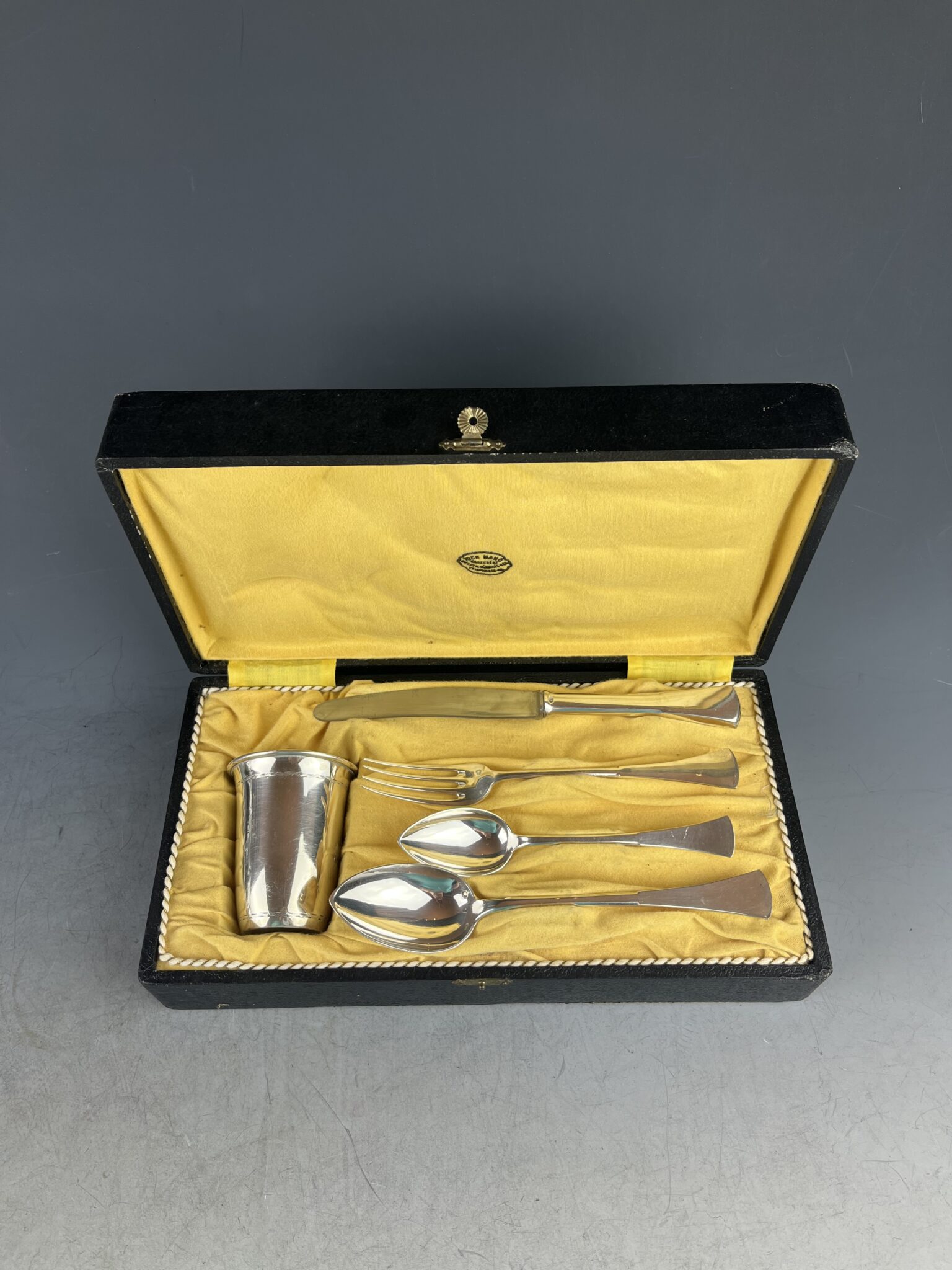 Silber, punziert mit tschechoslowakischem Beschauzeichen Bäuerin, Feingehalt 800, Firmenzeichen, bestehend aus Messer (originale, rostfreie Stahlklinge), Gabel, Löffel, Teelöffel und Taufbecher, in originaler Kassette, innen mit beigem Jersey tapeziert, handpolierter Erhaltungszustand