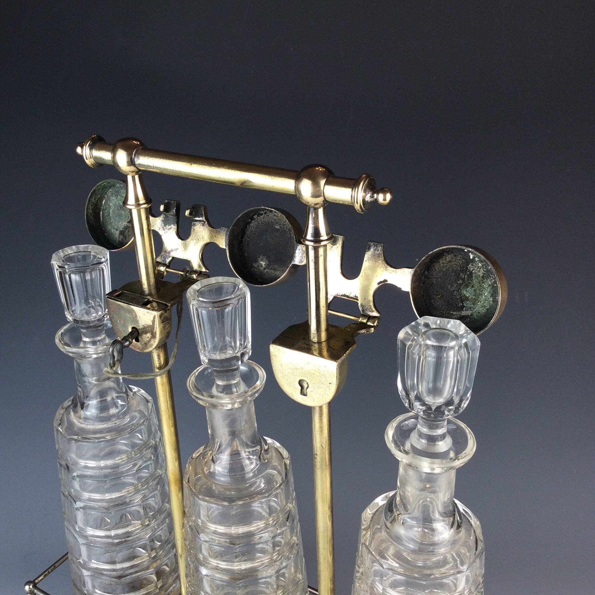 3 geschliffene Karaffen mit Stoppeln, Alpacca-Halterung für drei Karaffen, Schloss und Schlüssel (sperrt nicht), ungemarkt