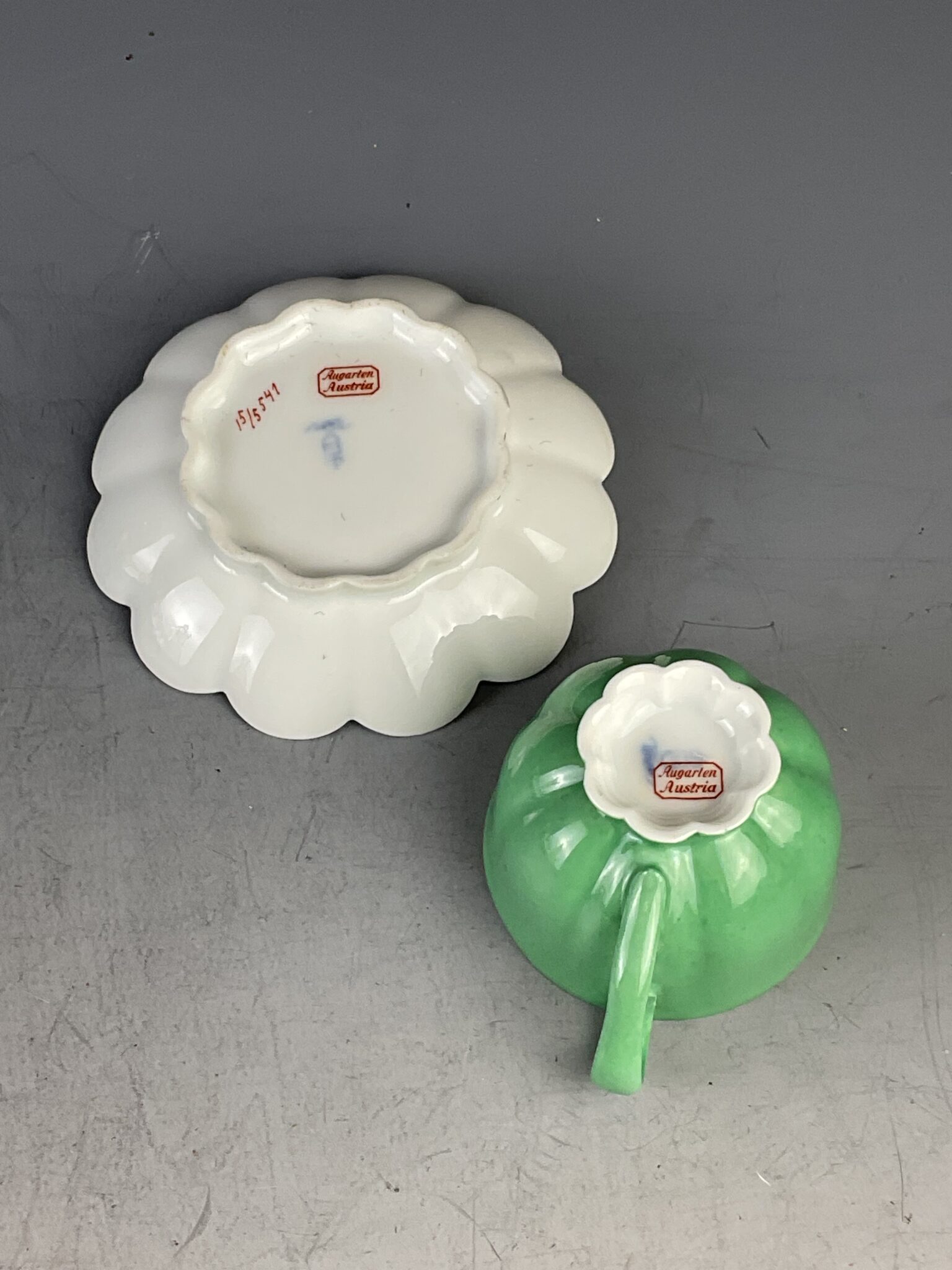 Porzellan, weiss glasiert, bunt staffiert, beide Teile gemarkt mit unterglasurblauer Manufakturmarke Augarten Wien und bekröntes Bindenschild, 15/5541, rote, achteckige Dekormarke, tadelloser Erhaltungszustand