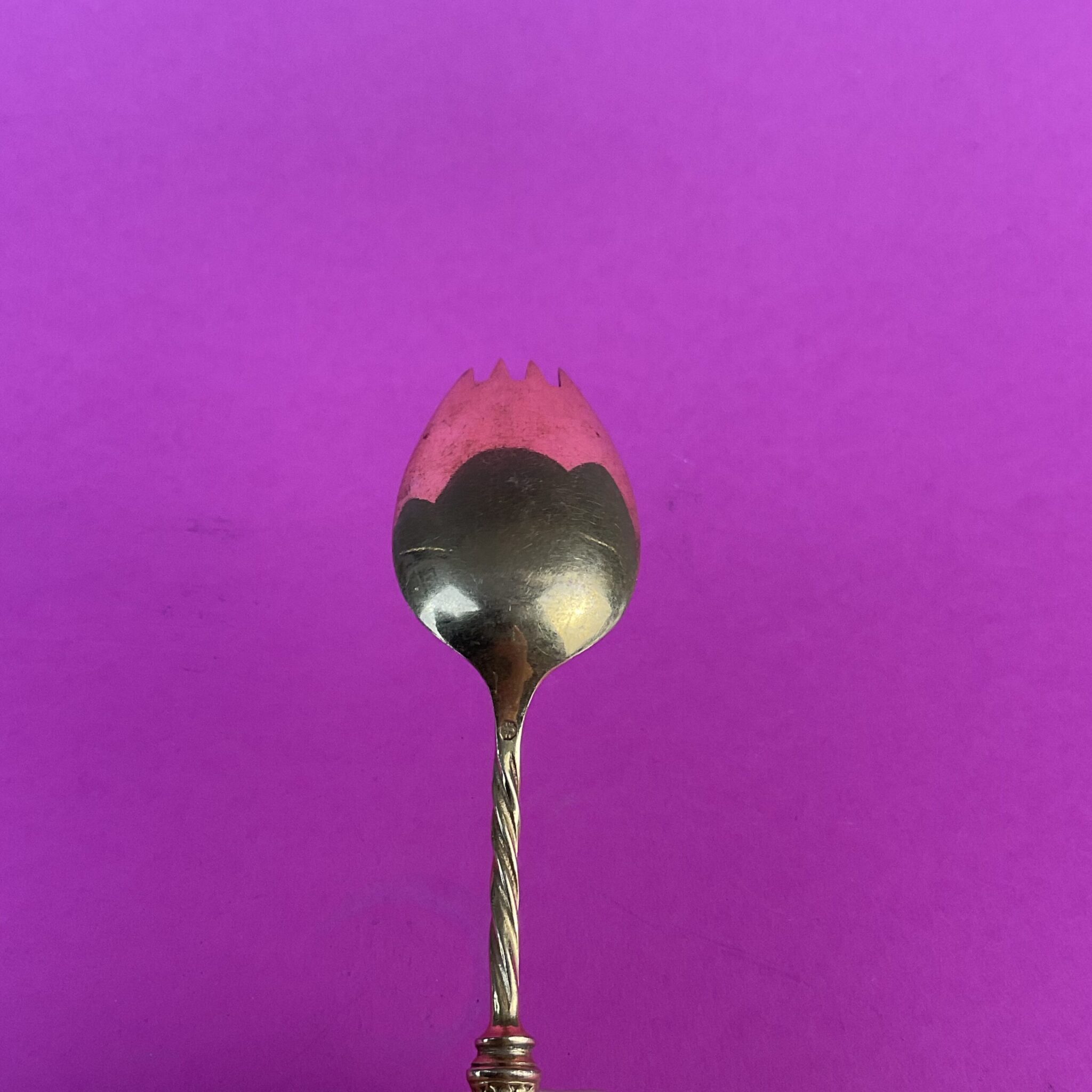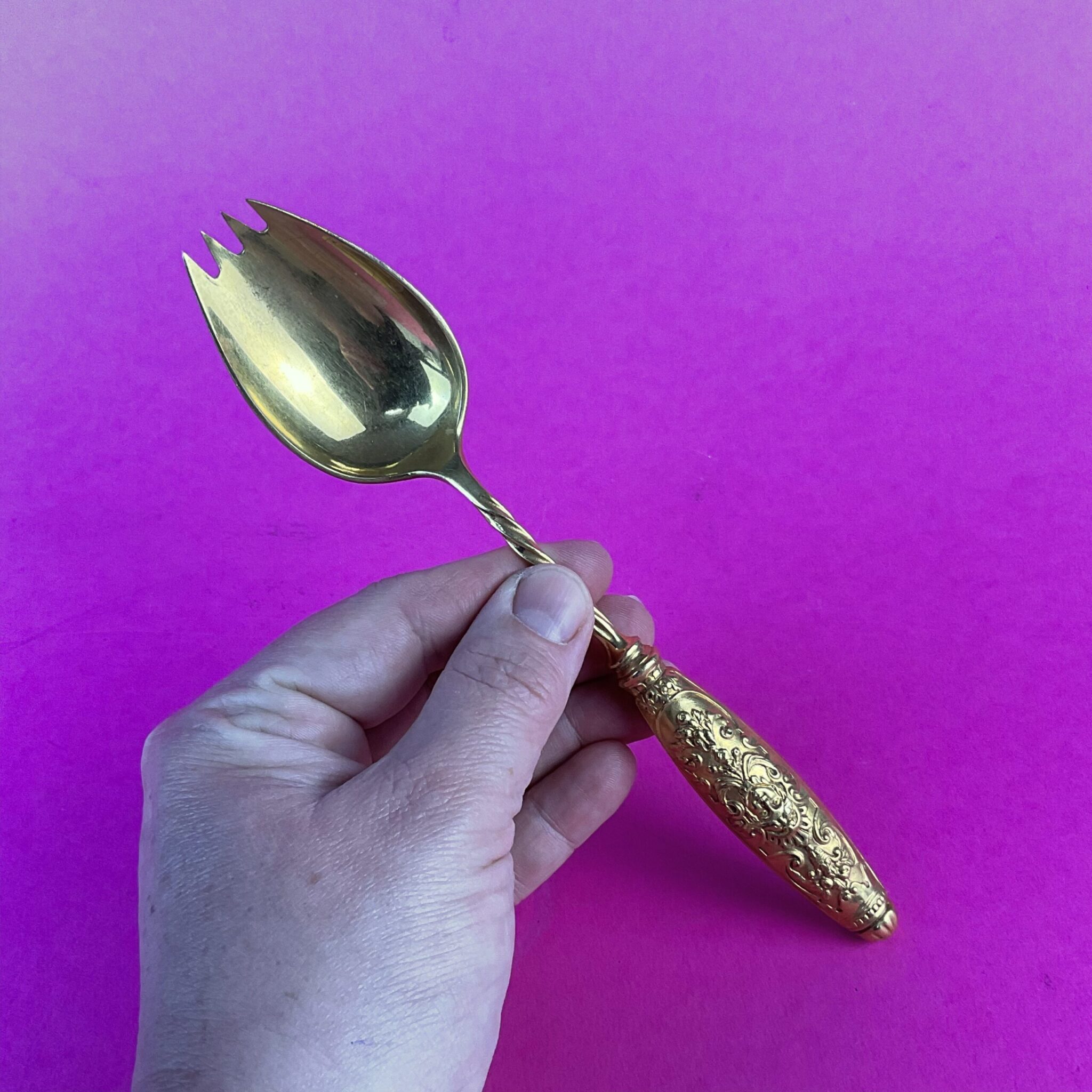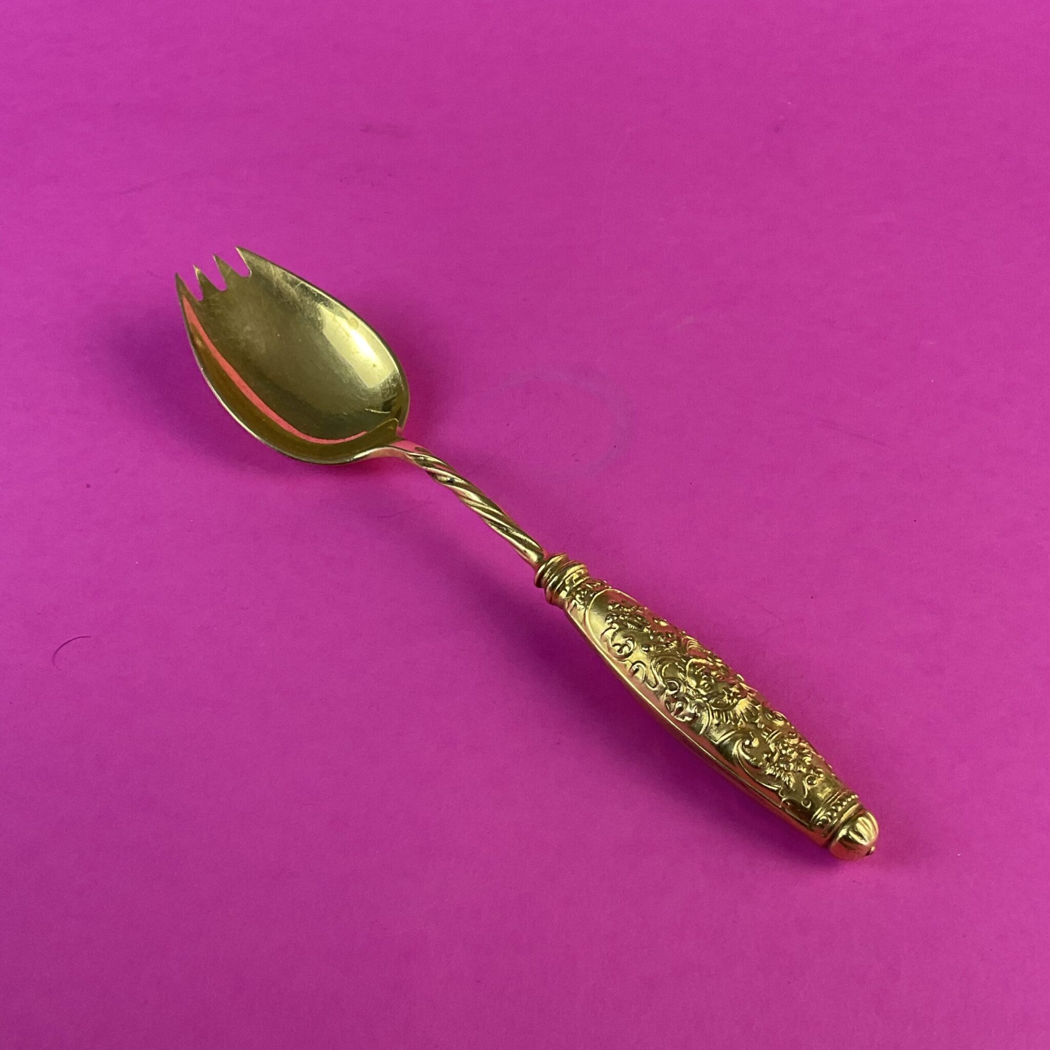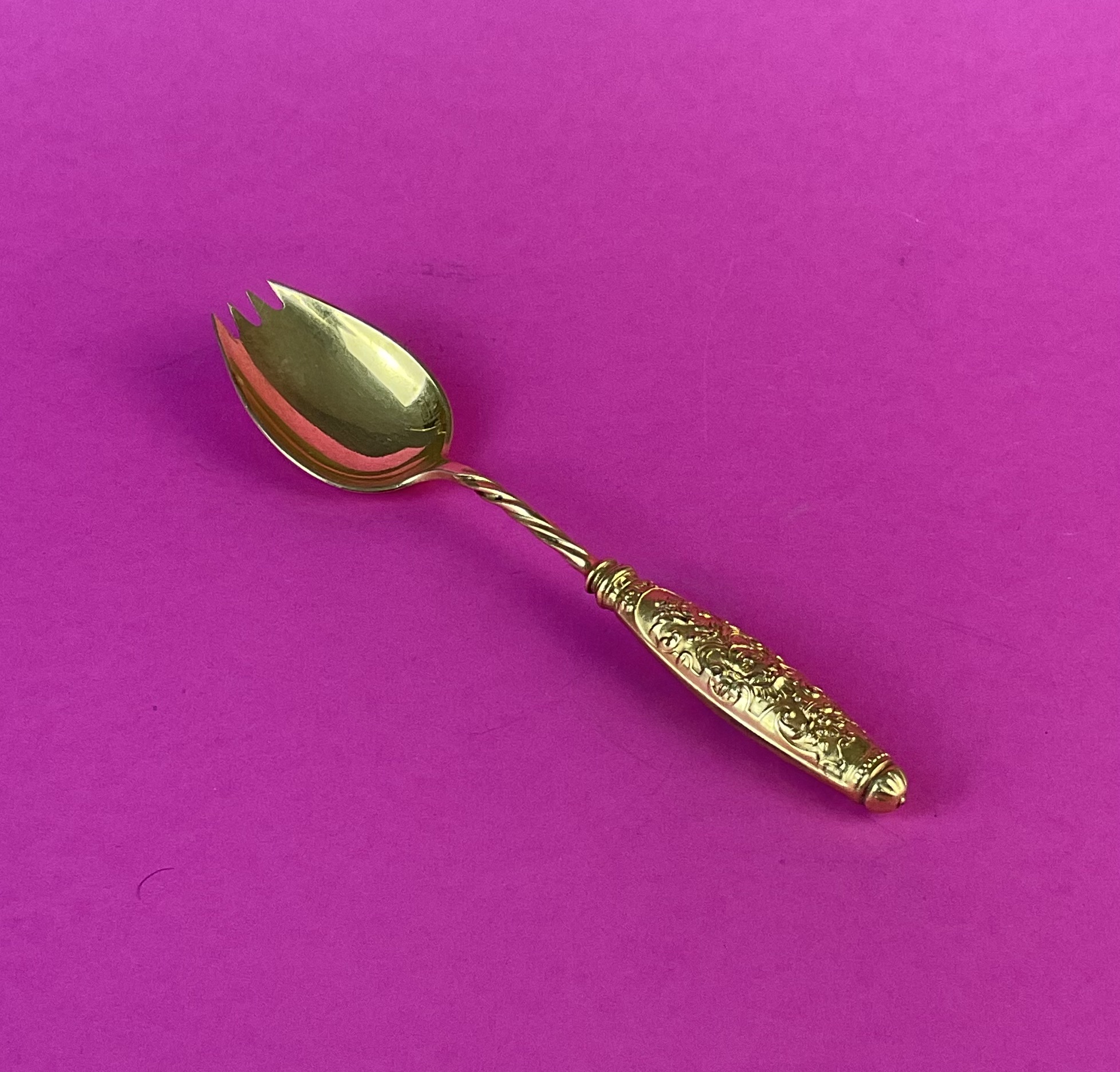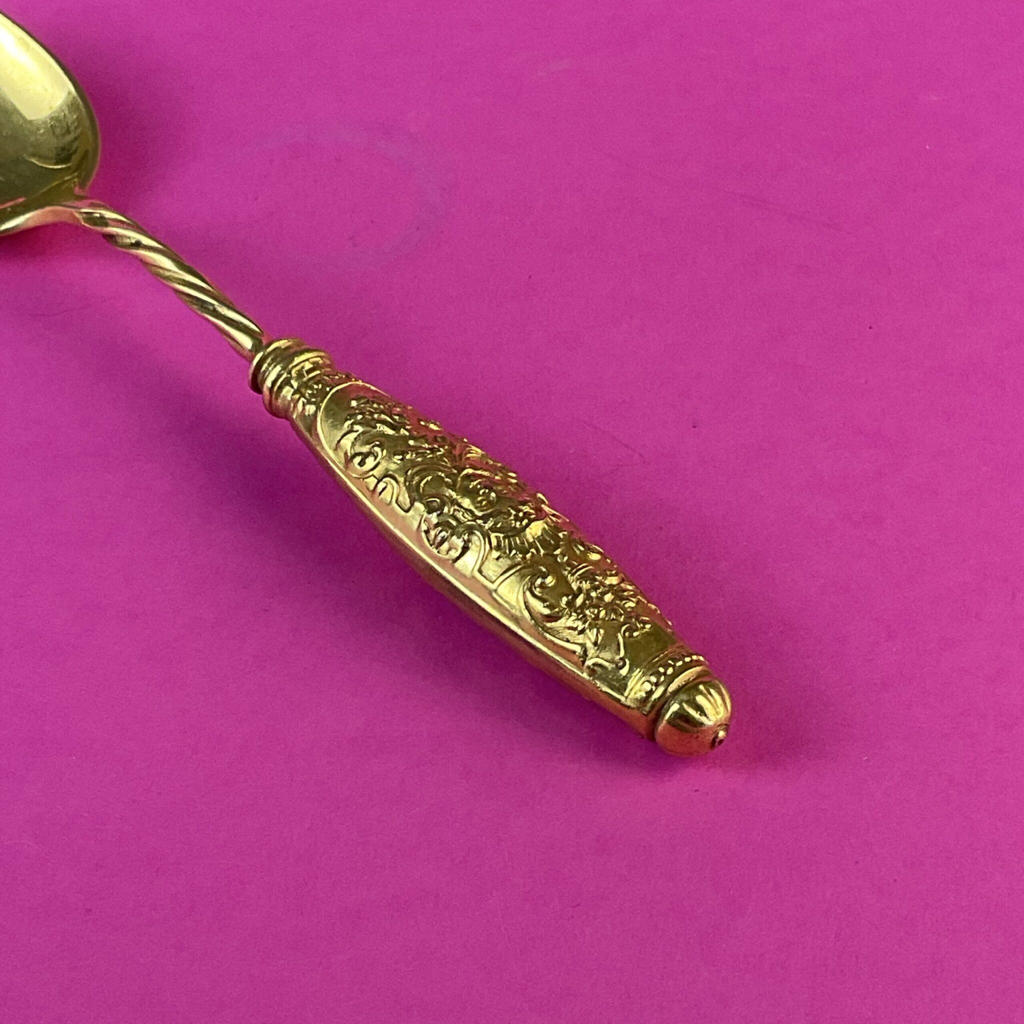Alpacca, vergoldet, rundes Hohlheft mit reliefierten Maskerons, Lasche mit vier Zinken, rückseitig gemarkt mit runder Bärenmarke, tadelloser Erhaltungszustand