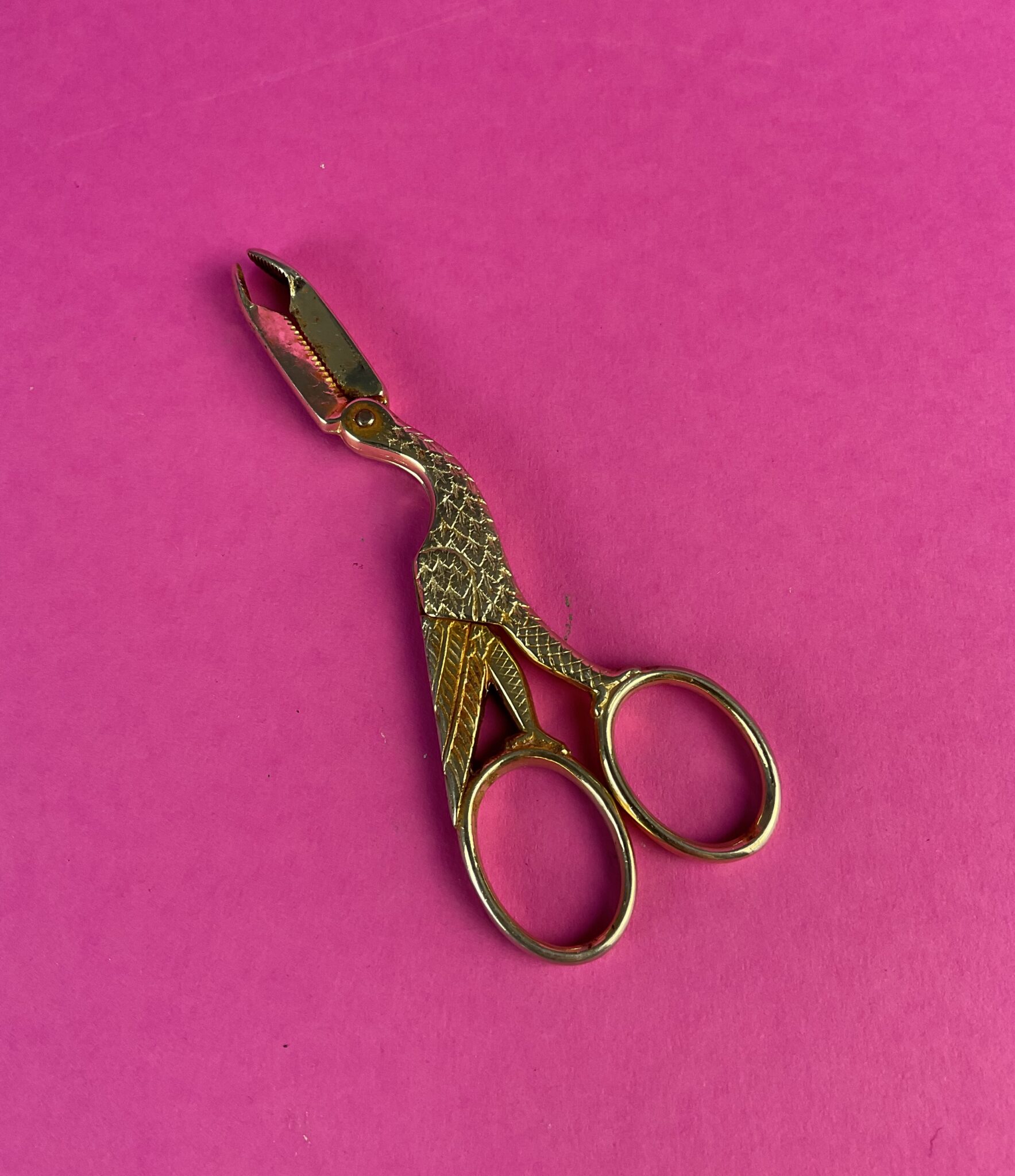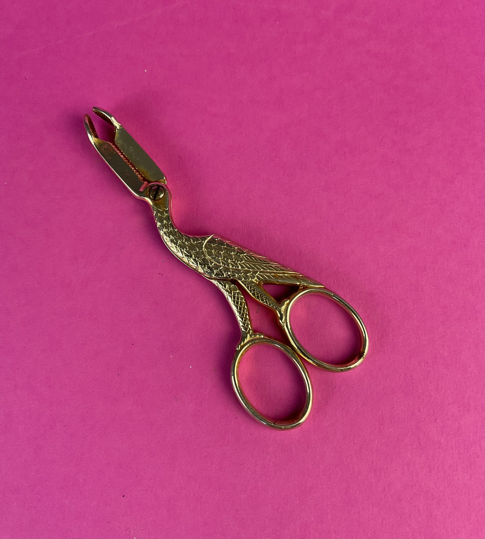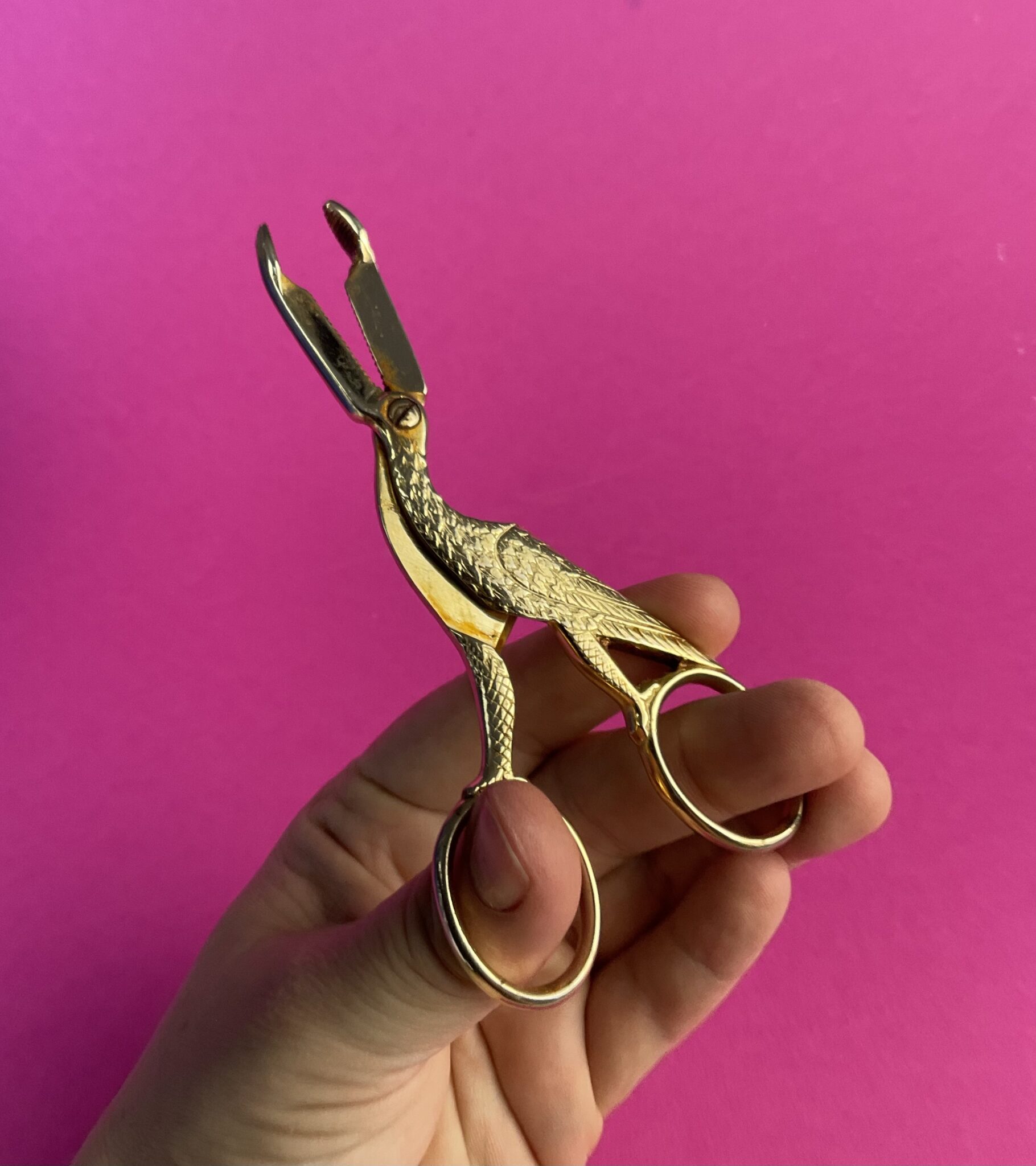 Stahl, vergoldet, Schere mit reliefiertem Pelikanmotiv, Scharnier als Auge, ungemarkt, Gebrauchspuren