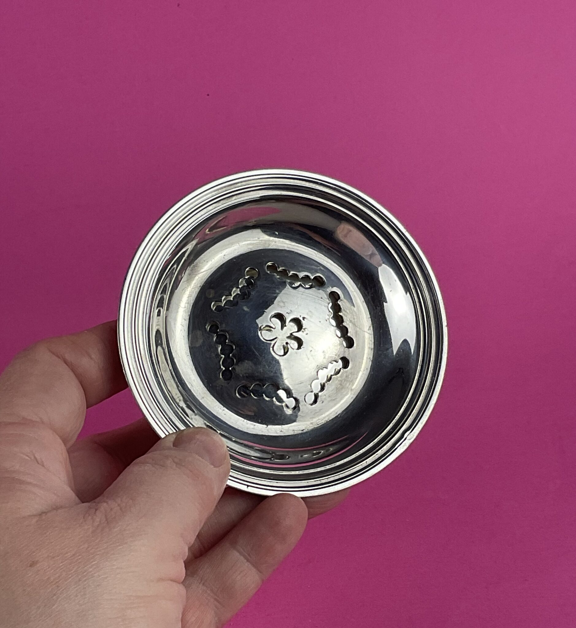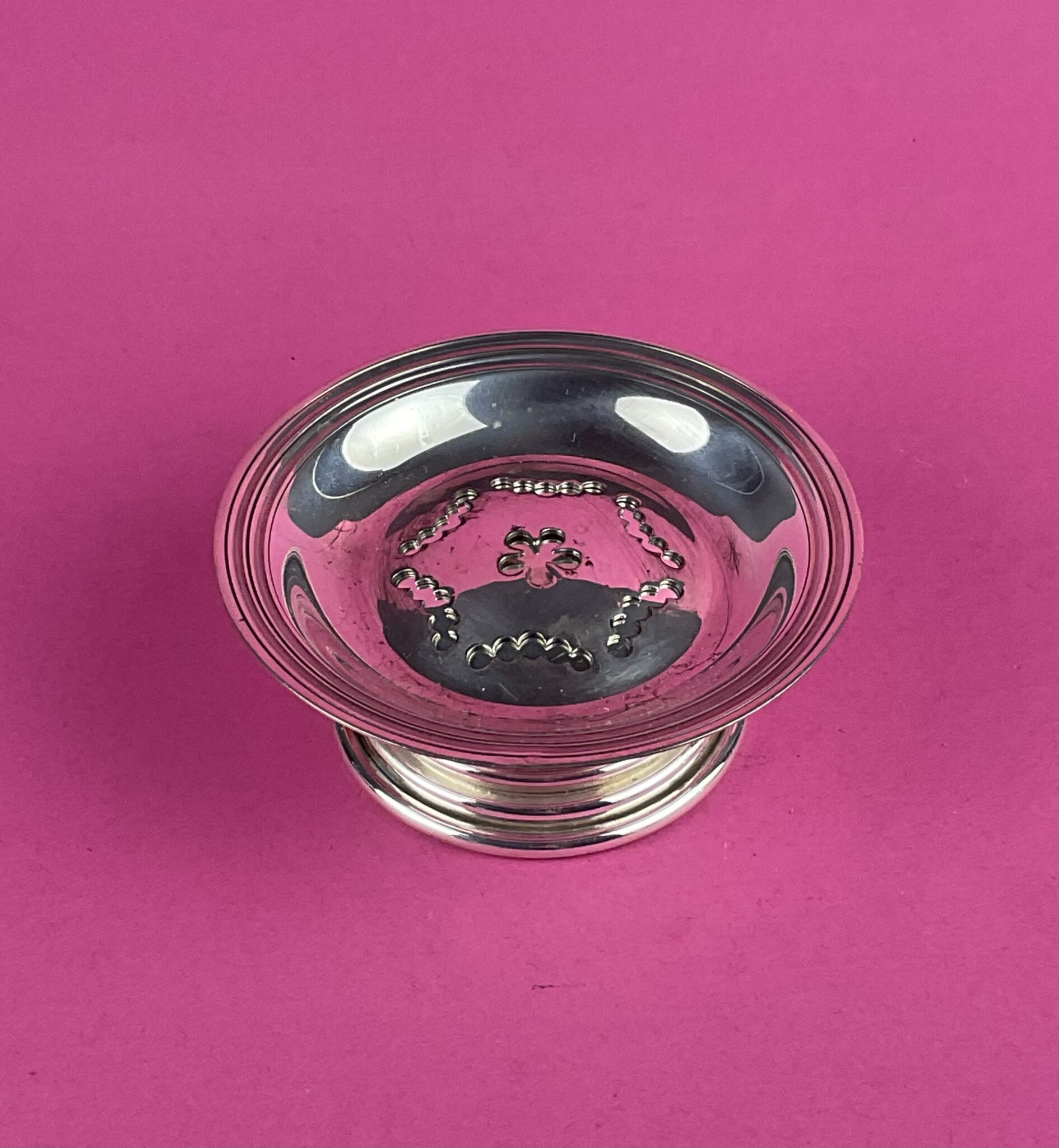 Alpacca, versilbert, perforierte Schale mit profiliertem Rand, runder Presseinsatz, ungemarkt, handpolierter Zustand