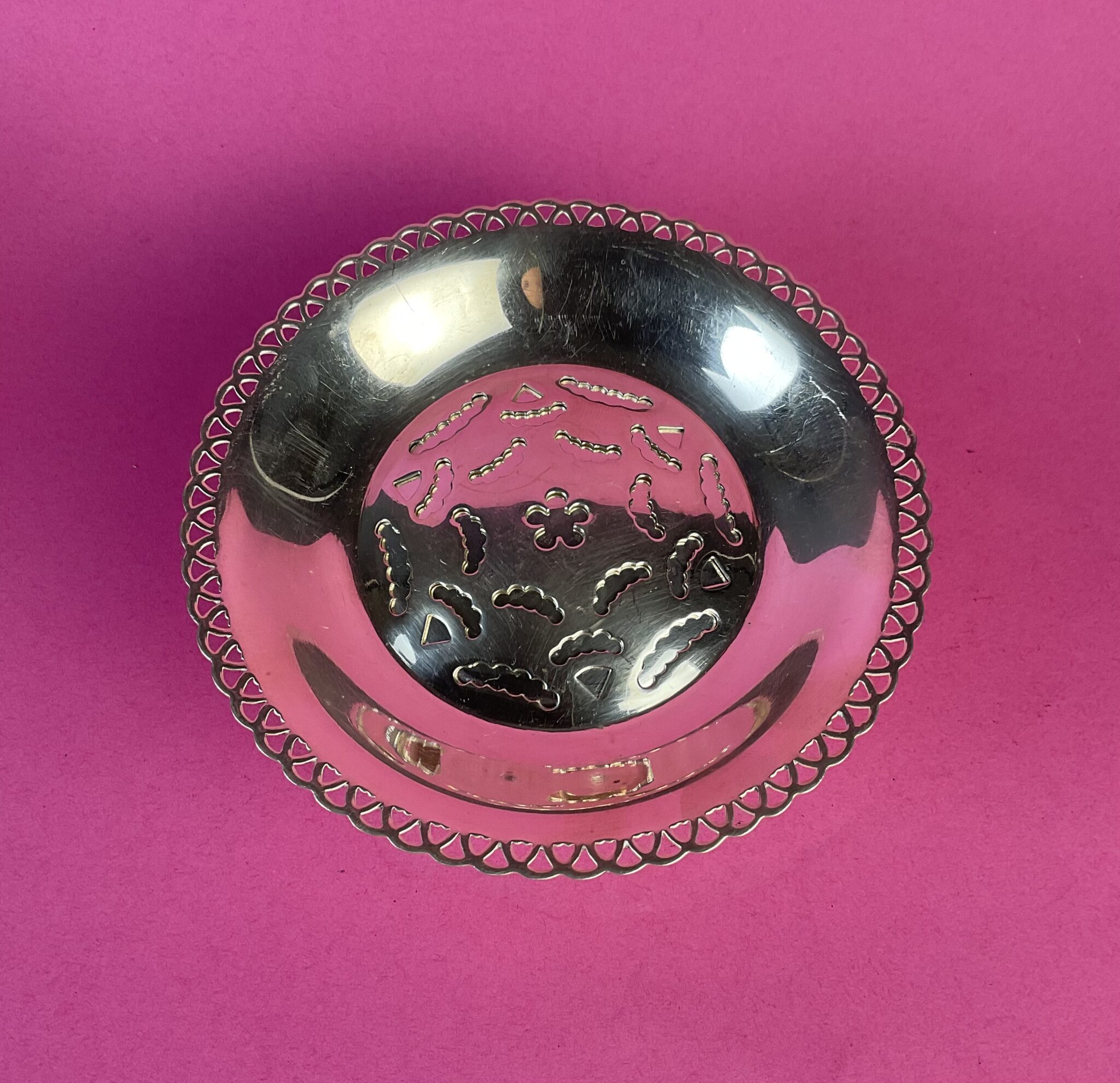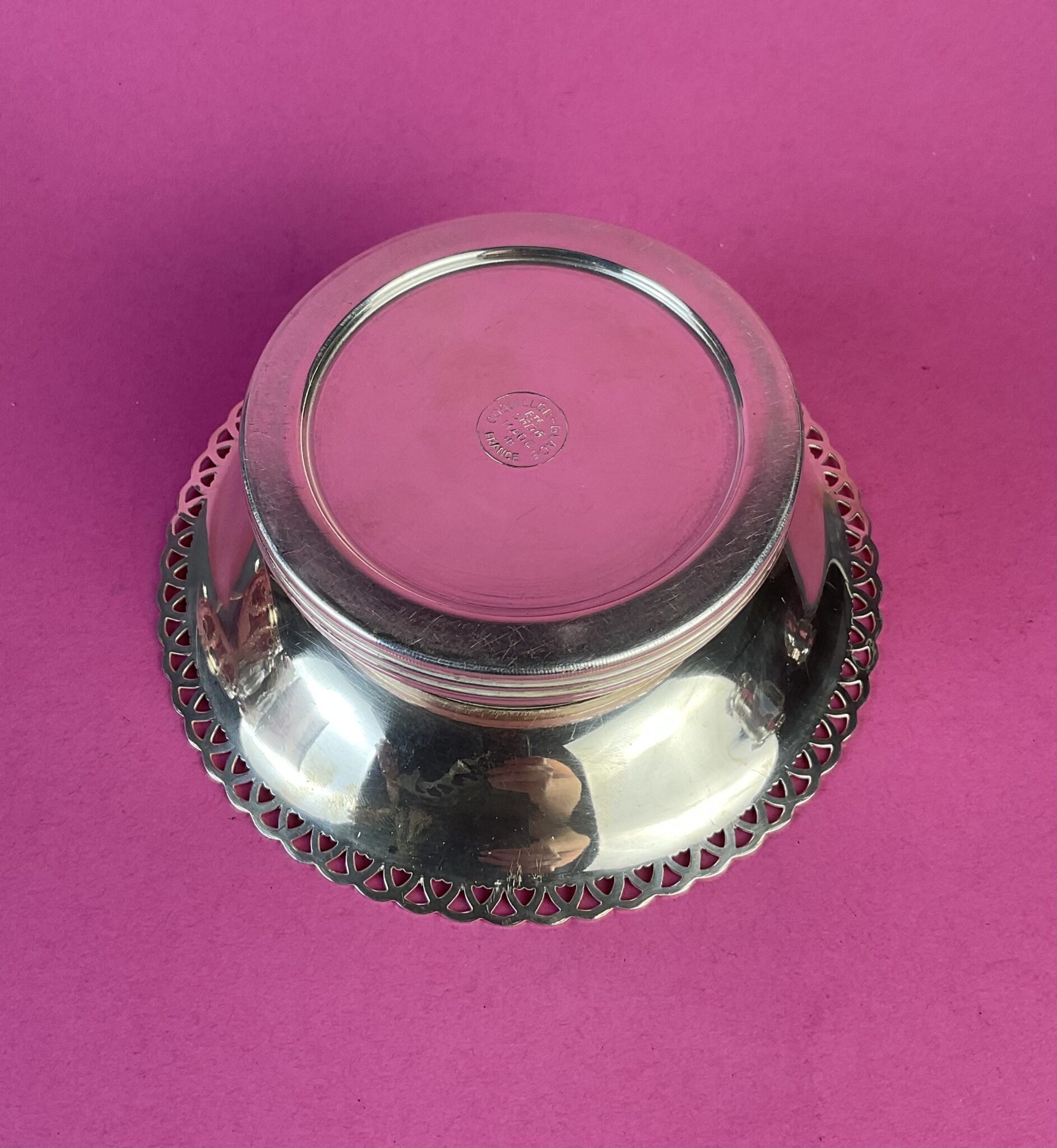 Alpacca, versilbert, perforierte Schale mit Korbrand, runder Presseinsatz, dieser für Eis aufschraubbar, gemarkt „Coquillor Glace, Made in France“, tadelloser Erhaltungszustand