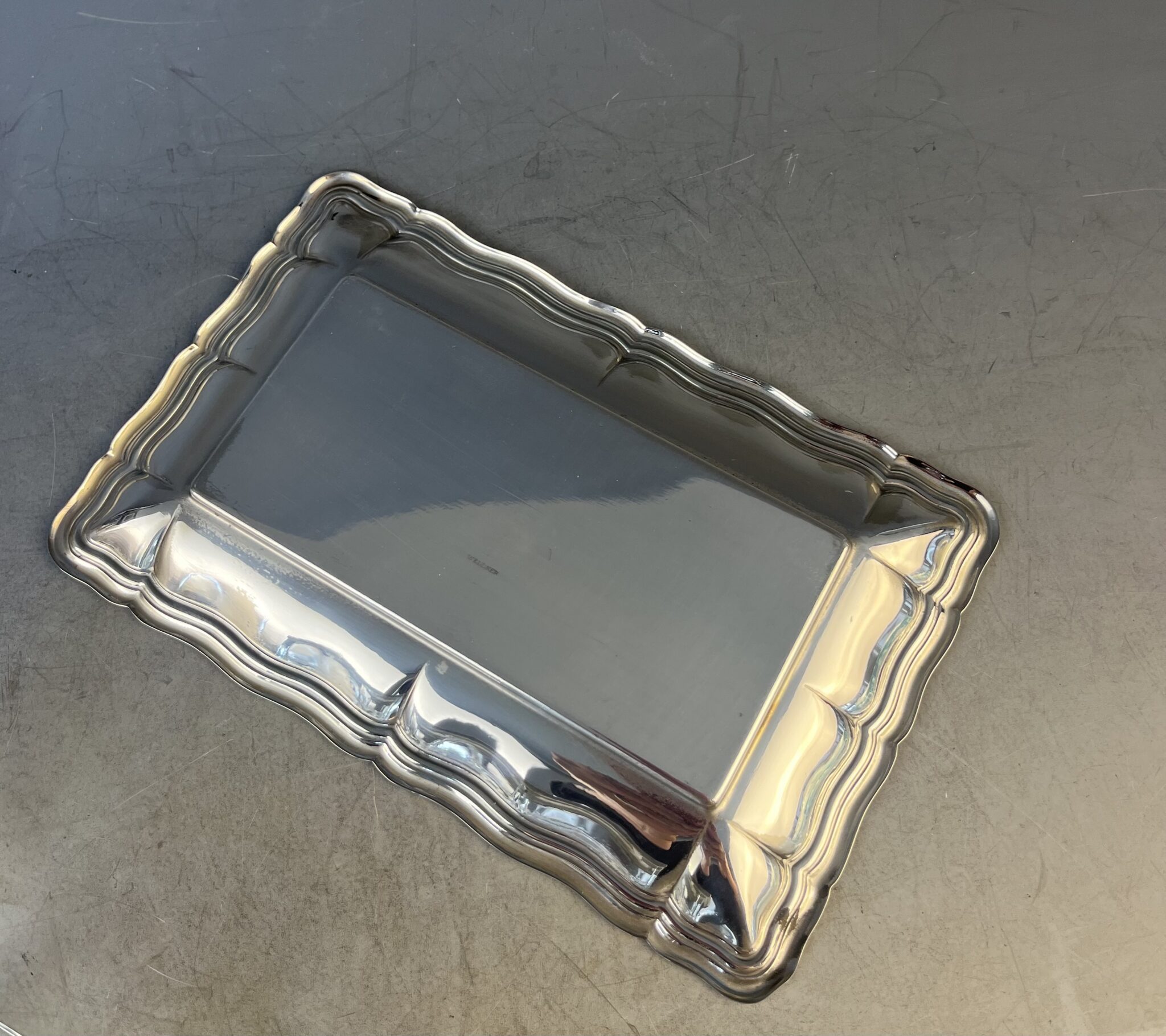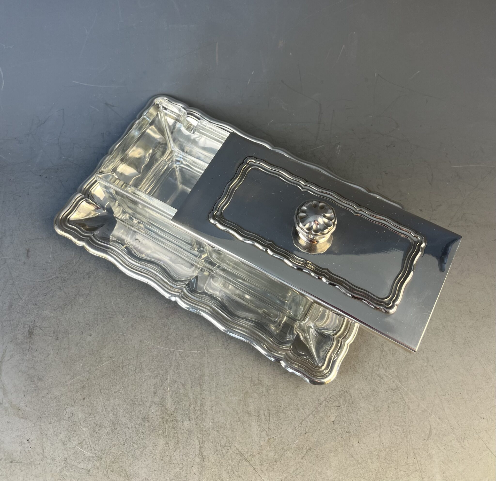 Alpacca, versilbert, rechteckige Grundform, gemarkt WELLNER, rechteckiger, optisch geblasener Glaseinsatz, Deckel mit seitlichem Schiebemechanismus, tadelloser, handpolierter Erhaltungszustand