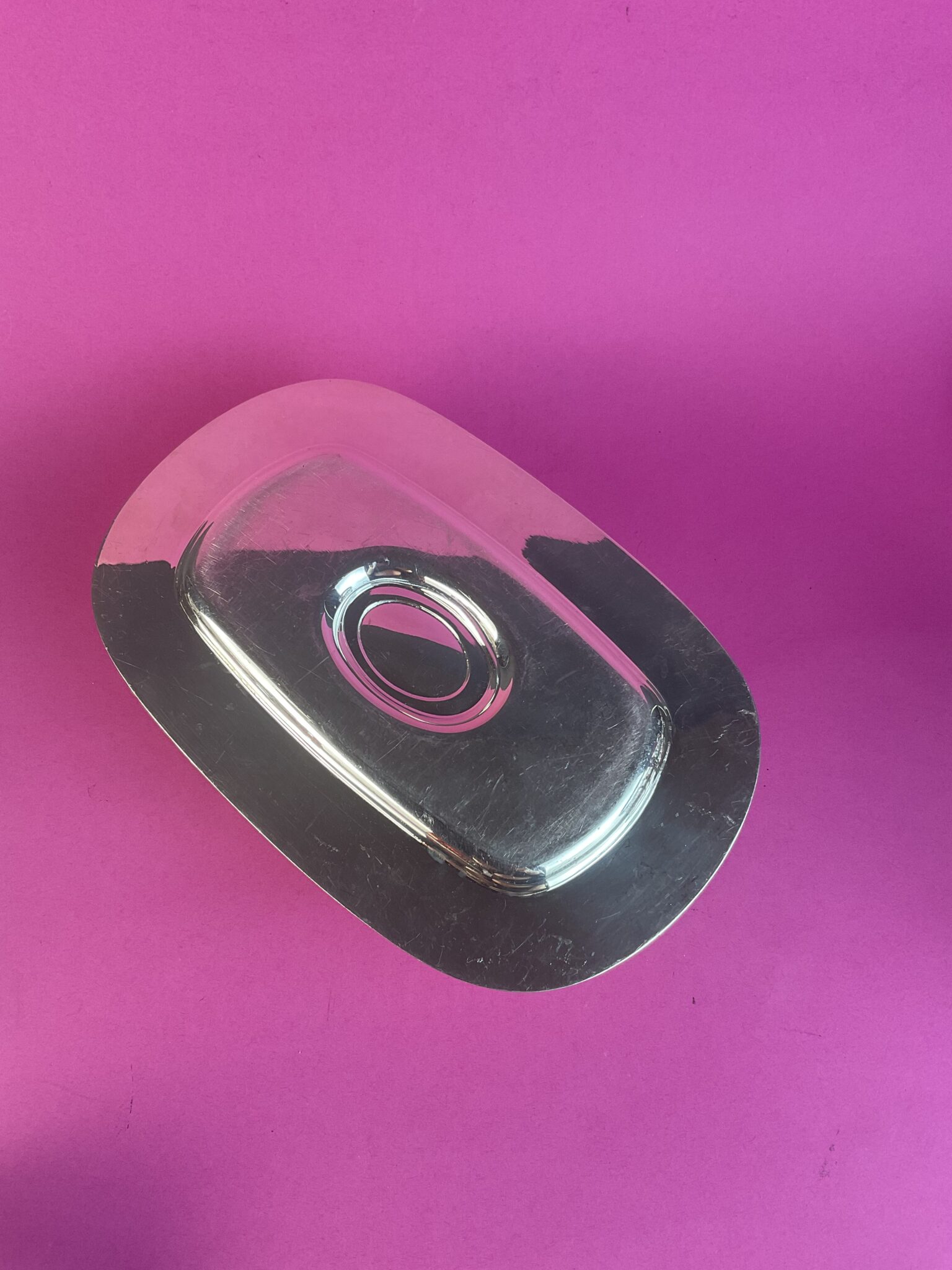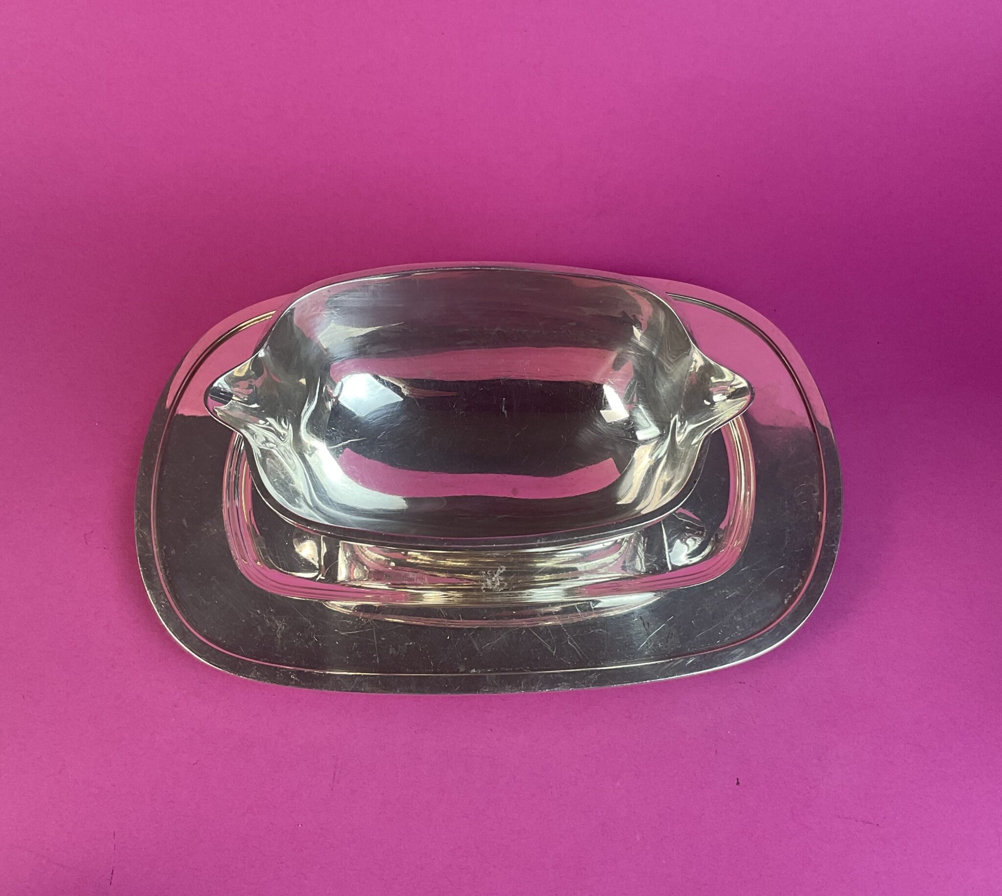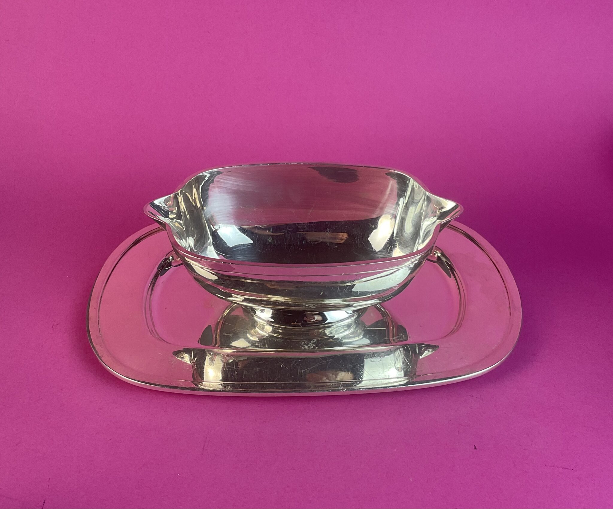 Metall, massiv versilbert, ovale Saucière auf Untersatz, fest verlötet, zwei seitliche Schnabelausgüsse, gemarkt mit französischer Herstellermarke, geringe Gebrauchsspuren