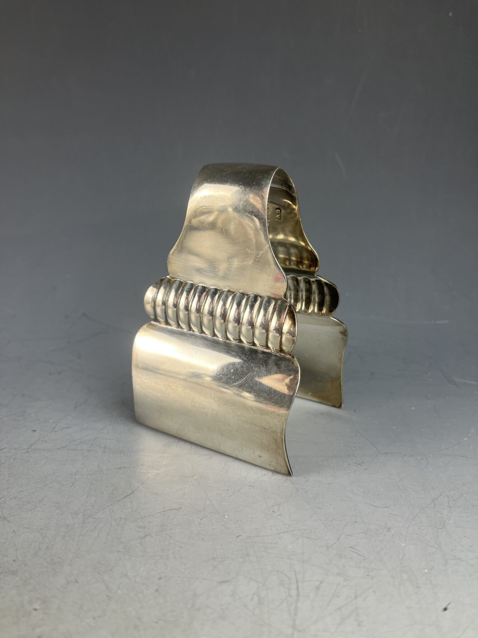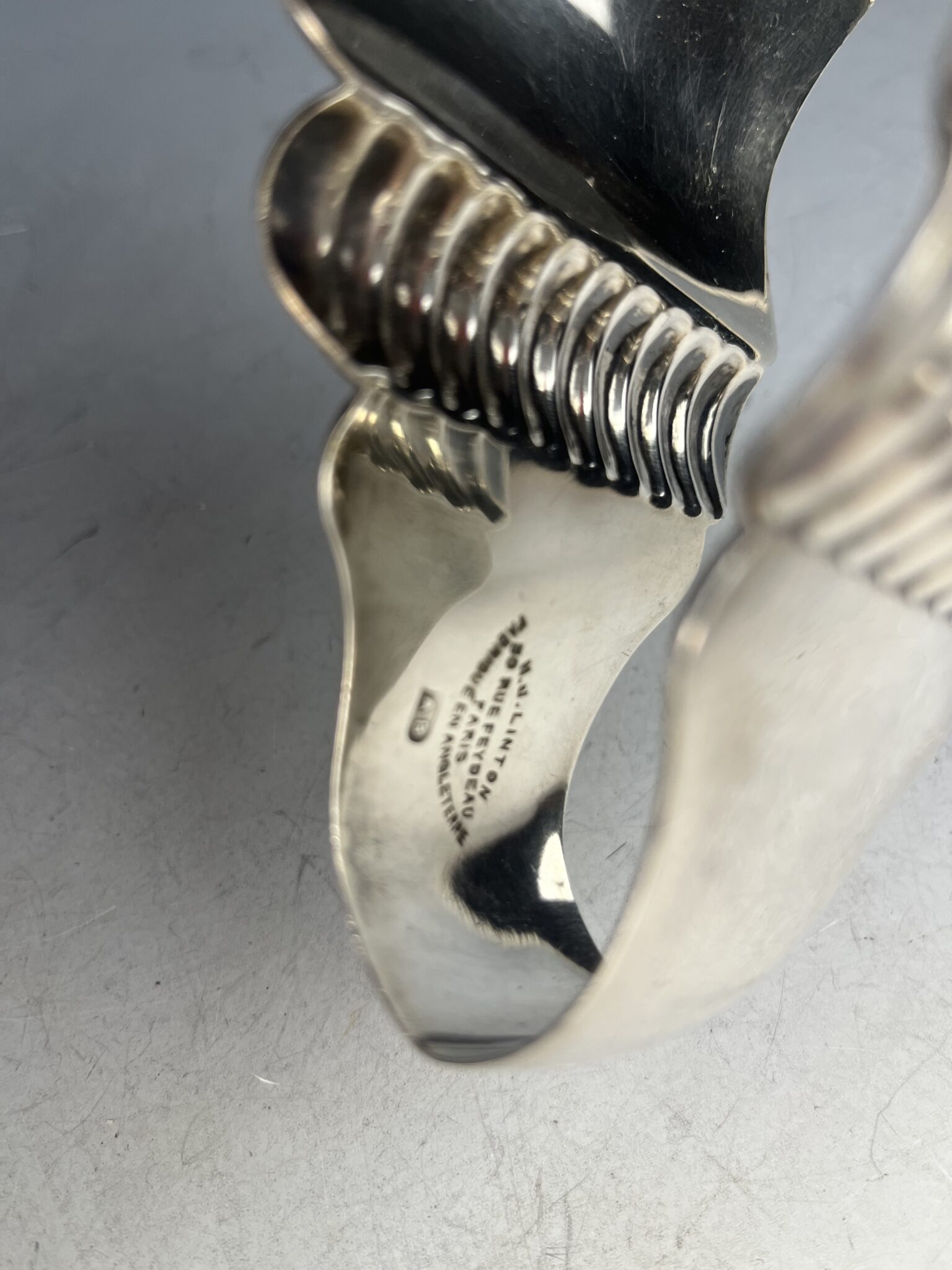 Alpacca, stark versilbert, kurze Zange mit Spannung, zwecks Greiffunktion, innen gemarkt mit französischer Herstellermarke J. Linton, 50, Rue Feydeau, Paris, handpolierter, tadelloser Erhaltungszustand