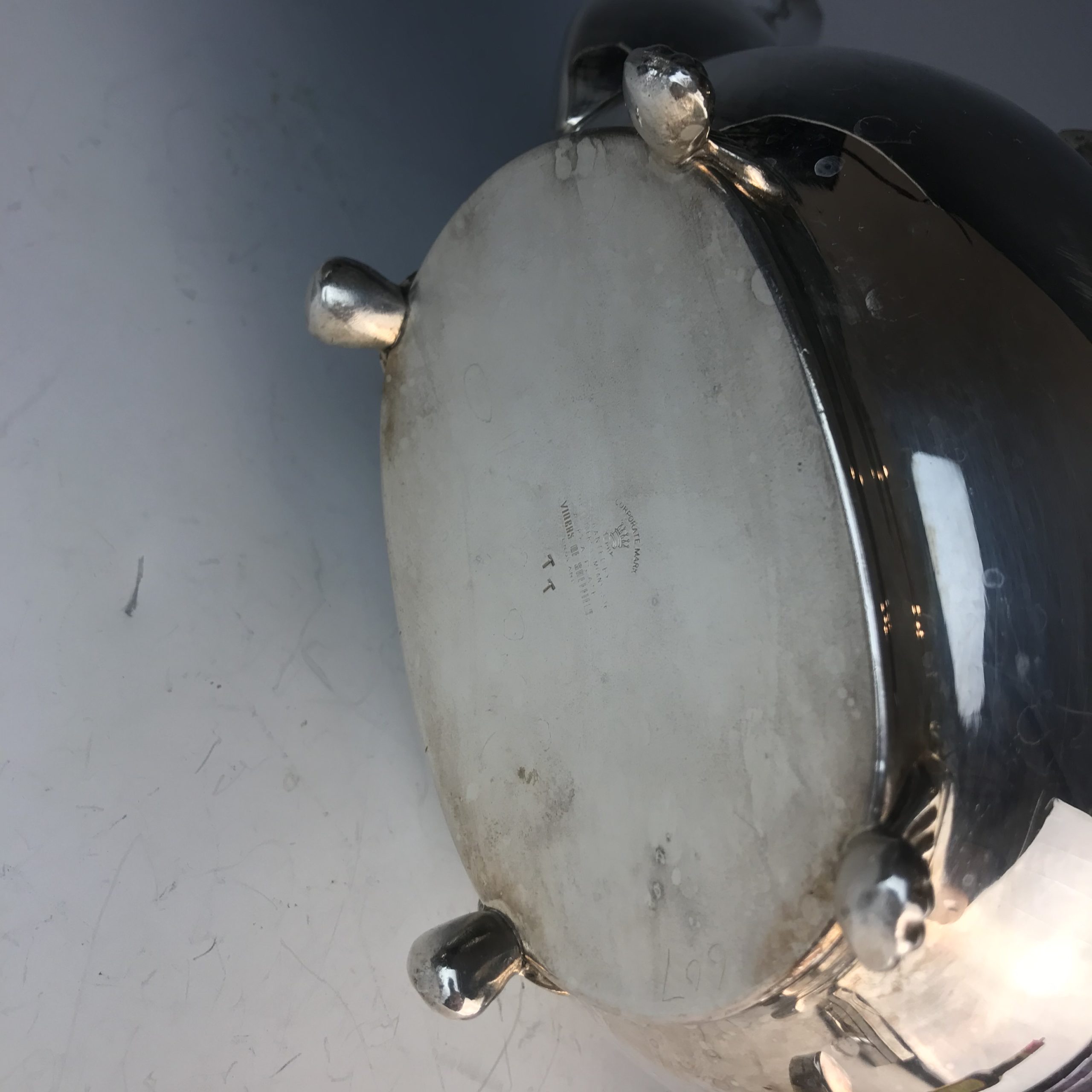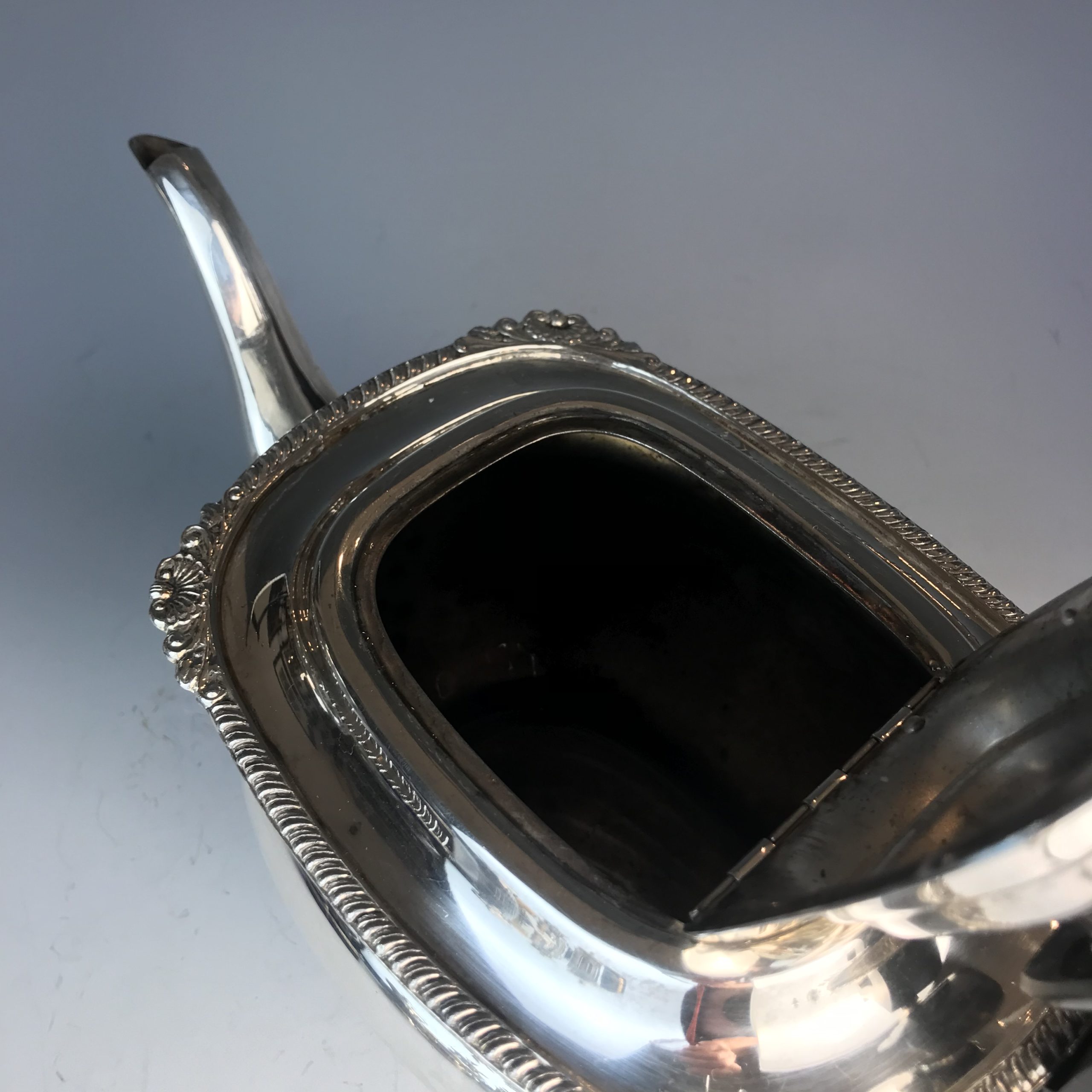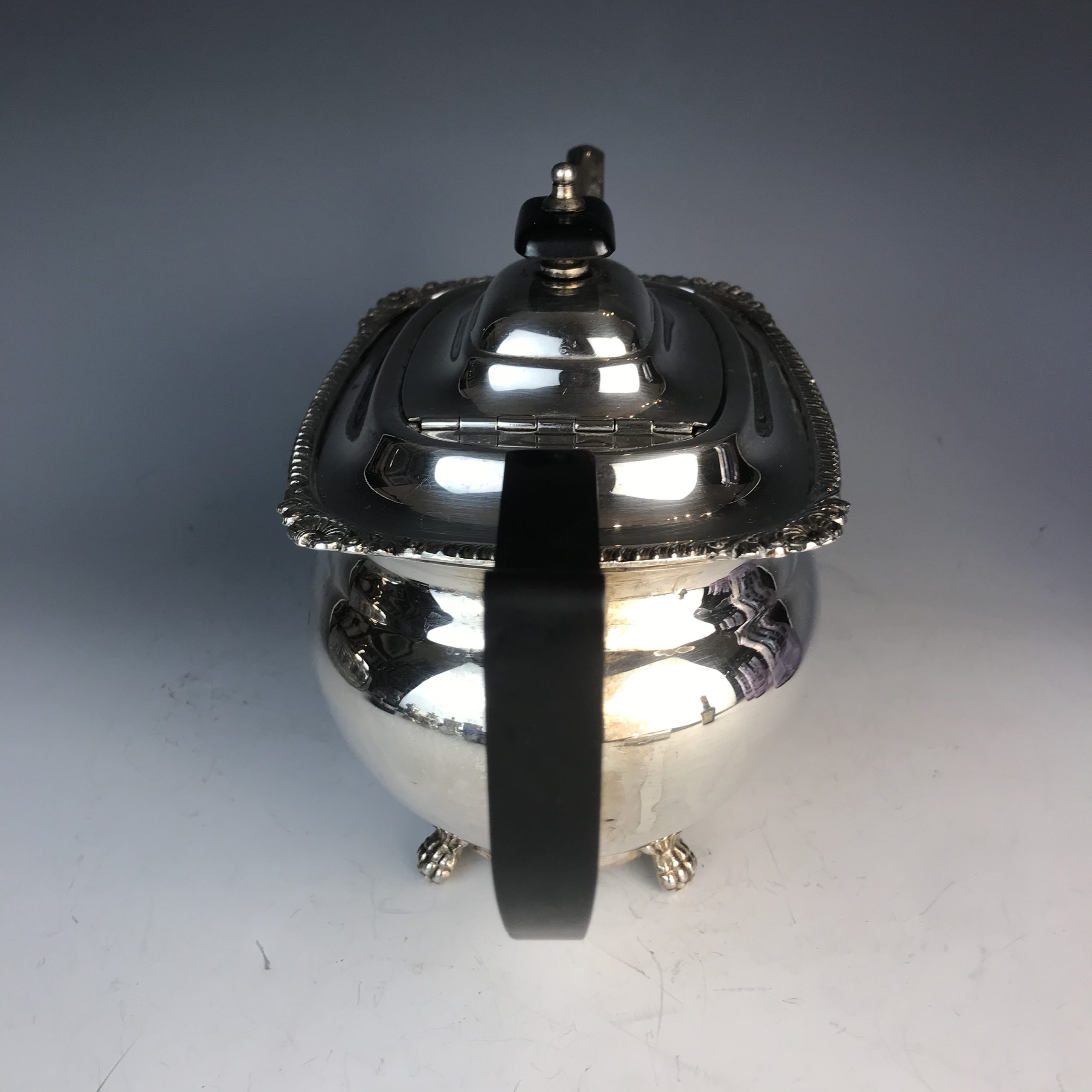 Metall, stark versilbert, auf vier Prankenfüsschen, Abschlusskante mit Muschelmotiv, Scharnierdeckel mit isolierendem Bakeliteknauf, am Boden gemarkt COPORATE MARK ALPHA PLATE VINERS OF SHEFFIELD ENGLAND, kantiger, isolierender Bakelitehenkel