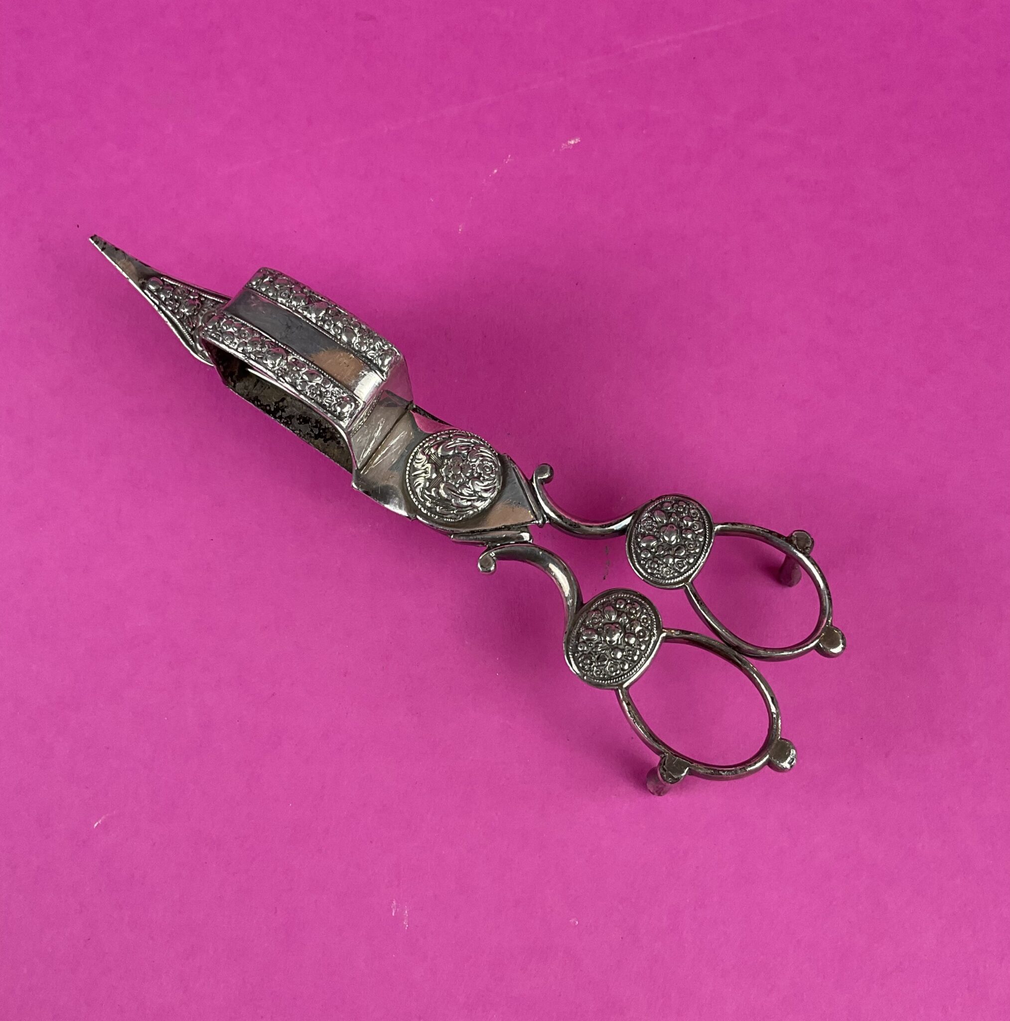 Kupfer, versilbert, auf drei Beinen, Schere mit Federmechanismus, Scharnier mit plastischer Rosette, Löschkasten mit Rosenband, ungemarkt, altersbedingt minimale Gebrauchsspuren