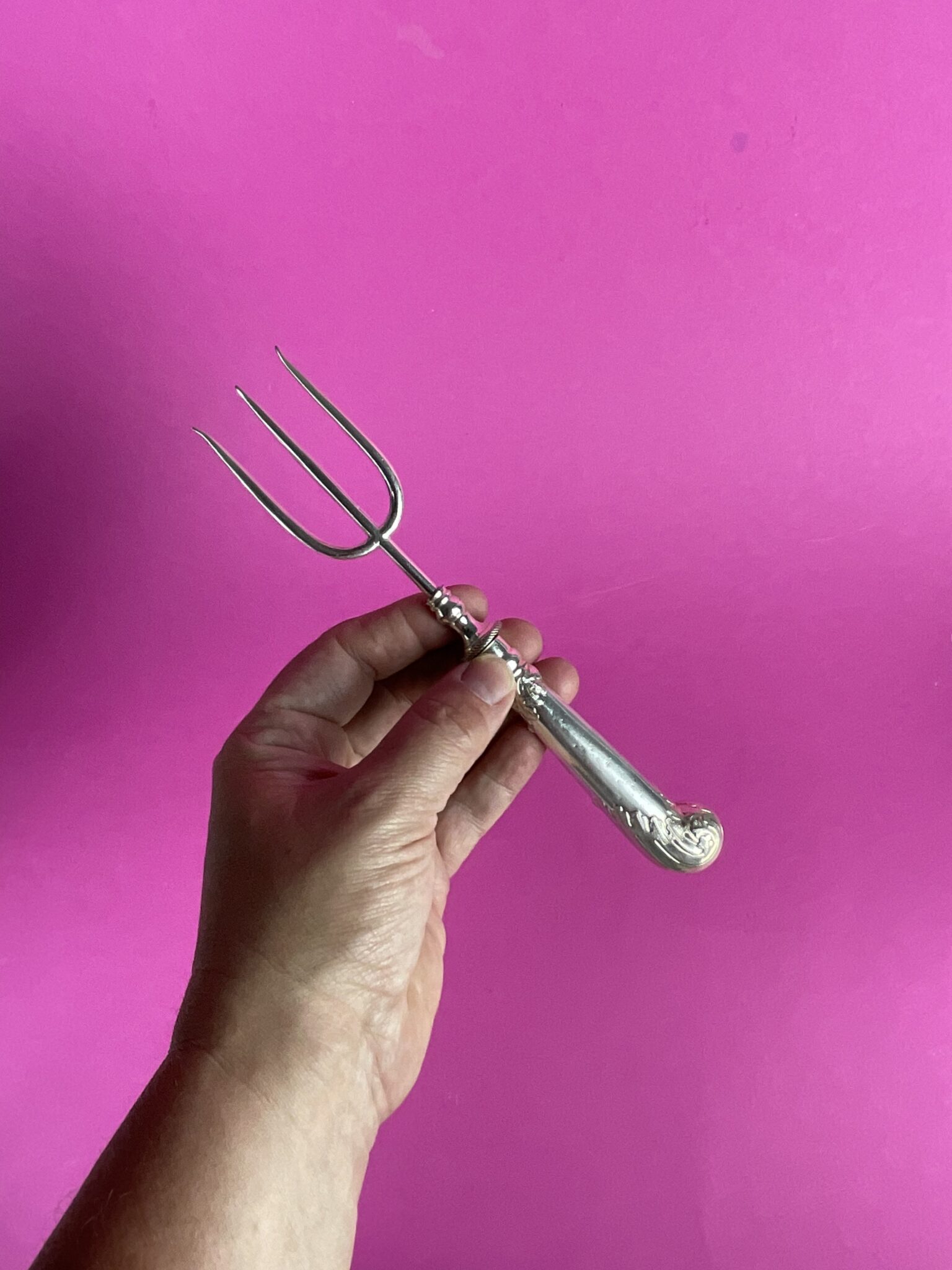 Annettes Etikette: Diese Dreizack-ähnliche Gabel geht auf eine Befindlichkeit der Engländer zurück. Sie reichen das lasche, erst durch Toasten an Gestalt gewinnende Weissbrot mit dieser Gabel vom Toaster in das dafür bereit gestellte Toastrack. Das alles nur, um sich die Finger nicht zu verbrennen. Hier gefällt mir das gefährlich aussehende Tischgerät, welches für so schwache Mitbestreiter wie Toast bei Tisch gedacht ist.