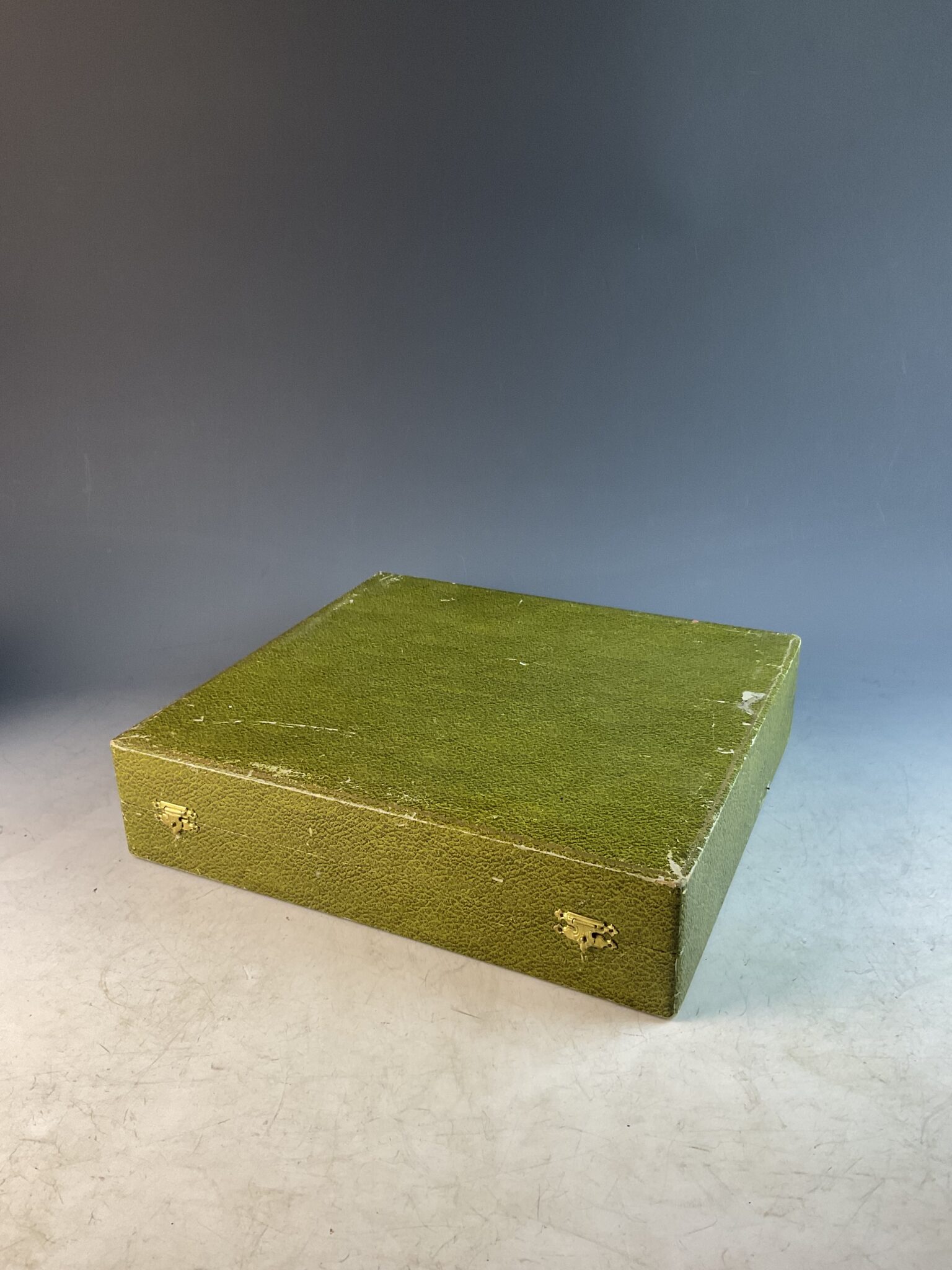 Alpacca, versilbert, bestehend aus Teller, Taufbecher, Serviettenring, Eierbecher und 3 teiligem Besteck, alle mit korrespondierender Dekor „Rubans“, gemarkt ALFENIDE, in originaler, grüner Geschenkskassette, innen mit hellem Satin tapeziert