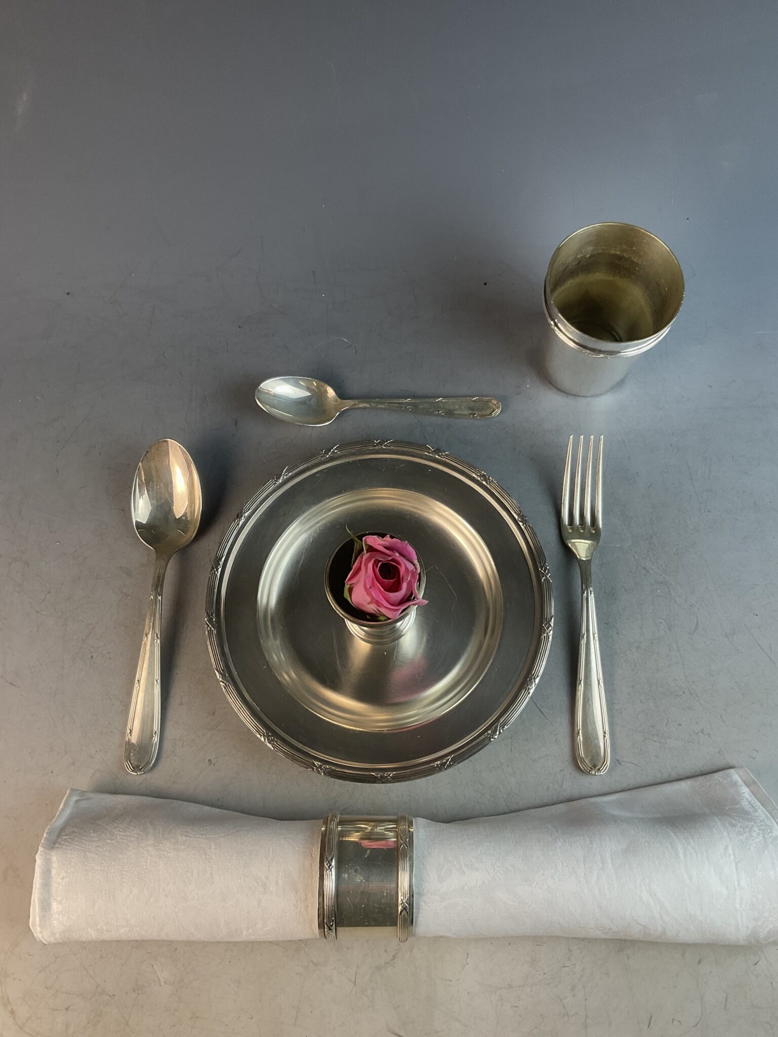 Annettes Etikette: Speziell zur Taufe ist es Tradition dem neugeborenen Erdenbürger einen silbernen Taufbecher zu schenken. Meist wird der Name des Täuflings graviert, bei den in Adelskreisen weit verbreiteten, vielen Vornamen, bedeutet dies ein Bravourstück für den Graveur. Hier ist sogar eine ganze Taufgarnitur mit Teller, Becher, Besteck, Serviettenring und Eierbecher für den Täufling in dekorativem Etui erhalten.