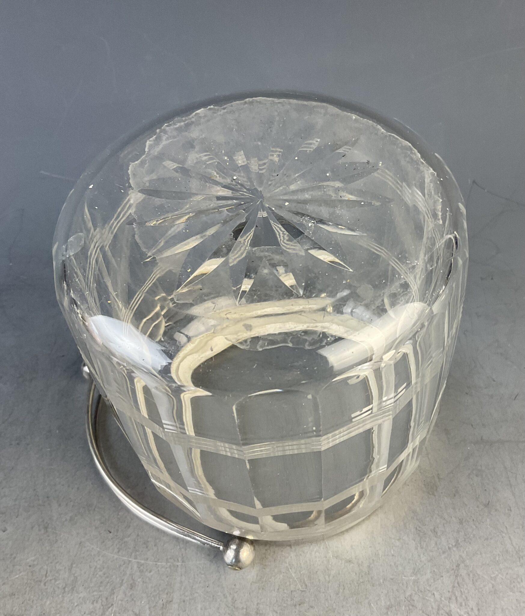 Alpacca, versilbert, farbloses, originales Glas mit Schliffdekor, runder Deckel mit runder Daumenrast, Metallmontierung mit schwenkbarem Henkel, Deckel gemarkt mit englischer Herstellermarke JD für J. Dixon, tadelloser Erhaltungszustand