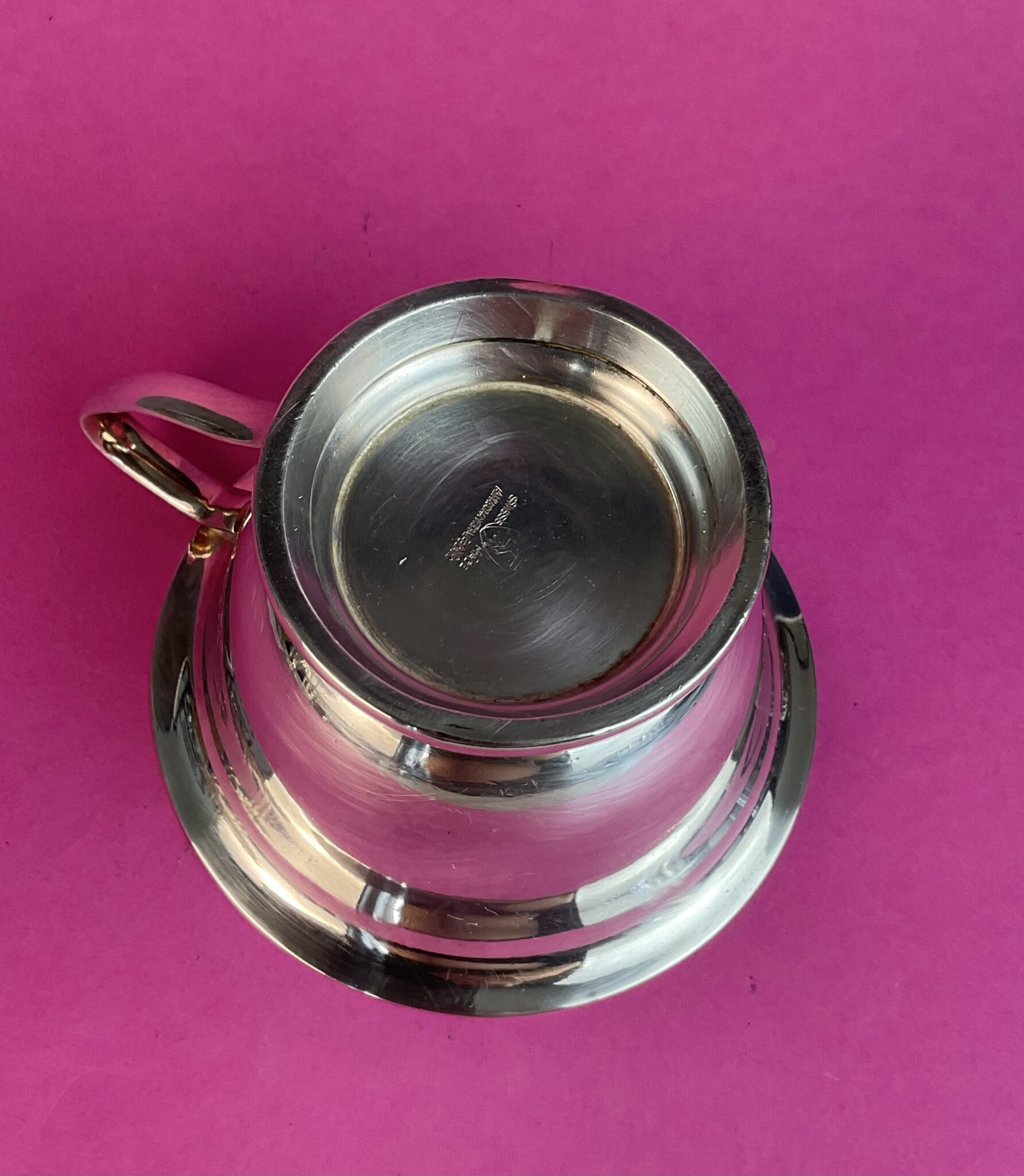 Alpacca, versilbert, abgesetzter, runder Fuss, gebauchte Schale mit kantigem Henkel, gemarkt SPRING SWISS MADE ALPACCA METAL BLANC, tadelloser Erhaltungszustand