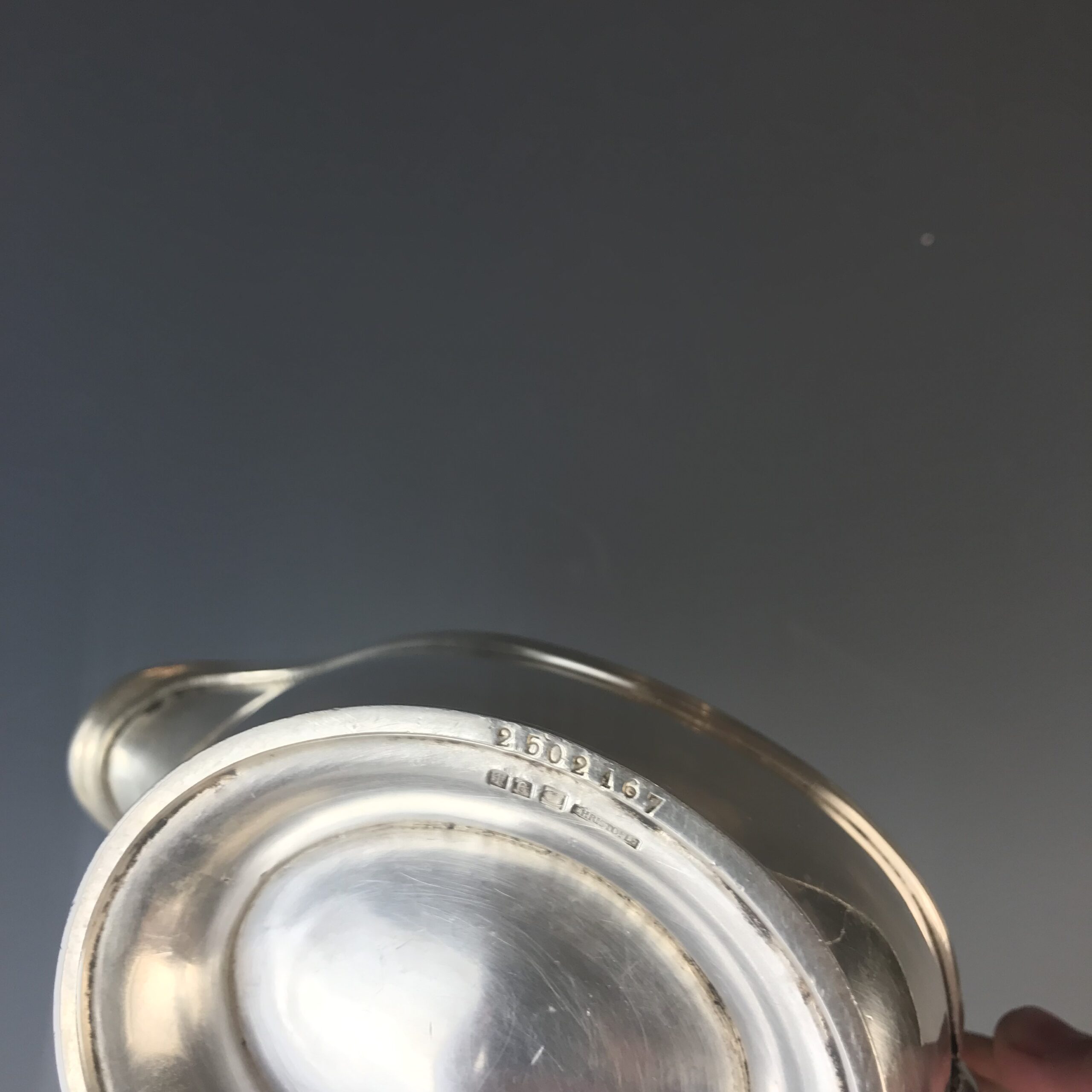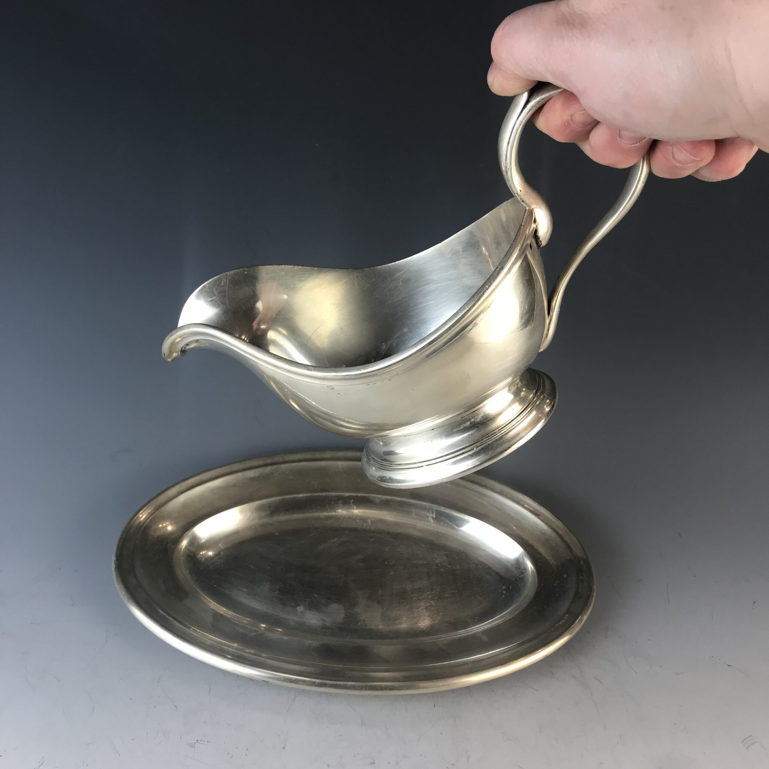 Metall, massiv versilbert, bestehend aus zwei Teilen, hochgezogener Henkel mit Daumenrast, beide Teile gemarkt CHRISTOFLE, Modellnummer Untersatz 2059327, Modellnummer Saucière 2502167