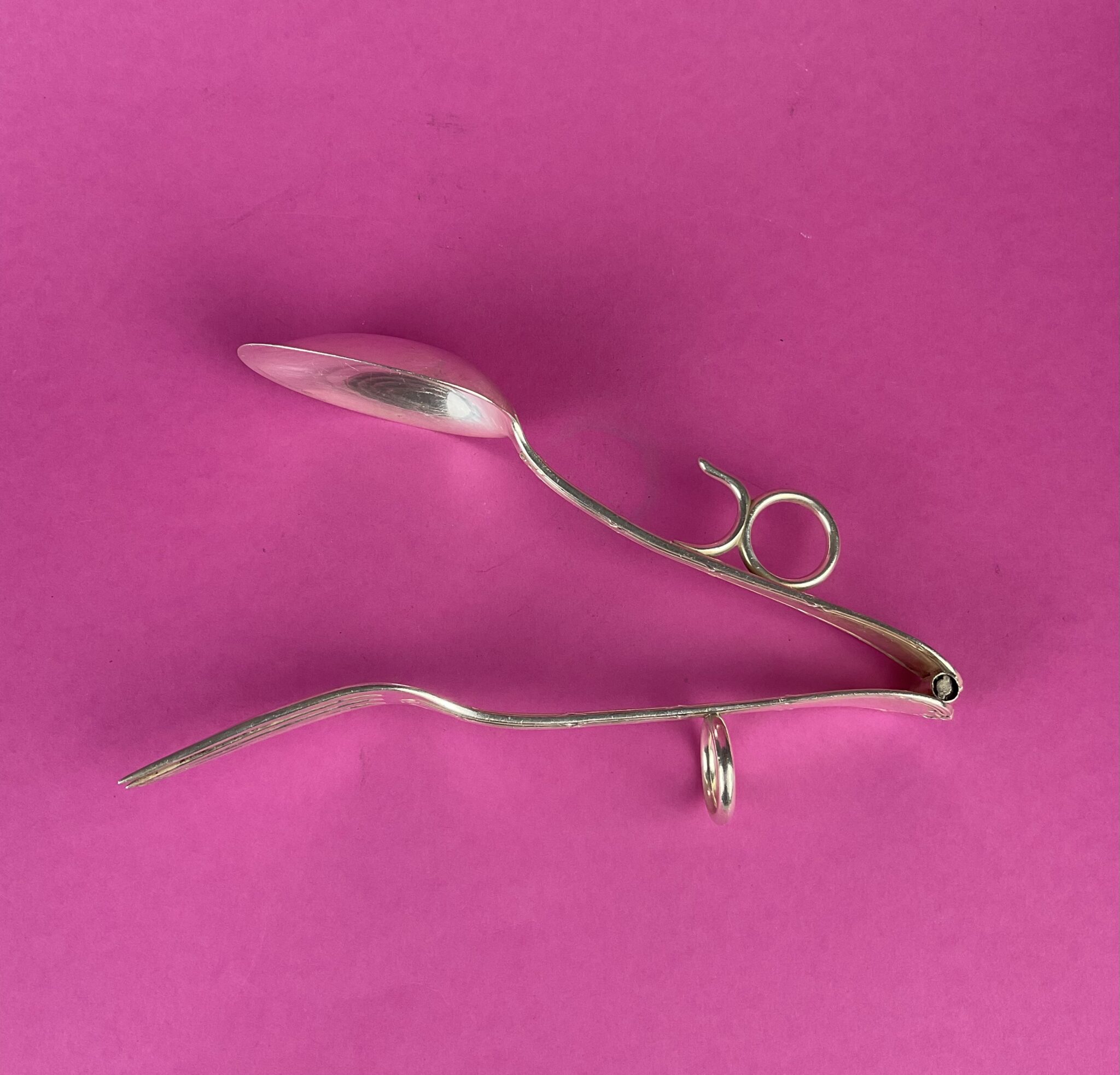 Alpacca, stark versilbert, Facon „Rubans“, Löffel und Gabel mit Scharnier und Halteringen, gemarkt mit der Firmenmarke von Christofle, Paris, handpolierter Erhaltungszustand1 Vorlegelöffel