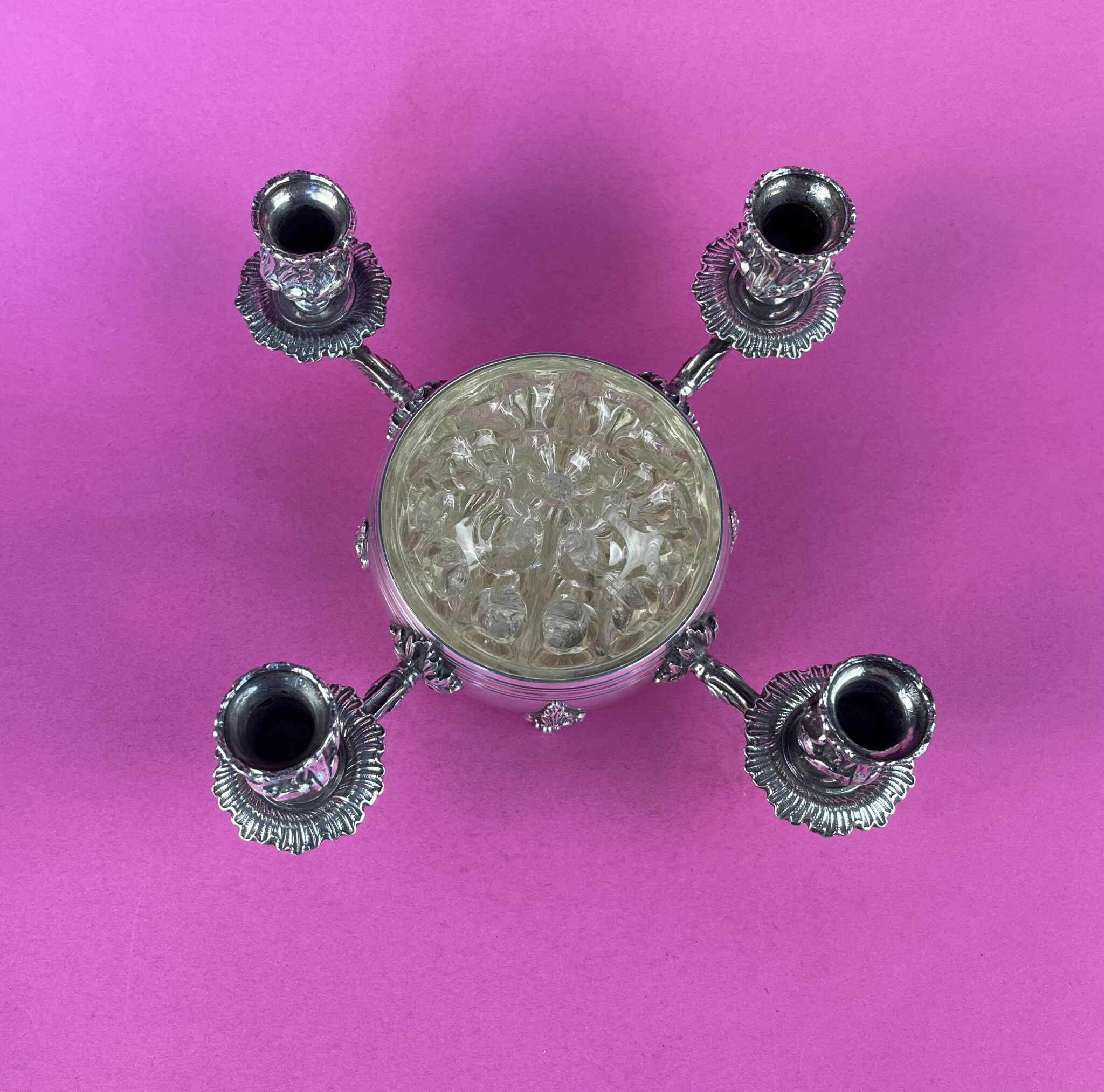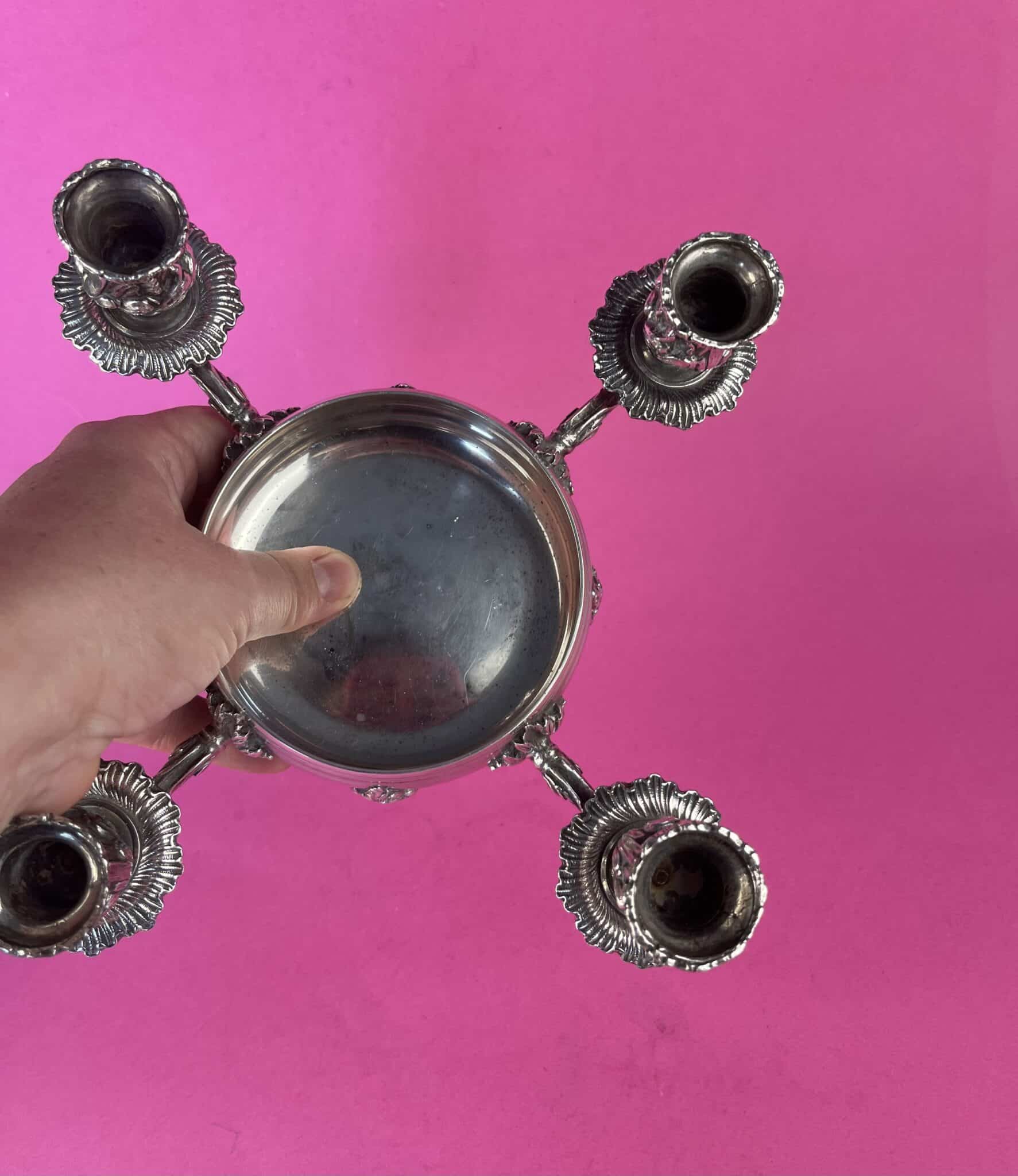 Versilberter 4 flammiger Kerzenleuchter mit „Pique fleurs“ /Blumensteckvase