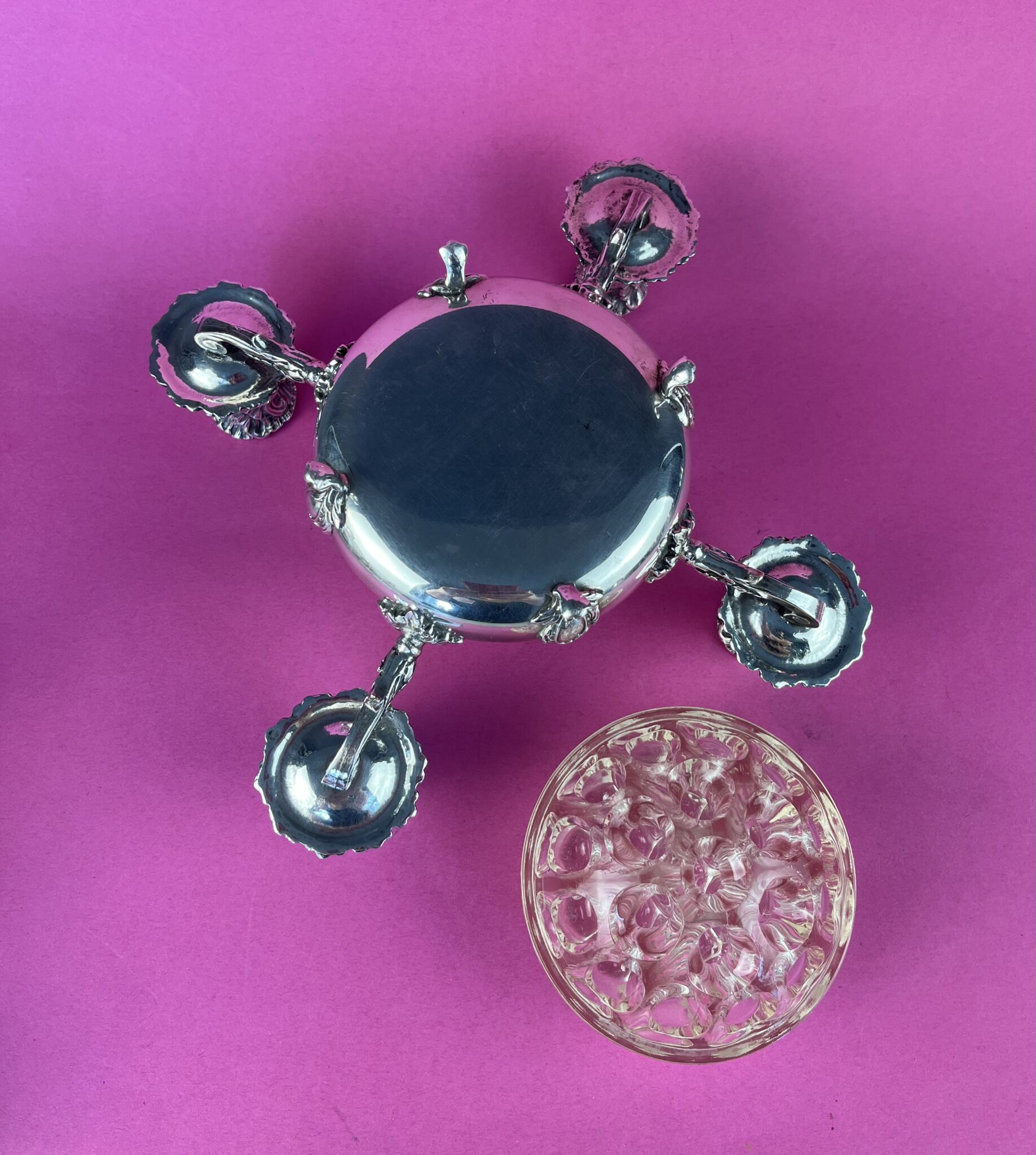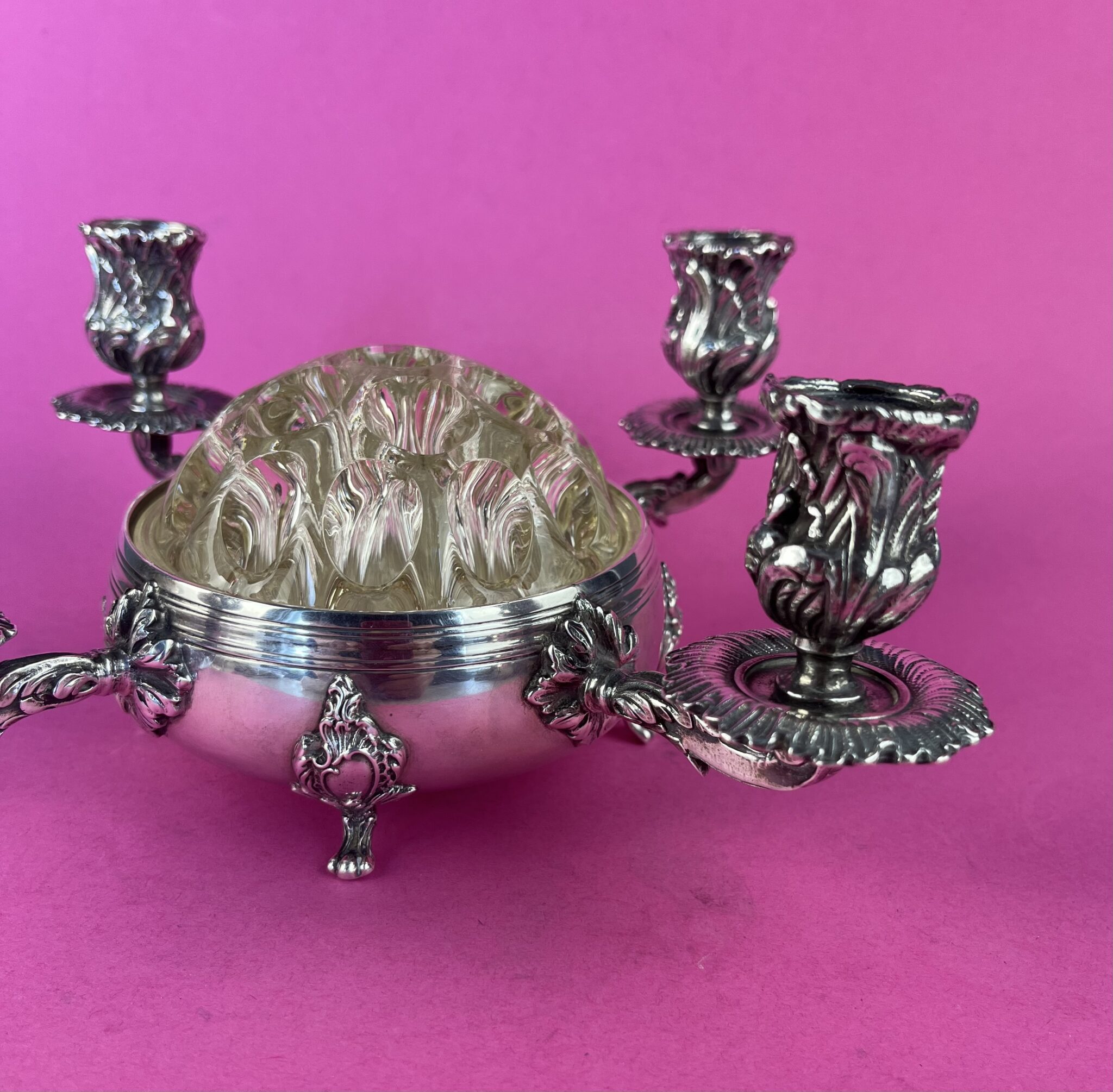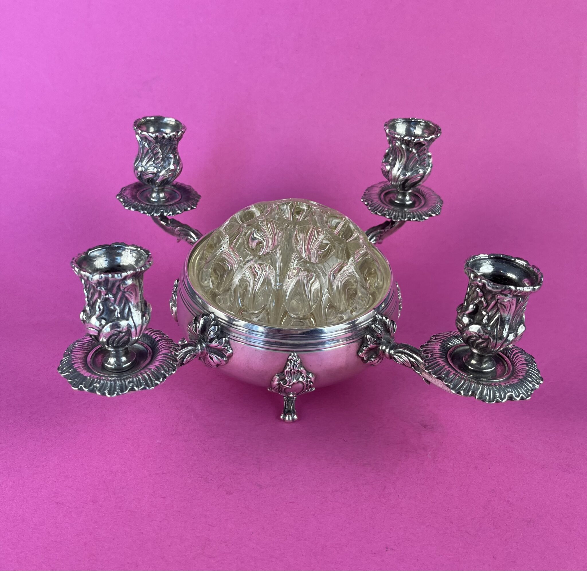 Kerzenleuchter mit vier Armen und zentraler, runder Schale aus versilberter Alpacca, Rokoko-Ornamentik, ungemarkt, runder, mundgeblasener Glaskörper mit 19 Trichtern für Blumen, gemarkt REIMS MADE IN FRANCE, tadellos erhalten