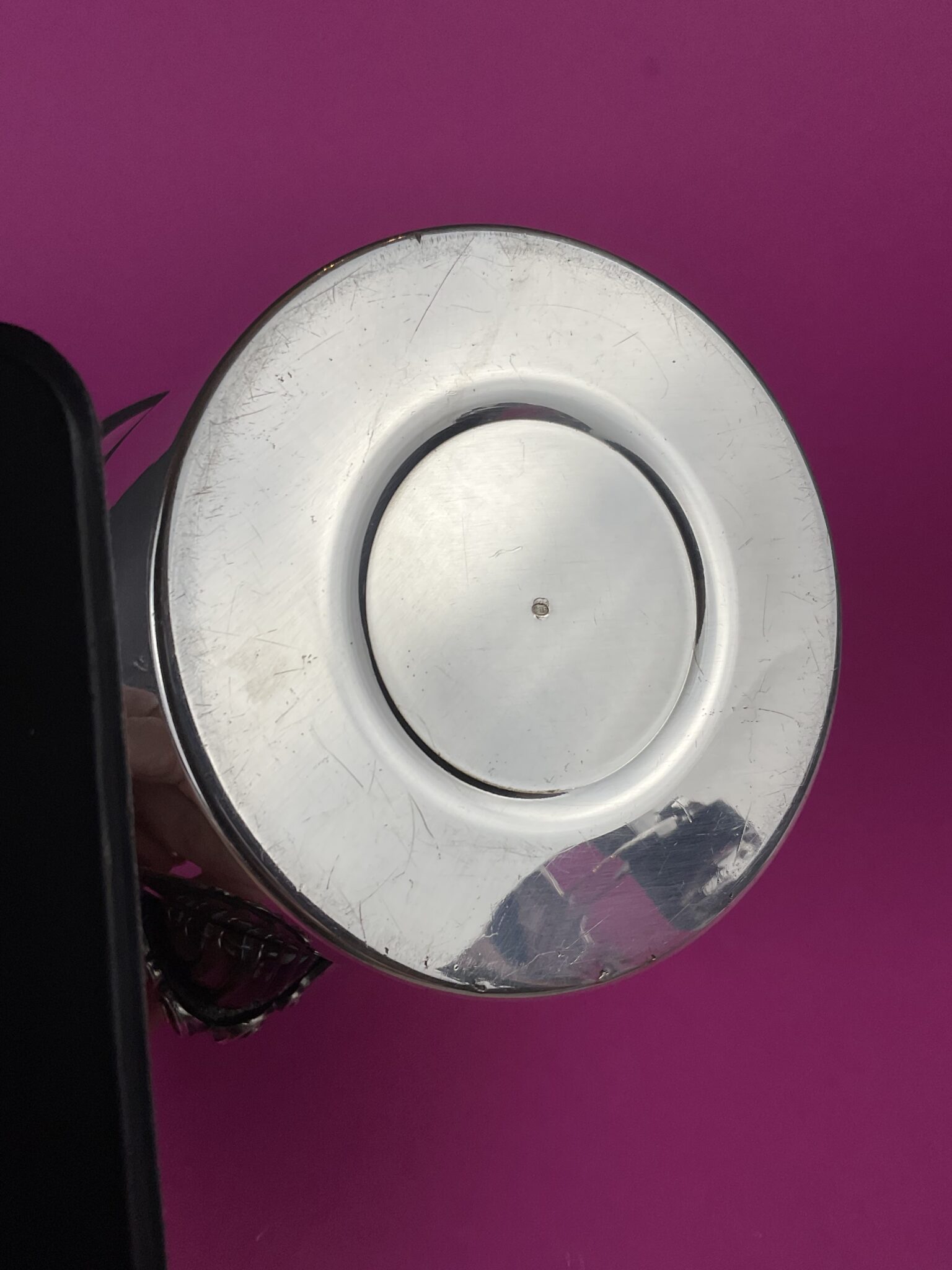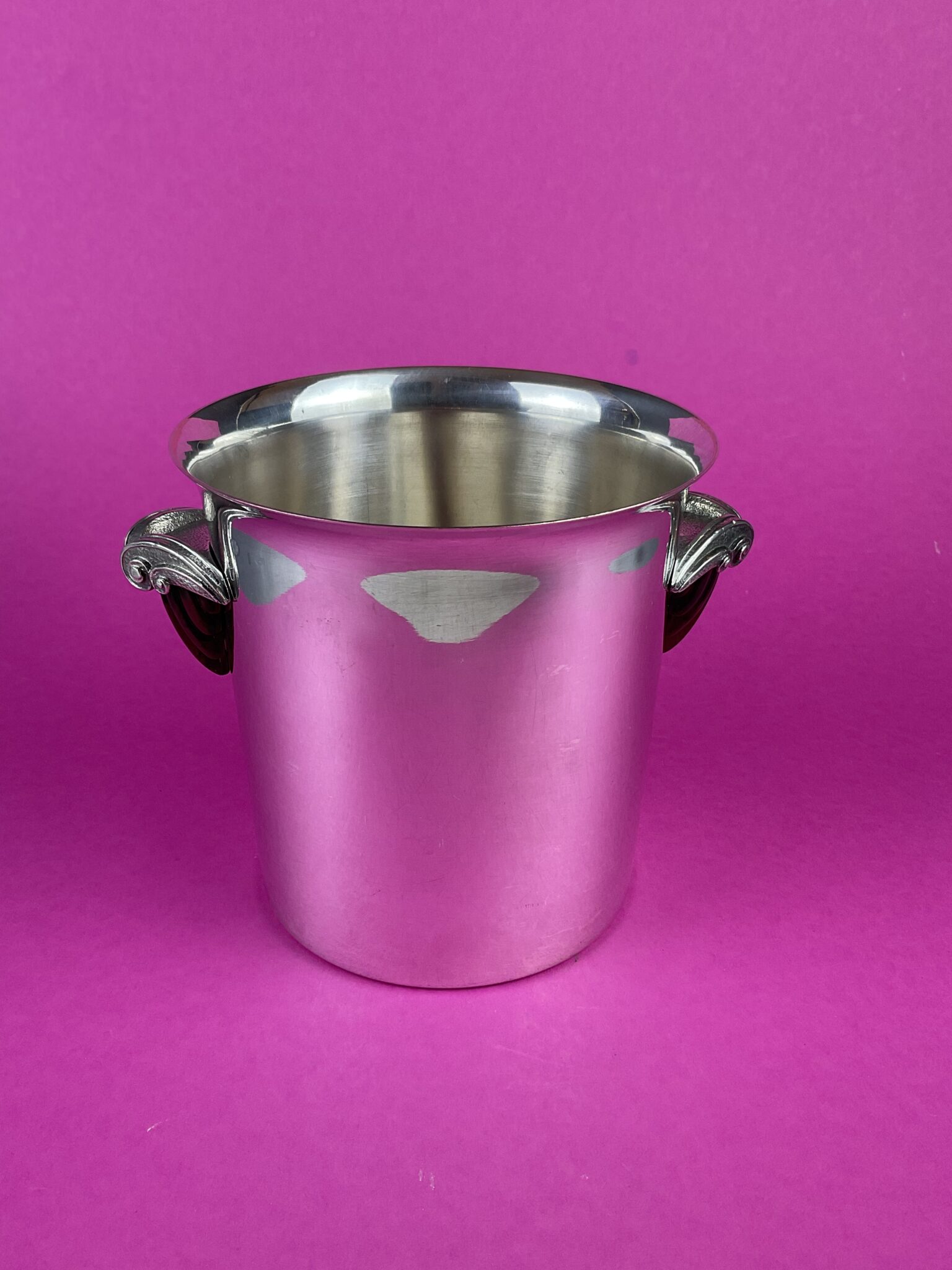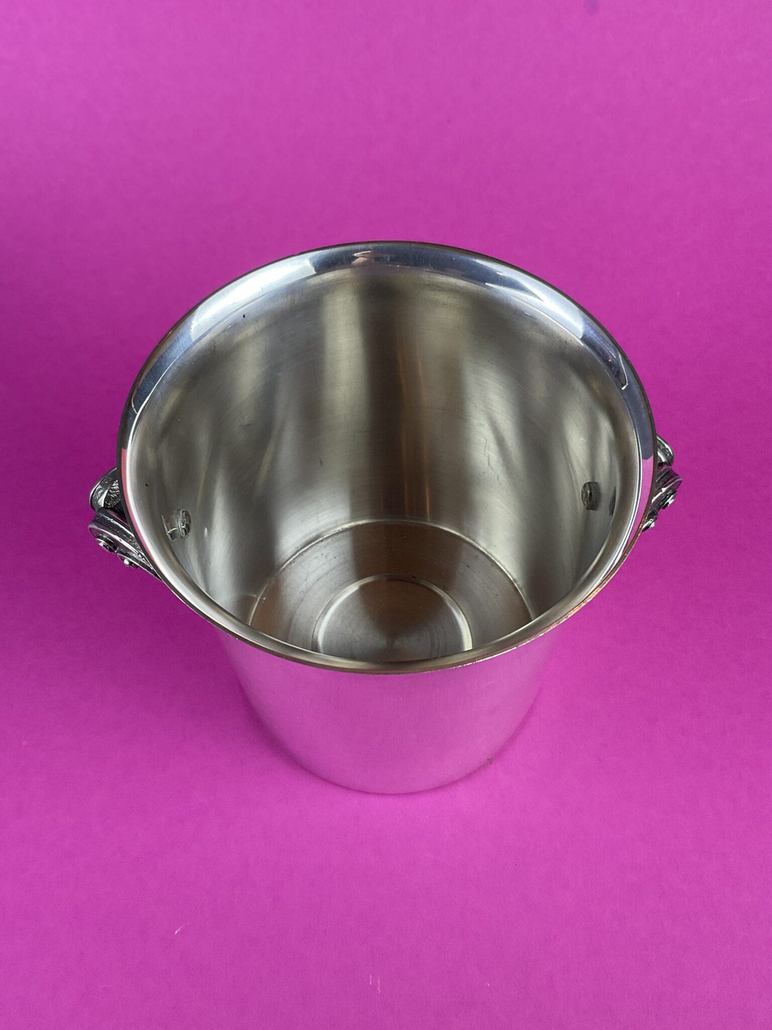 Kühler aus versilberter Alpacca, Henkel mit Bakelite, innen mit herausnehmbarem Abtropfeinsatz, gemarkt mit französischer Herstellermarke und METAL ARGENTE, fachmännisch gereinigt und handpoliert, Gebrauchsspuren