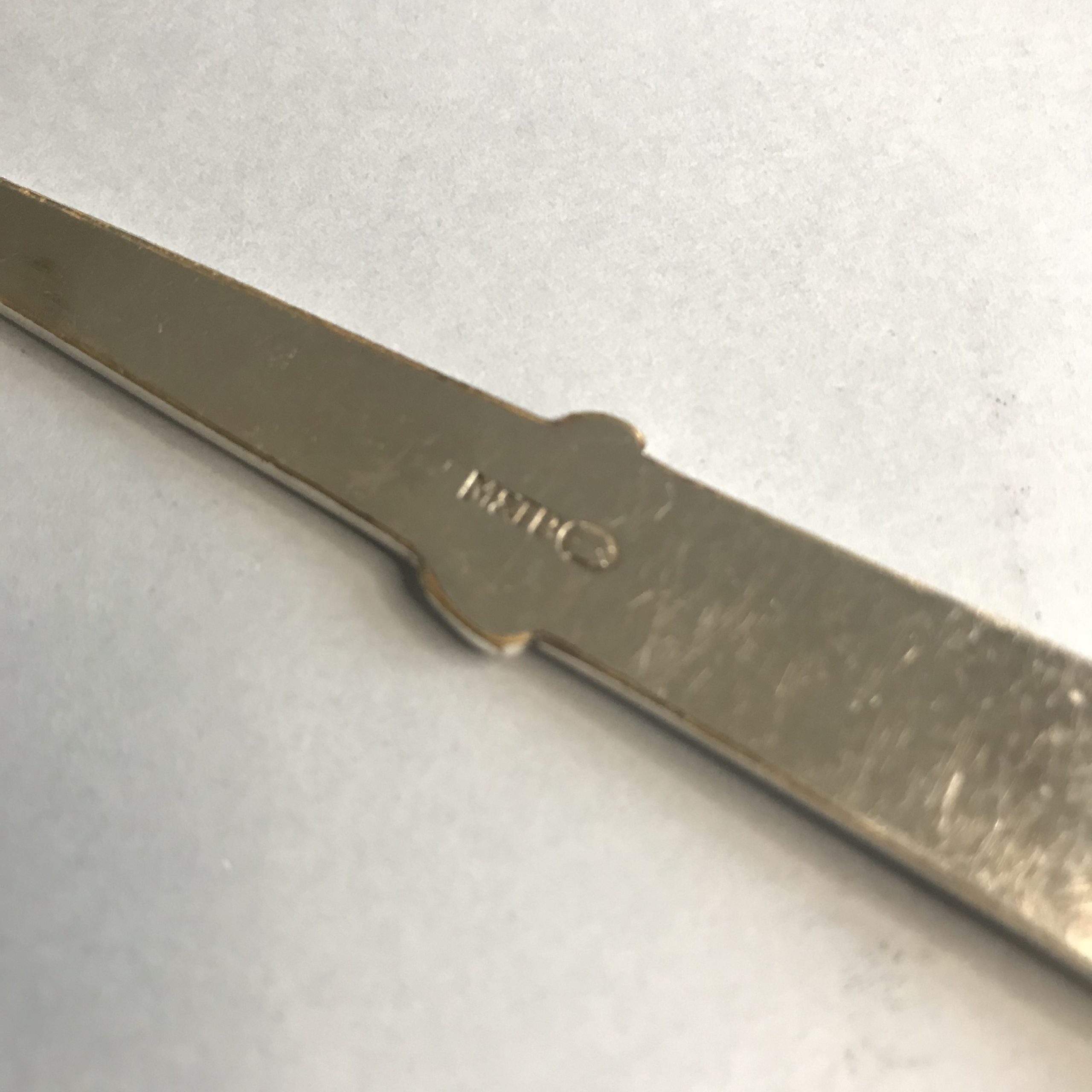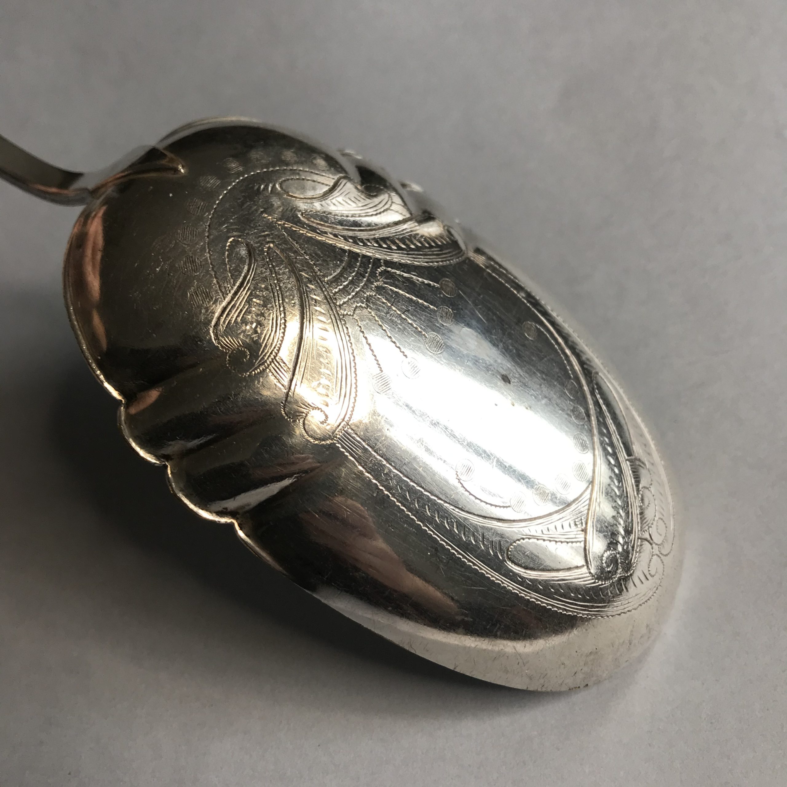 Alpacca, versilbert, Stiel mit vegetabilen Formen, Laffe rückseitig mit graviertem Dekor, gemarkt M & TB, dänische Turmmarke