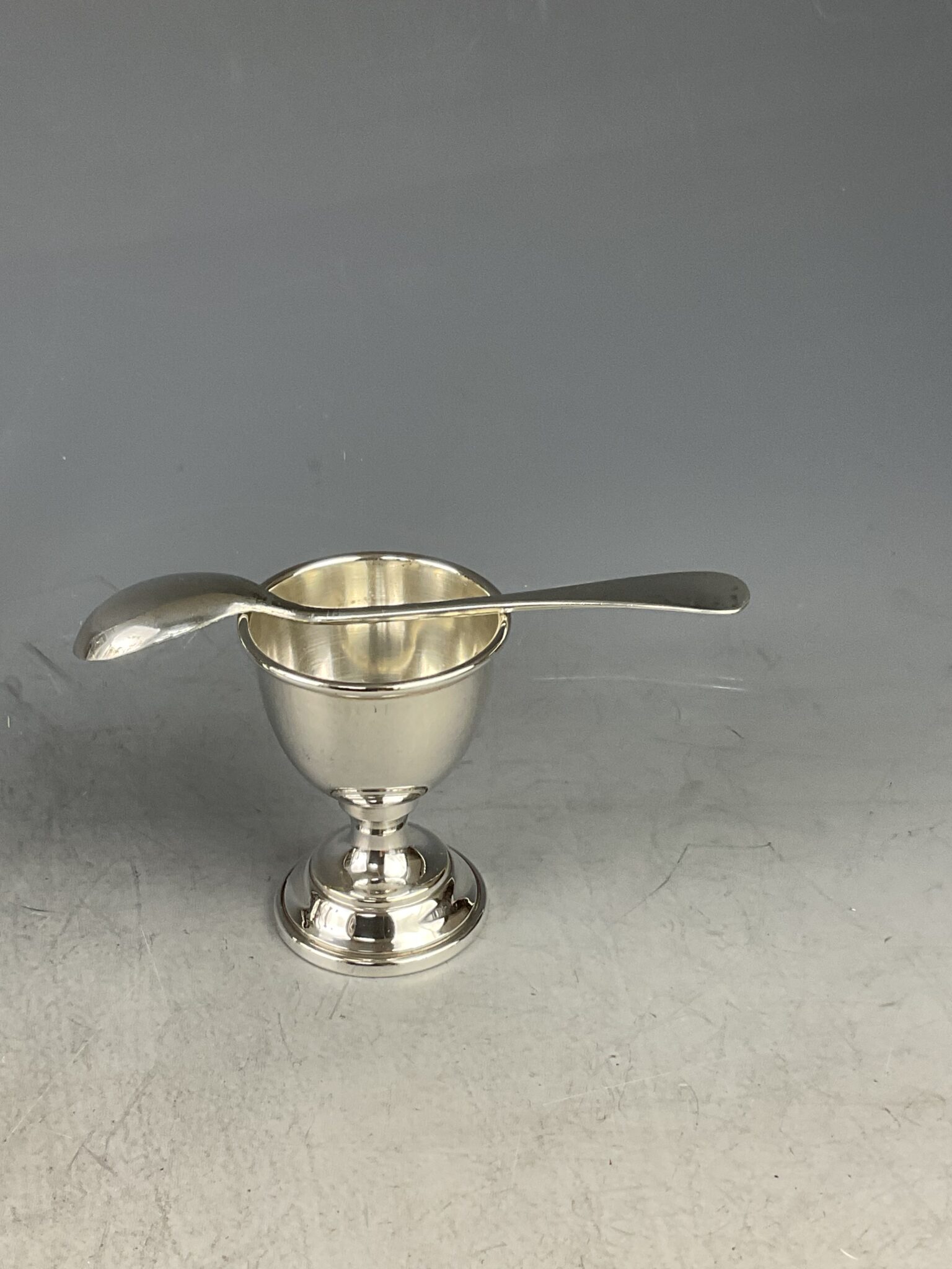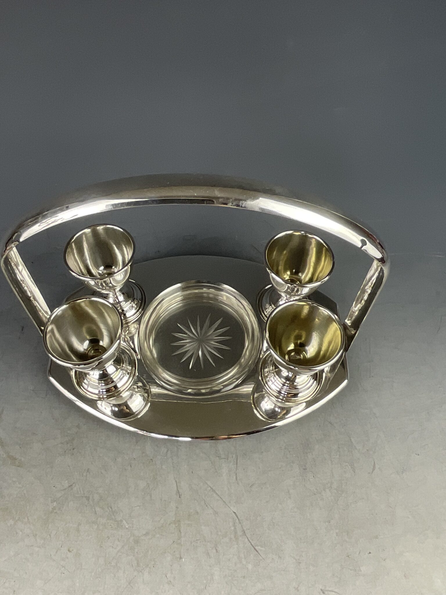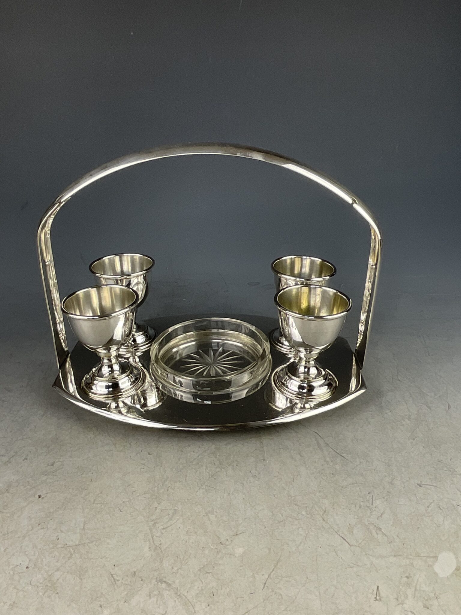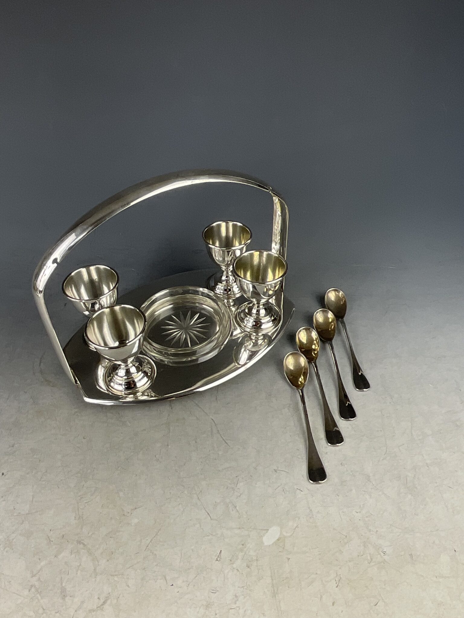Alpacca, versilbert, ovaler Ständer mit Henkel, am Henkel Öffnungen für vier Eierlöffel, 4 runde Abstellflächen für vier pokalförmige Gefäßkörper, gemarkt CH im Dreieck, handpolierter, tadelloser Erhaltungszustand