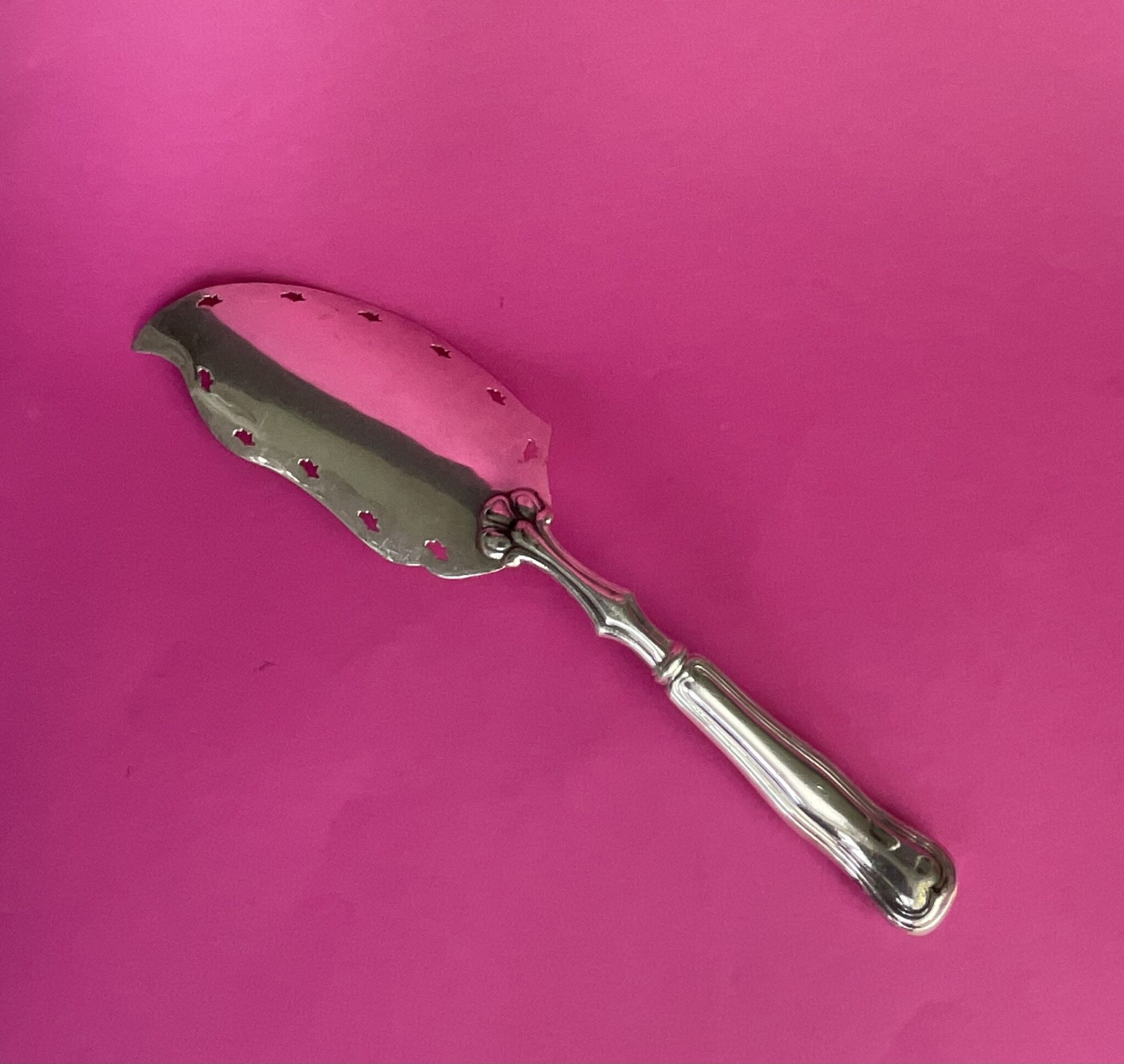 Alpacca, versilbert, Hohlheft in Augsburger Faden- Form, breite Schaufel mit fein gravierter Dekor, ein Paar in einem Boot sitzend, gemarkt mit TH. GÖHLER, tadelloser Erhaltungszustand
